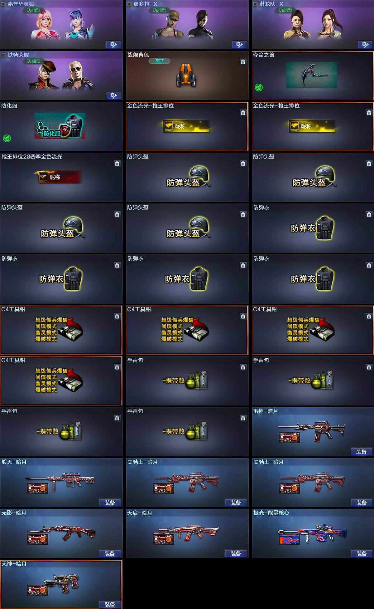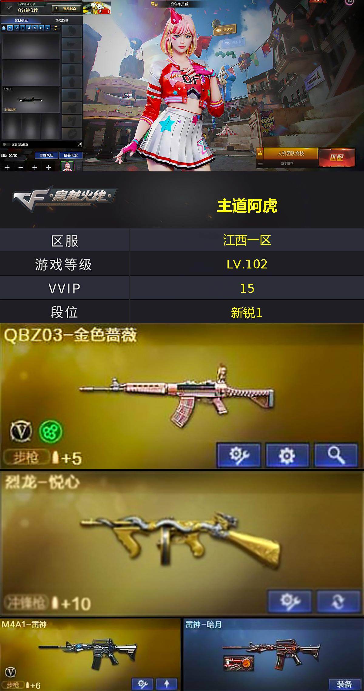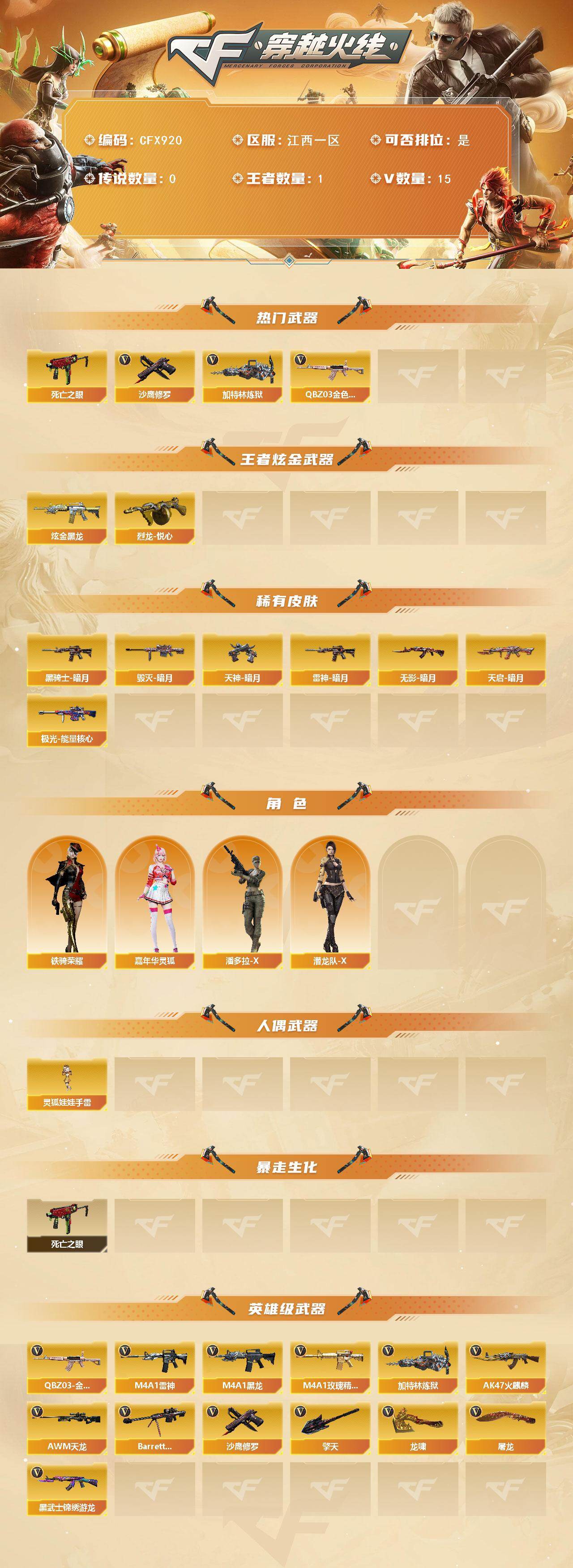 【cfx920】15v/102级/荣耀元首/1王者/1炫金/q03-金色蔷薇/死亡之眼/加特林-炼狱/沙鹰-修罗/烈龙-悦心/炫金黑龙/雷神-暗月/毁灭-暗月/黑骑士-暗月/无影-暗月/天启-暗月/极光-能量核心/天神-暗月/嘉年华灵狐/潘多拉-x/潜龙队-x/铁骑荣耀/灵狐娃娃手蕾/ak47-火麒麟/m4a1-黑龙/m4a1-雷神/黑武士-锦绣游龙/m4a1-玫瑰精灵/awm-天龙/barrett-毁灭/屠龙/龙啸/擎天/战舰背包/夺命之镰/防化服/金色流光-呛王排位/呛王排位28赛季金色流光/防弹头盔/防弹衣/c4工具钳/手蕾包