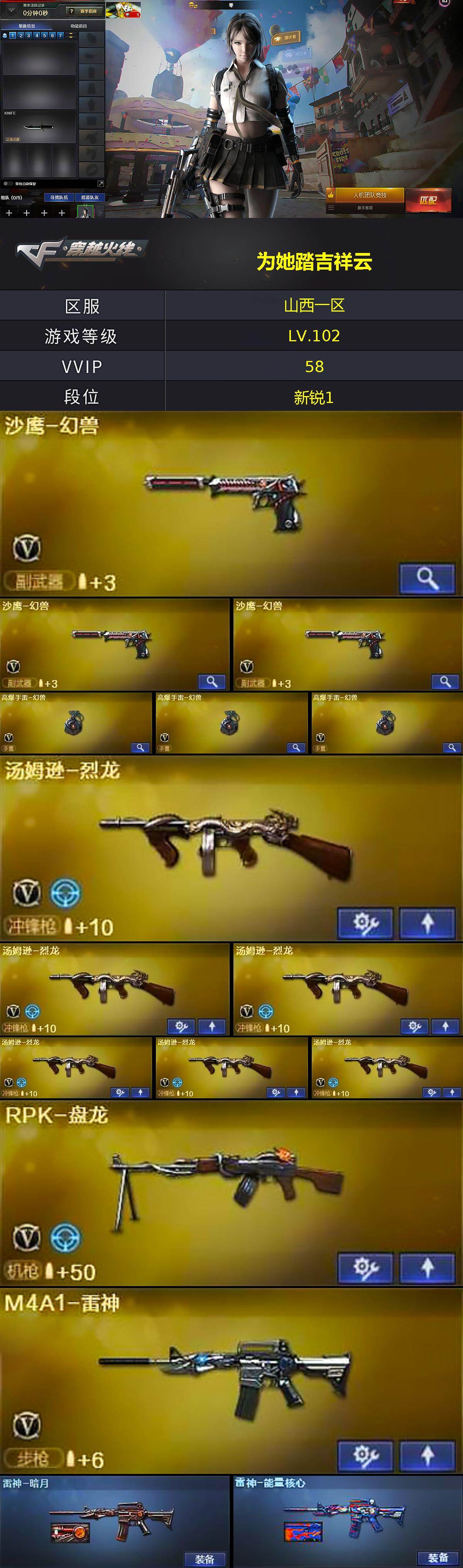山西一区-57v-2王者-1炫金 【热门武器】:死亡之眼2,c.a.t,汤姆逊-烈龙6,rpk-盘龙,沙鹰-修罗3,高爆手蕾-幻兽3 【王者炫金武器】:王者之光,炫金武士 【皮肤】:雷神-暗月,雷神-能量核心,火麒麟-心动糖果,毁灭-暗月,毁灭-英雄计划 皮肤,m4a1-千变-孔明皮肤,黑龙-能量核心,黑骑士-暗月,无影-能量核心,天启-暗月2,战神-紫绶金章皮肤,战神-流金岁月皮肤