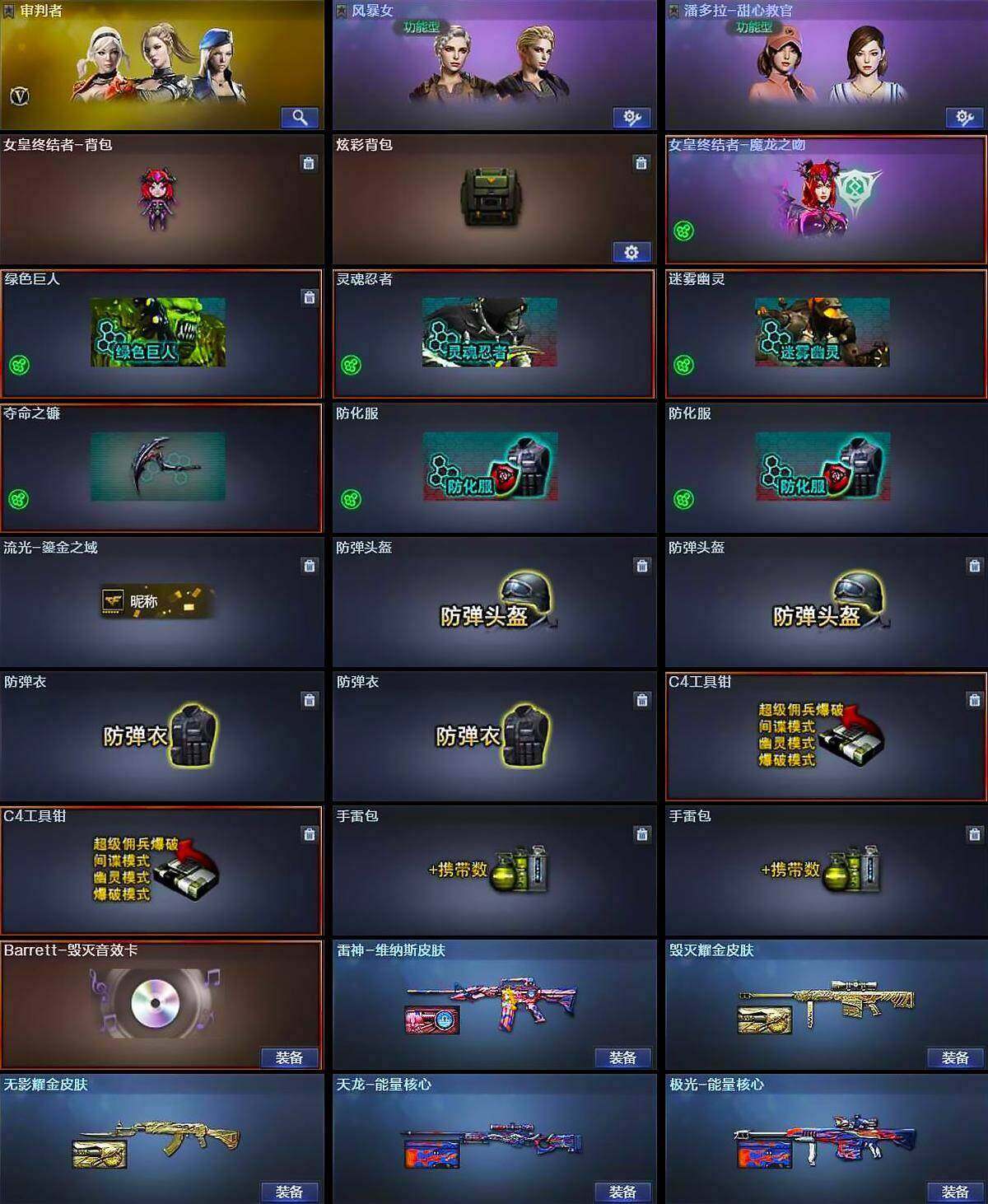 [15660877]【编号80812,可秒换绑】【店长推荐捡漏号!毁灭三件套各种基础v!!】,重庆一区-27v-0王者-0炫金 【热门武器】:加特林-炼狱,沙鹰-修罗2 【音效卡】:barrett-毁灭音效卡 【皮肤】:雷神-维纳斯皮肤,毁灭耀金皮肤,毁灭-英雄计划 皮肤,无影耀金皮肤,天龙-能量核心,极光-能量核心,龙啸-青青莓果 皮肤 【角色】:审判者,风暴女,潘多拉-甜心教官 【人偶武器】:awm-灵狐-15周年嘉年华 【英雄级武器】:ak47-麒麟2,m4a1-雷神,ak47-无影,m4a1-死神,m4a1-武圣,m4a1-龙血,m4a1-玫瑰精灵,awm-天龙,barrett-毁灭,barrett-极光2,加特林-炼狱,沙鹰-修罗2,沙鹰-天神2,glock18-武圣,屠龙3,龙啸3,擎天,麒麟刺 【道具】:女皇终结者-背包,炫彩背包,女皇终结者-魔龙之吻,绿色巨人,灵魂忍者,迷雾幽灵,夺命之镰,防化服2,流光-鎏金之域,防弹头盔2,防弹衣2,c4工具钳2,手蕾包2 【特殊呛械】:1炼狱 【稀有套装】:毁灭三件套