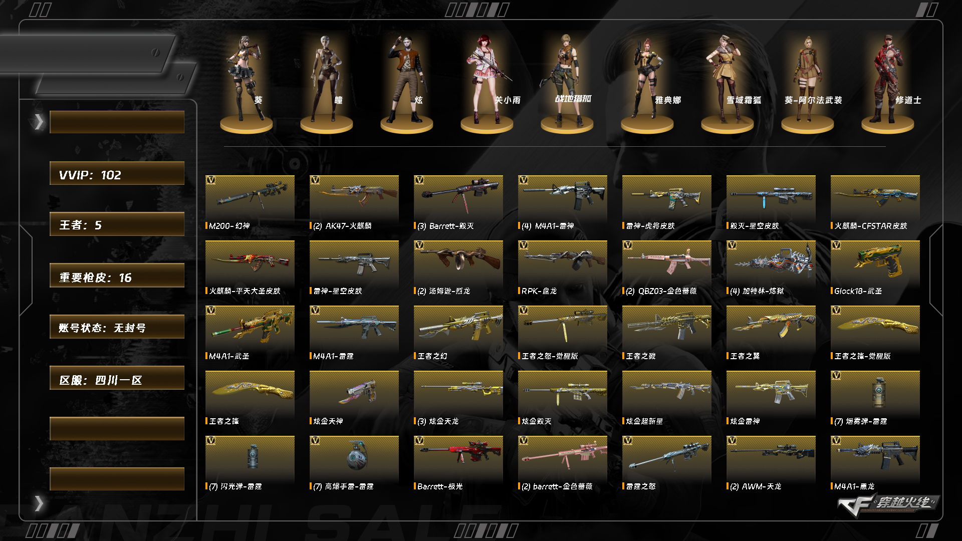 abc11005/西部/四川一区/钱包注销/可排位/可二次/掌火id:/100v/幻神/雷霆套/5炼狱/4修罗/q金色蔷薇/天龙/毁灭/极光/雷神/火麒麟/黑龙/【四防未开】/关小雨/【角色】/葵/瞳/炫/零纪元/战地猎狐/葵阿尔法武装/修道士/雪域霜狐/【音效卡】/毁灭音效卡