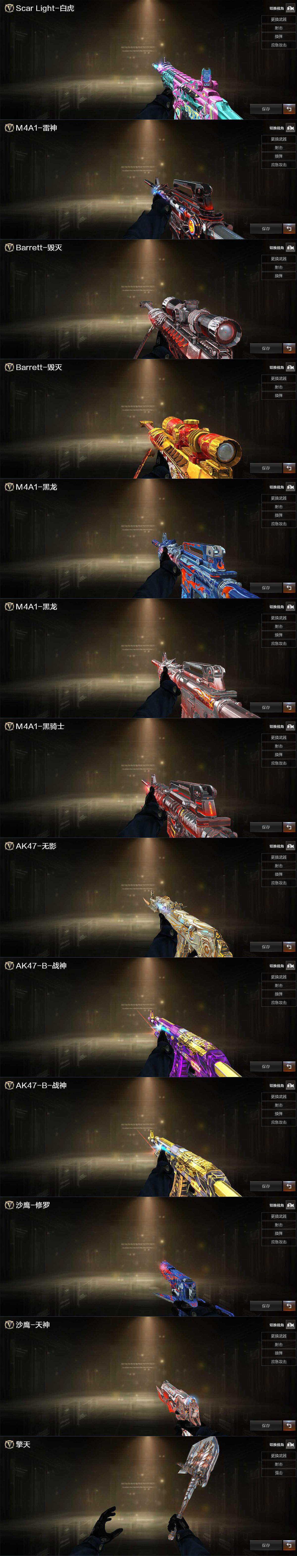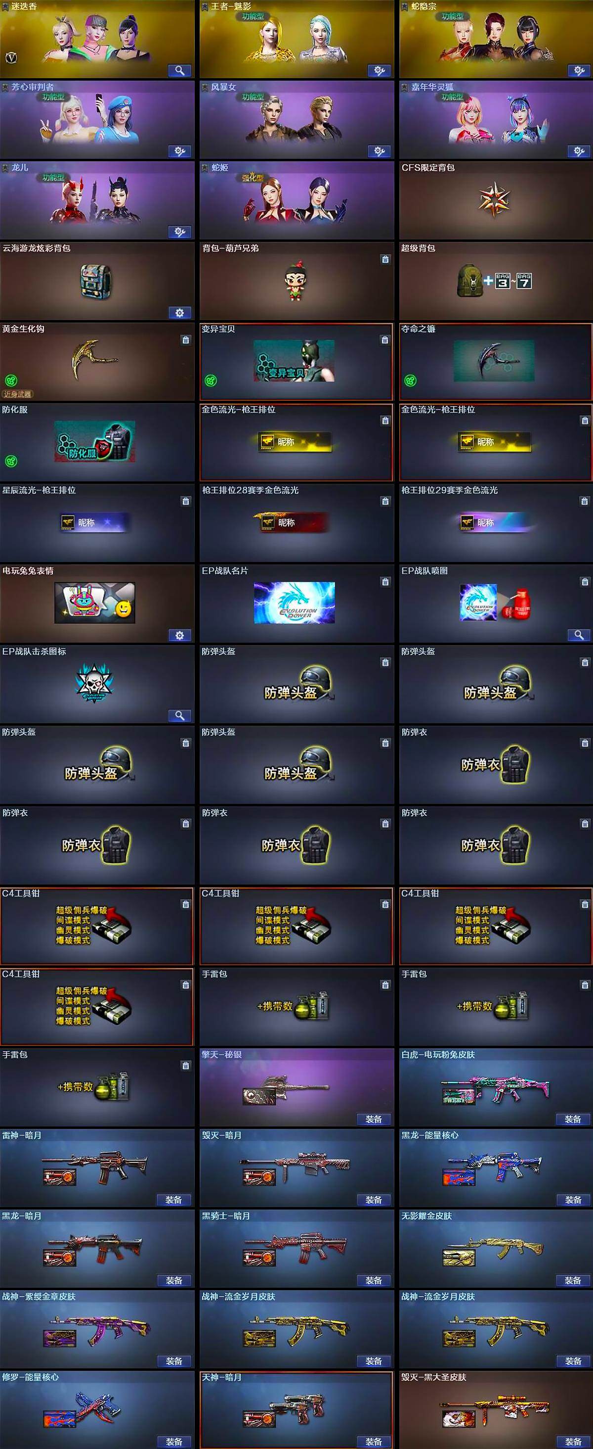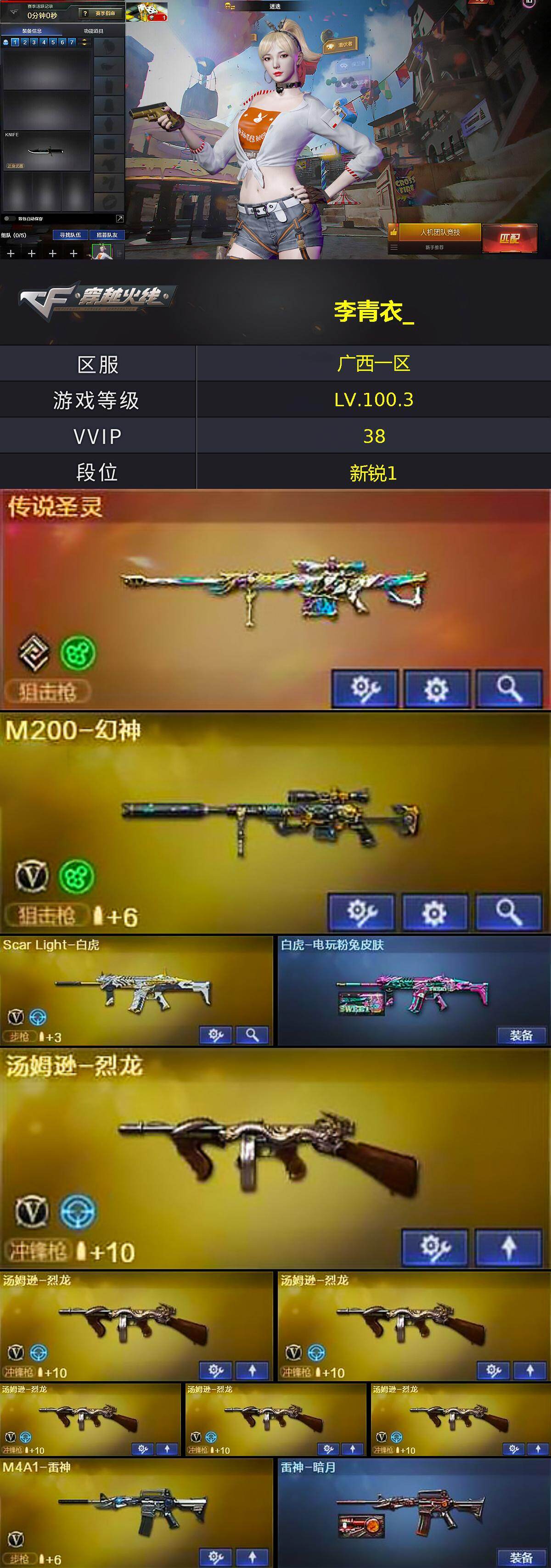 广西一区-36v-4王者-1炫金 【传说武器】:传说圣灵 【热门武器】:传说圣灵,scar light-白虎,m4a1-青龙,m200-幻神,m4a1-黑骑士,汤姆逊-烈龙6,加特林-炼狱,斯泰尔-蝴蝶,沙鹰-修罗,金刚伞 【王者炫金武器】:王者之城,天启-悦智,王者雷怒,炫金火麒麟 【皮肤】:白虎-电玩粉兔皮肤,雷神-暗月,毁灭-暗月,毁灭-黑大圣皮肤,黑龙-能量核心,黑龙-暗月,黑骑士-
