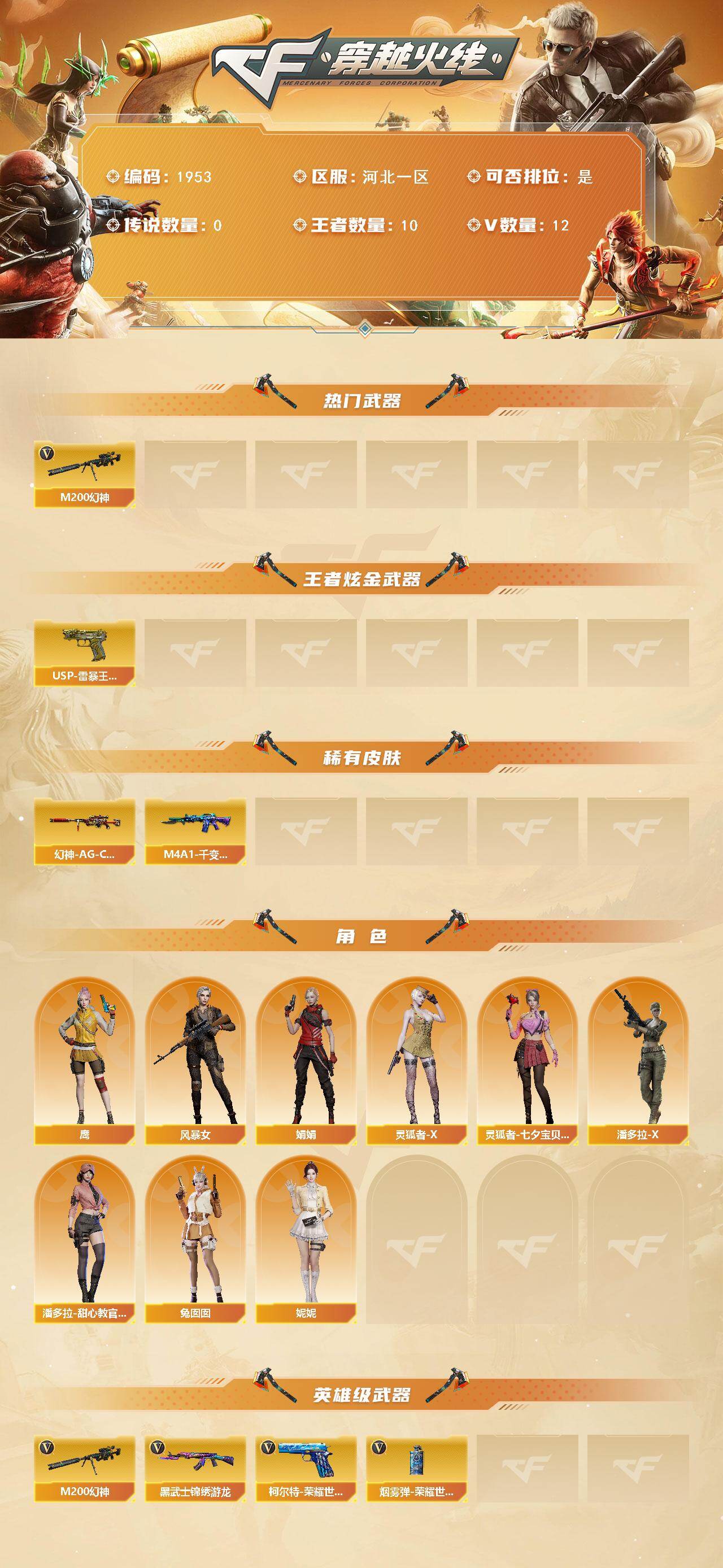 【1953】特65432可排位-可二次【河北一区/12v/vip1】【纯白无封号/妮妮角色/幻神带皮肤/2把ep柯尔特usp雷暴王者】【m200-幻神/幻神-ag-cfpls17冠军】【usp-雷暴王者】【鹰】【hk417-朱雀-电竞之星】【屠龙-电竞之星】【黑武士-锦绣游龙】【m4a1-千变-孔明皮肤】【兔囡囡/娟娟/潘多拉-x/救世主-x】【colt1911-小故障2/柯尔特-萌杀/新usp-呛王排位奖励2】【斯泰尔-巧克力】【高爆手蕾-雷暴王者4/闪光丹-雷暴王者3/盐雾蛋-雷暴王者2】【防弹头盔2/防弹衣2/c4工具钳2/手蕾包2/防化服2】截图展示段位不代表实际段位,如赛季更新等不/拒因素发生变化、时限道具不保证所剩时间