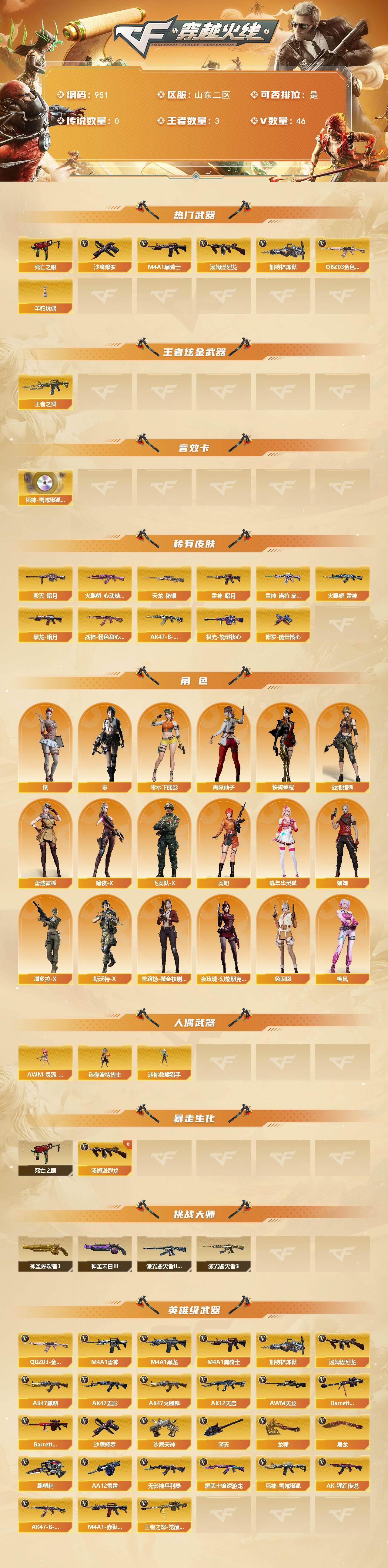 [15709889]山东二区-46v-3王者-0炫金 【热门武器】:q03-金色蔷薇,死亡之眼,m4a1-黑骑士,汤姆逊-烈龙6,加特林-炼狱,羊驼玩偶,沙鹰-修罗5 【王者炫金武器】:王者之戮 【音效卡】:死神-雪域霜狐-怀旧音效卡 【皮肤】:雷神-暗月,雷神-诺拉 皮肤,火麒麟-雷神,火麒麟-心动糖果,毁灭-暗月,黑龙-暗月,战神-粉色甜心皮肤,ak47-b-常胜将军-刘备,天龙-秘银,极光-能量核心,修罗-能量核心 【角色】:零,樱,战地猎狐,雪域霜狐,暗夜-x,飞虎队-x,虎妞,嘉年华灵狐,疾风,娟娟,零-水下丽影,潘多拉-x,青霞仙子,斯沃特-x,铁骑荣耀,兔囡囡,雪莉杨-摸金校尉,夜玫瑰-幻能朋克 【人偶武器】:迷你救赎猎手,awm-灵狐-15周年嘉年华,迷你波特博士 【暴走生化】:死亡之眼 【挑战大师】:神圣爆裂者iii,激光毁灭者iii-白马银呛,激光毁灭者iii,神圣爆裂者-末日iii 【英雄级武器】:ak47-火麒麟2,ak47-麒麟,m4a1-黑龙,m4a1-雷神,m4a1-黑骑士,ak47-无影2,ak12-天启,无影-神兵利器,黑武士-锦绣游龙,死神-雪域霜狐,q03-金色蔷薇,ak-47-猩红传说,ak47-b-战神,awm-天龙,barrett-毁灭,barrett-极光,王者之怒-觉醒版,加特林-炼狱,汤姆逊-烈龙6,aa-12-雷霆,沙鹰-修罗5,沙鹰-天神,屠龙4,龙啸,擎天,麒麟刺,m4a1-赤狱骑士 【道具】:全能呛王背包,奇洋探员-海龟背包,战舰背包,炫彩背包,超级背包,雪域霜狐炫彩背包,女皇终结者-魔龙之吻,救世主-黑桃战神,黄金生化钩,绿色巨人,灵魂忍者,变异宝贝,迷雾幽灵,生化弹匣,夺命之镰,防化服3,金色流光-呛王排位2,星辰流光-呛王排位,巅峰赛先锋-金色流光,呛王排位28赛季金色流光,呛王排位29赛季金色流光,语音特效-怀旧,雪域霜狐表情,防弹头盔3,防弹衣3,c4工具钳3,手蕾包3 【特殊呛械】:1黑骑士,6烈龙,1炼狱
