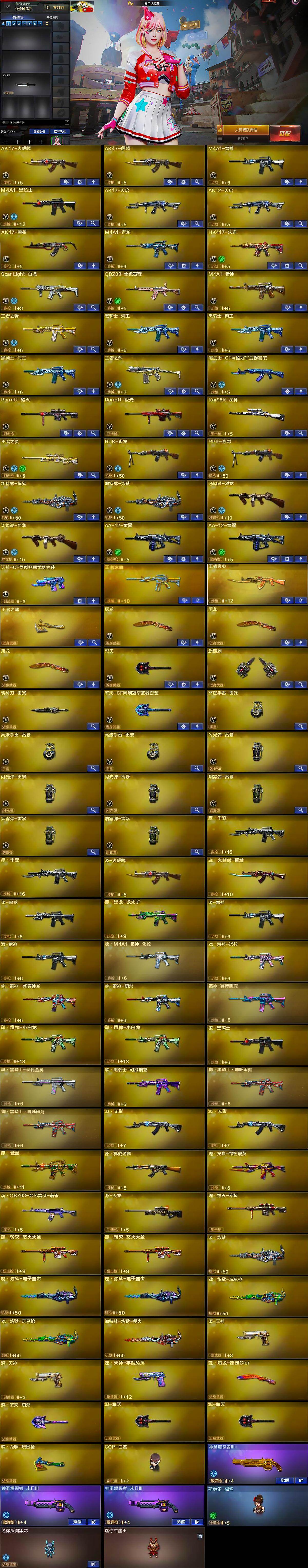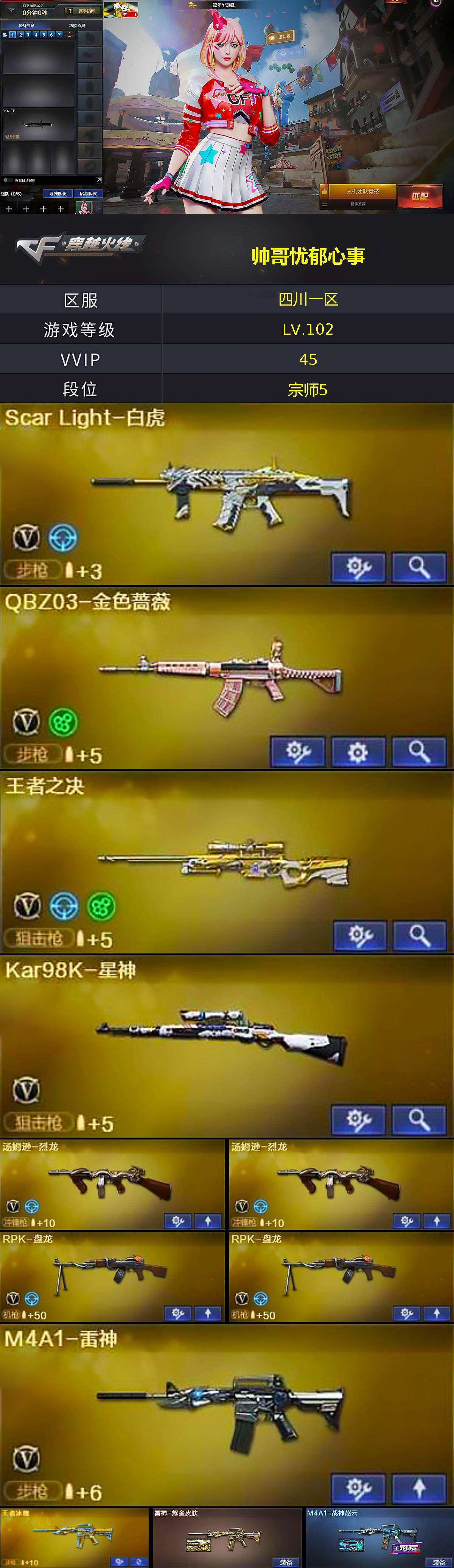 四川一区-44v-6王者-0炫金 【热门武器】:q03-金色蔷薇,scar light-白虎,hk417-朱雀,m4a1-青龙,王者炎心,kar98k-星神,m4a1-黑骑士,汤姆逊-烈龙2,rpk-盘龙2,加特林-炼狱2,斯泰尔-蝴蝶,cop-白鲨 【王者炫金武器】:王者冰魄,王者炎心,王者之啸 【音效卡】:m4a1-黑骑士音效卡 【皮肤】:雷神-耀金皮肤,m4a1-战神赵云,火麒
