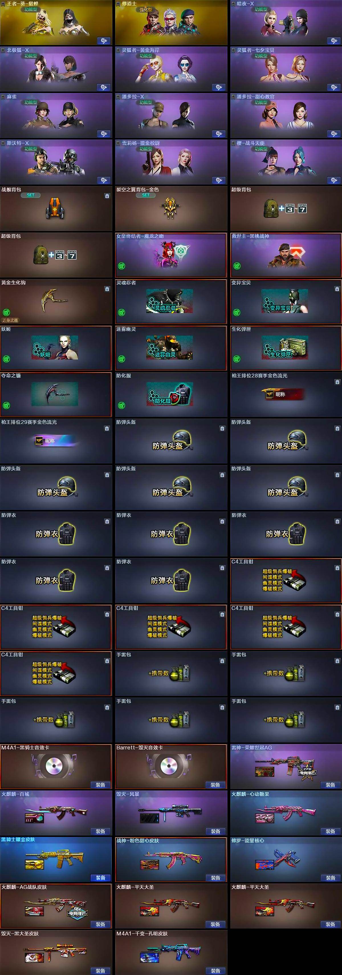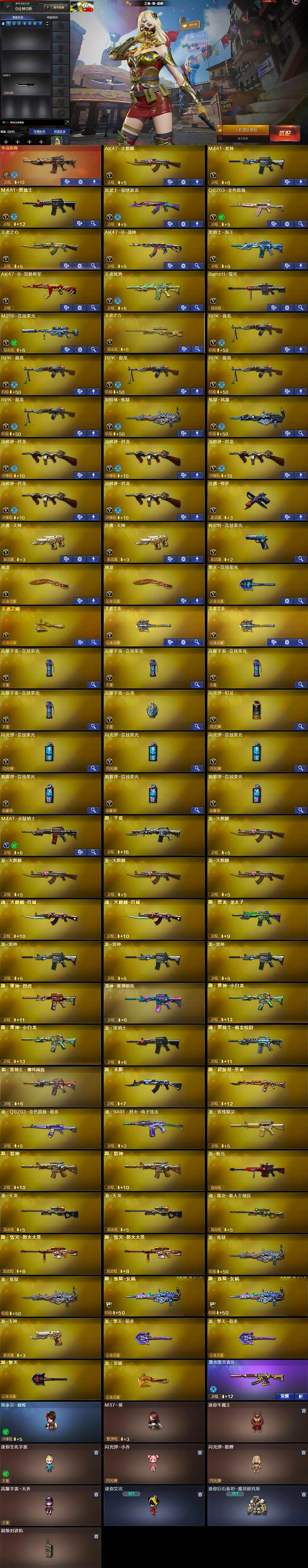 [15714320]河北一区-47v-6王者-0炫金 【传说武器】:传说暗裔 【热门武器】:传说暗裔,q03-金色蔷薇,m200-竞技荣光,m4a1-黑骑士,汤姆逊-烈龙5,rpk-盘龙5,加特林-炼狱,斯泰尔-蝴蝶,沙鹰-修罗 【音效卡】:m4a1-黑骑士音效卡,barrett-毁灭音效卡 【皮肤】:雷神-荣耀世冠ag,火麒麟-ag战队皮肤,火麒麟-平天大圣2,火麒麟-百城,火麒麟-心动糖果,毁灭-黑大圣皮肤,毁灭-风暴,m4a1-千变-孔明皮肤,黑骑士耀金皮肤,战神-粉色甜心皮肤,ak47-b-常胜将军-曹操,ak47-b-常胜将军-刘备,ak47-b-常胜将军-孙权2,修罗-能量核心 【角色】:王者-葵-貂蝉,修道士,暗夜-x,北极狐-x,灵狐者-黄金海岸,灵狐者-七夕宝贝,麻雀,潘多拉-x,潘多拉-甜心教官,邱刚敖,斯沃特-x,雪莉杨-摸金校尉,樱-战斗天使 【人偶武器】:斯泰尔-蝴蝶,m37-葵,迷你牛魔王,迷你生化手蕾,闪光丹-小乔,闪光丹-貂蝉,高爆手蕾-大乔,迷你艾比,迷你巨石泰坦-魔花研究所 【暴走生化】:超级对讲机 【挑战大师】:激光毁灭者iii 【英雄级武器】:ak47-火麒麟,m4a1-雷神,m4a1-黑骑士,黑武士-锦绣游龙,q03-金色蔷薇,王者之心-觉醒版,ak47-b-战神,黑骑士-海王,ak47-b-常胜将军,王者风势-觉醒版,barrett-毁灭,m200-竞技荣光,王者之力-觉醒版,rpk-盘龙5,加特林-炼狱,炼狱-风暴,汤姆逊-烈龙5,沙鹰-修罗,沙鹰-天神2,柯尔特-竞技荣光,屠龙2,擎天-竞技荣光,王者之啸-觉醒版,王者之击-觉醒版2,高爆手蕾-竞技荣光4,高爆手蕾-云龙,闪光丹-幻灵,闪光丹-竞技荣光3,盐雾蛋-竞技荣光3,m4a1-赤狱骑士 【道具】:战舰背包,裂空之翼背包-金色,超级背包2,女皇终结者-魔龙之吻,救世主-黑桃战神,黄金生化钩,灵魂忍者,变异宝贝,妖姬,迷雾幽灵,生化弹匣,夺命之镰,防化服,呛王排位28赛季金色流光,呛王排位29赛季金色流光,防弹头盔5,防弹衣5,c4工具钳5,手蕾包5 【特殊呛械】:蝴蝶斯泰尔5烈龙,1黑骑士,5烈龙,5盘龙,1炼狱,1蝴蝶斯泰尔