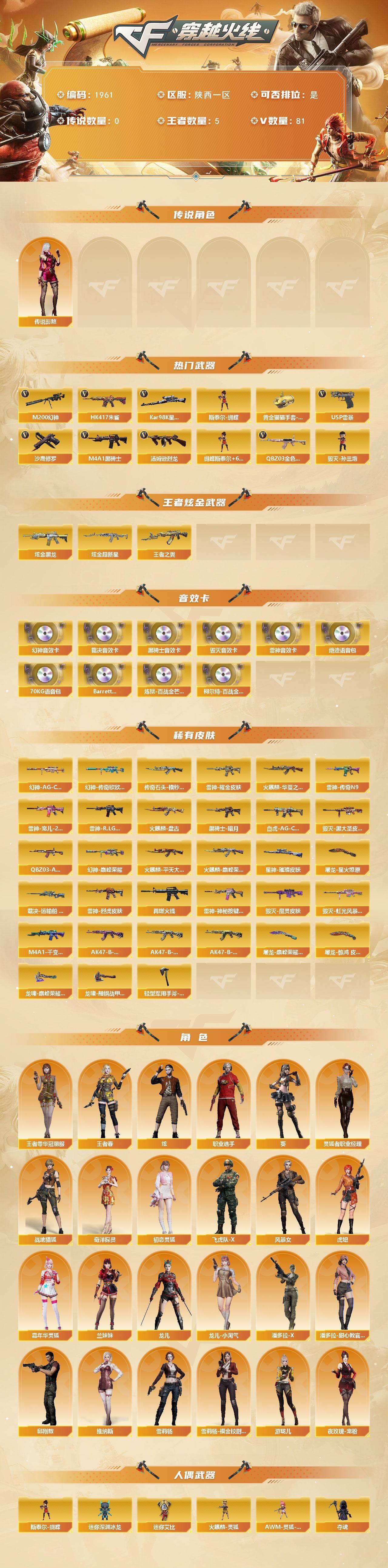 【1961】贝32902可排位-可二次【陕西一区/79v/vip6/1传说】【纯白无封号/生化爆破全能/传说影煞/幻神三件套/裁决三件套/星神带皮/6烈龙蝴蝶/雷暴套/10手呛/2四防角色q三角洲/雷神三件套】【m200-幻神/m200-幻神音效卡/幻神-巅峰荣耀】【awm-裁决/awm-裁决音效卡/运输船皮肤】【kar98k-星神/星神-璀璨皮肤】【黄金猫猫手套-白鲨】【usp-冥王/usp-雷暴】【白虎-ag-cfpls20冠军】【王者之心/王者之势/王者之击】【q03-金色蔷薇/q03-金色蔷薇音效卡/q03-ag-cfpls19冠军】【m4a1-雷神/m4a1-雷神音效卡/雷神-宠儿-2019mvp/雷神-传奇n9/雷神-r.lgd-cfpls18冠军/雷神-烈虎皮肤/雷神-耀金皮肤】【柯尔特-电竞装甲/glock18-武圣/cop 357-云龙】【barrett-毁灭/barrett-毁灭音效卡/芭蕾特-毁灭-cfpl冠军/毁灭-魔灵皮肤/毁灭-虹光风暴 皮肤】【ak47-火麒麟/火麒麟-巅峰荣耀/火麒麟-cfstar/火麒麟-盘古/火麒麟-华夏之心/火麒麟-平天大圣】【m4a1-黑骑士/m4a1-黑骑士音效卡/黑骑士-海王3】【hk417-朱雀】【黑武士-锦绣游龙】【awm-天龙/天龙-cfstar】【barrett-极光】【m4a1-千变-孔明皮肤】【汤姆逊-烈龙6】【炼狱-悦蓝】【斯泰尔-蝴蝶】【沙鹰-修罗5/修罗-cfstar2】【云龙扇】【麒麟刺】【屠龙2/屠龙-星火燎原】【职业选手/王者春/炫/王者零-华冠丽服/龙儿/龙儿-小淘气/奇洋探员/紫霞/雪莉杨/潘多拉-x/幻影/堕天使】【m4a1-龙血/m4a1-猎神/m4a1-武圣】【scar light-像素2/ak47-b-常胜将军/ak47-b-身先士卒/ak47-b-战士/ak-47-猩红传说】【ak47-雷暴】【an94-超新星】【barrett-暗月传说】【colt1911-小故障/colt 1911-大黄蜂7/新usp-呛王排位奖励3】【迷你深渊冰龙】【神圣爆裂者iii/神圣爆裂者-末日iii/kac-圣炎切割者iii/激光毁灭者iii-白马银呛/激光毁灭者iii/冰龙粉碎者-白马银呛】【斯泰尔-巧克力2/轻型军用手斧-镜】【猫猫手套/火麒麟-灵狐/毁灭-孙三炮/夺魂】【闪光丹-竞技荣光】【高爆手蕾-云龙/闪光丹-云龙/盐雾蛋-云龙】【高爆手蕾-雷暴4/闪光丹-雷暴4/盐雾蛋-雷暴4】【闪光丹-电竞装甲2/盐雾蛋-电竞装甲2】【手蕾-热带奇洋】【炫金黑龙/炫金超新星】【70kg语音包/绝迹语音包】【超级护目镜/透明护目镜/烟雾保护头盔/闪光护目镜/超级对讲机/超级背包/炫彩背包/防弹头盔7/防弹衣8/c4工具钳3/手蕾包4/防化服3】截图展示段位不代表实际段位,如赛季更新等不/拒因素发生变化、时限道具不保证所剩时间