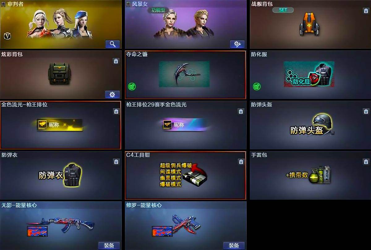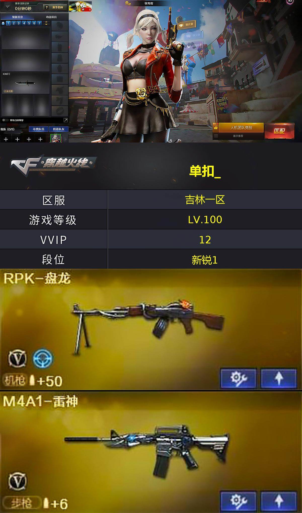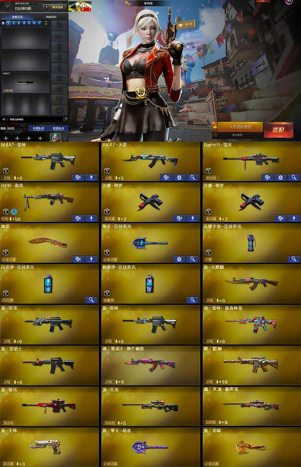 吉林一区-12v-0王者-0炫金 【热门武器】:rpk-盘龙,沙鹰-修罗2 【皮肤】:无影-能量核心,修罗-能量核心 【角色】:审判者,风暴女 【英雄级武器】:m4a1-雷神,ak47-无影,barrett-毁灭,rpk-盘龙,沙鹰-修罗2,屠龙,擎天-竞技荣光,高爆手蕾-竞技荣光,闪光丹-竞技荣光,盐雾蛋-竞技荣光 【道具】:战舰背包,炫彩背包,夺命之镰,防化服,金色流光-呛王排位,呛王