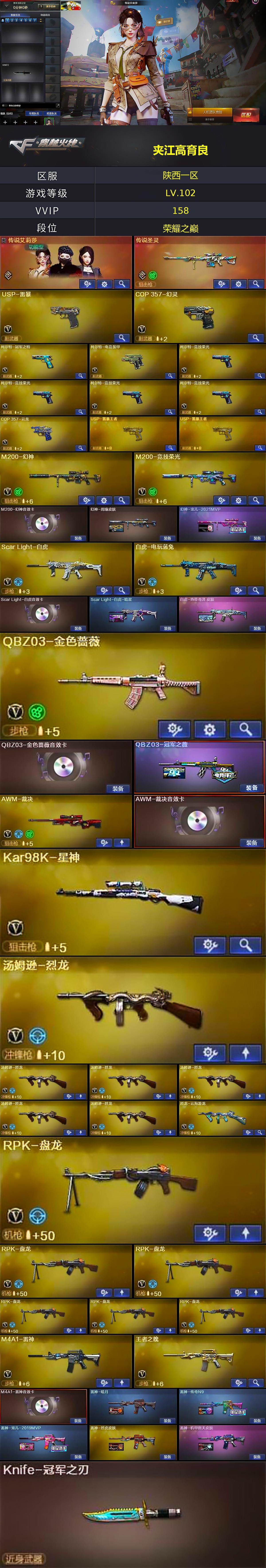 陕西一区-152v-29王者-4炫金 【传说武器】:传说圣灵 【传说角色】:传说艾莉莎 【热门武器】:传说圣灵,q03-金色蔷薇,scar light-白虎,hk417-朱雀,m4a1-青龙,m200-幻神,m200-竞技荣光,八面凌龙,死亡之眼,白虎-电玩蓝兔,柯尔特-冠军之特,kar98k-星神,炼狱-迷你小钢,毒蜂,m4a1-黑骑士4,汤姆逊-烈龙6,rpk-盘龙6,加特林-炼