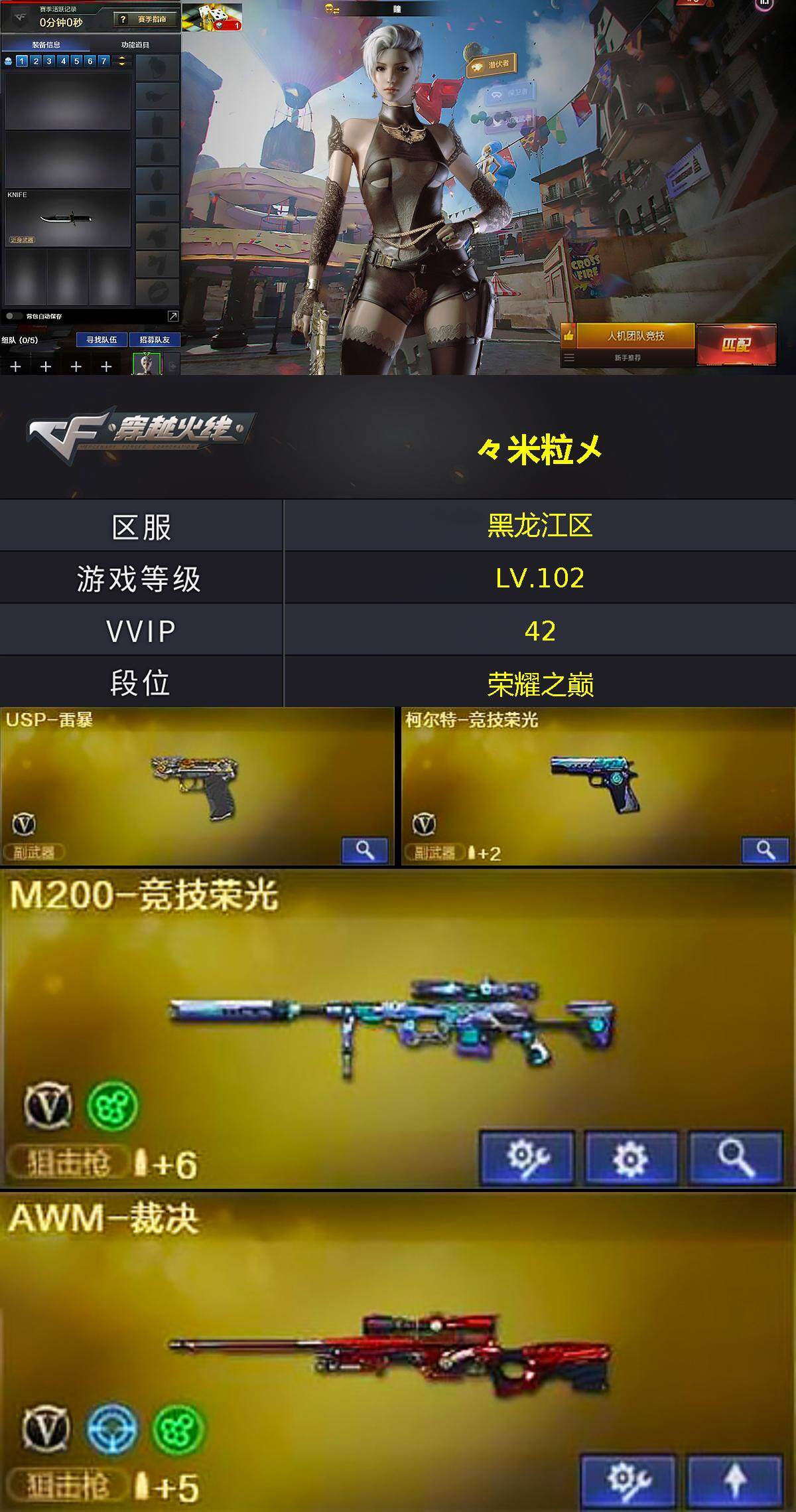 黑龙江区-45v-1王者-0炫金 【热门武器】:hk417-朱雀,m200-竞技荣光,m4a1-黑骑士,加特林-炼狱,usp-雷暴 【皮肤】:火麒麟-心动糖果,黑骑士-暗月,战神-流金岁月皮肤 【角色】:瞳,电竞教官-云悠悠,乔伊教练,风暴女,虎妞,嘉年华灵狐,娟娟,灵动武士,龙儿,潘多拉-甜心教官,斯沃特-x,铁骑荣耀,新娜塔莎 【人偶武器】:awm-灵狐-15周年嘉年华,生化手蕾-机甲核心