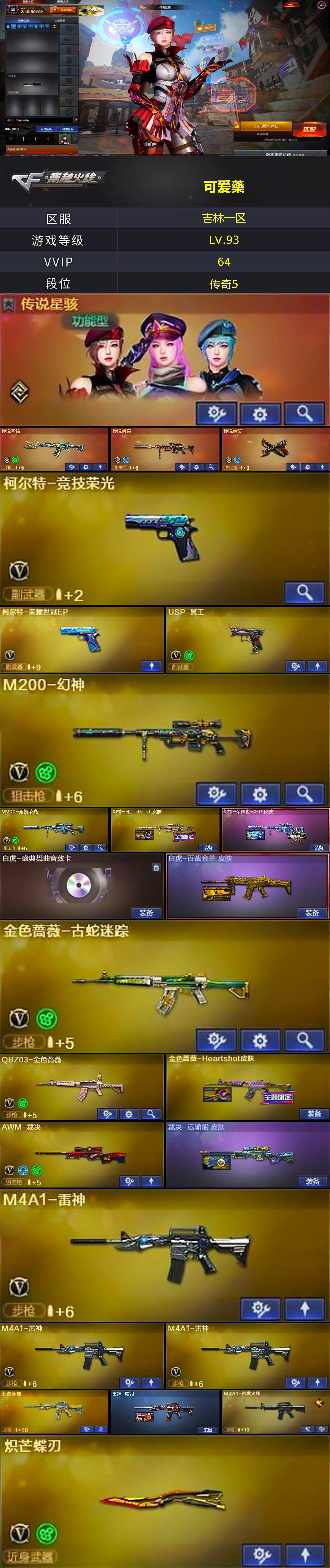 吉林一区-60v-4王者-0炫金 【传说武器】:传说圣谕,传说幽瞳,传说幽冥 【传说角色】:传说星骇 【热门武器】:传说幽瞳,传说圣谕,传说幽冥,q03-金色蔷薇,m200-幻神,金色蔷薇-古蛇迷踪,修罗-古蛇迷踪,m200-竞技荣光,usp-钞能力灵狐,cop-白鲨,炽芒蝶刃 【王者炫金武器】