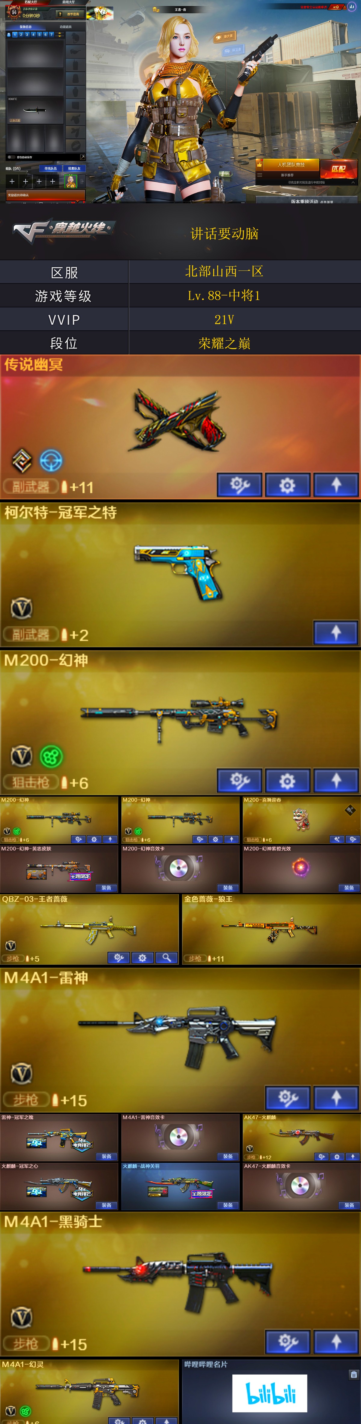 【★找回包赔★北部4131】:北部山西一区-21v-可二次实名-【lv.88-中将1】-【段位:荣耀之巅】传说幽冥/m200-幻神3/m200-喜狮迎春/m200-幻神-黄忠皮肤/q-03-王者蔷薇-觉醒版/柯尔特-冠军之特/m4a1-黑骑士/雷神-冠军之魄/火麒麟-冠军之心/毁灭-战神张飞/m200-幻神音效卡/barrett-毁灭音效卡/王者春/m200-喜狮迎春/哔哩哔哩名片(截图展示段位不代表实际段位,如赛季更新等不可抗拒因素发生变化,其余道具看截图或咨询客服)