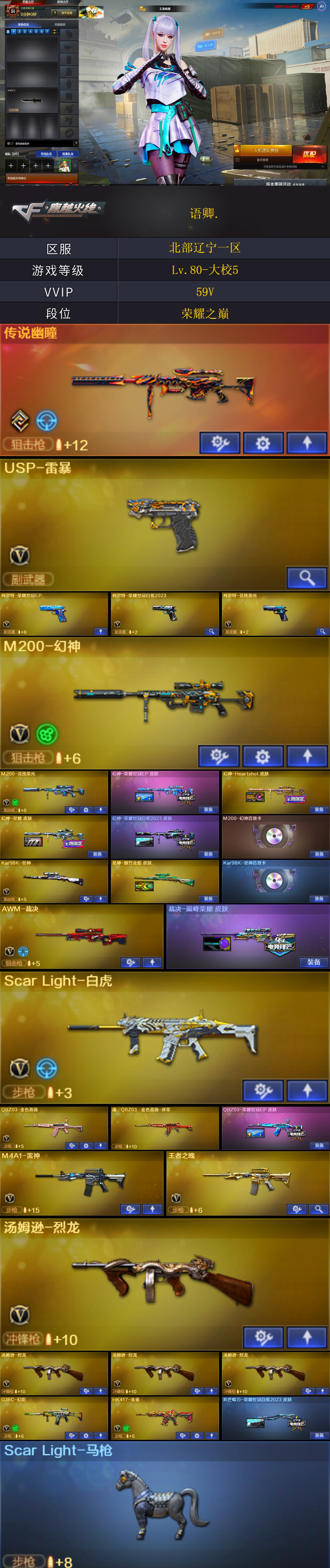【★找回包赔★北部4132】:北部辽宁一区-59v-可二次实名-【lv.80-大校5】-【段位:荣耀之巅】传说幽瞳/m200-幻神/m200-竞技荣光/幻神-heartshot皮肤/幻神-星耀皮肤/幻神-荣耀世冠白鲨2023皮肤/kar98k-星神/星神-傲竹金蛇皮肤/awm-裁决/裁决-巅峰荣耀皮肤/scarlight-白虎/q03-金色蔷薇2/usp-雷暴/柯尔特-荣耀世冠白鲨2023/柯尔特-竞技荣光/g36c-幻影/hk417-朱雀/炽芒蝶刃-荣耀世冠白鲨2023皮肤/汤姆逊-烈龙4/m200-幻神音效卡/kar98k-星神音效卡/scarlight-马呛/闪光丹-雷暴/盐雾蛋-荣耀世冠白鲨20232(截图展示段位不代表实际段位,如赛季更新等不可抗拒因素发生变化,其余道具看截图或咨询客服)