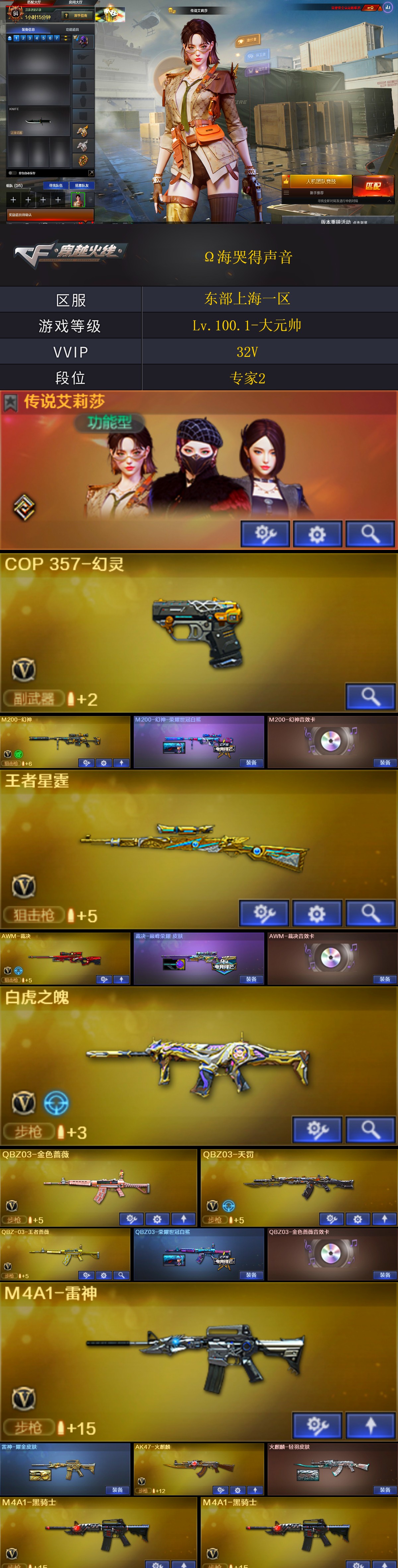 【★找回包赔★东部184】:东部上海一区-32v-可二次实名-【lv.100.1-大元帅】-【段位:专家2】传说艾莉莎/m200-幻神/m200-幻神-荣耀世冠白鲨/王者星霆/awm-裁决/裁决-巅峰荣耀皮肤/白虎之魄-觉醒版/q03-金色蔷薇/q03-天罚/q-03-王者蔷薇-觉醒版/q03-荣耀世冠白鲨/cop357-幻灵/m4a1-黑骑士2/m200-幻神音效卡/awm-裁决音效卡/q03-金色蔷薇音效卡/王者春(截图展示段位不代表实际段位,如赛季更新等不可抗拒因素发生变化,其余道具看截图或咨询客服)