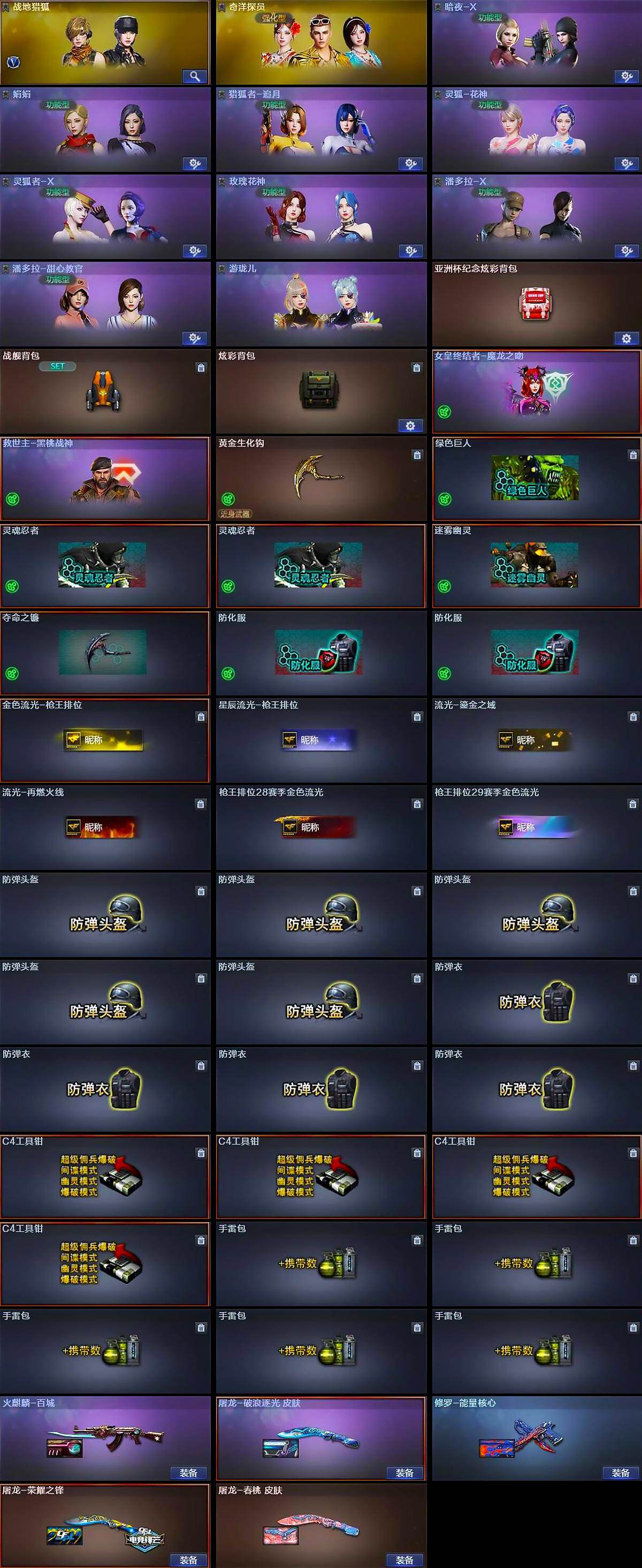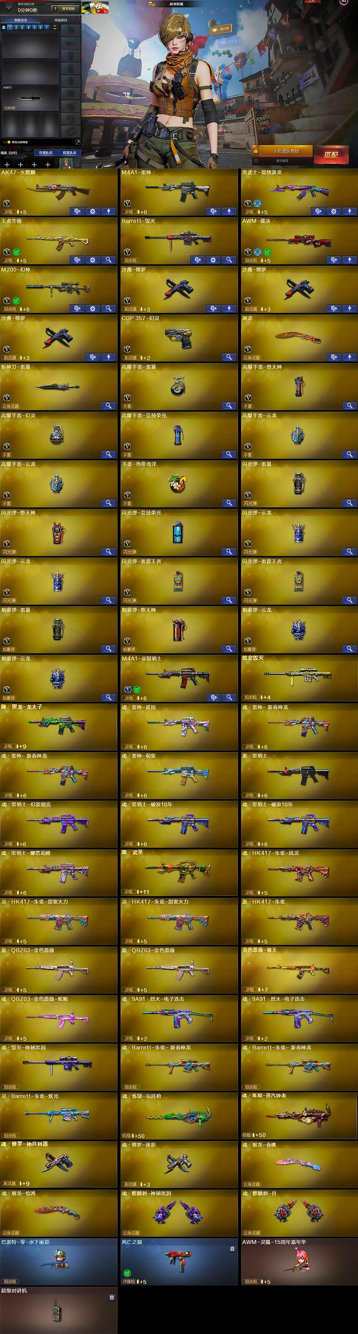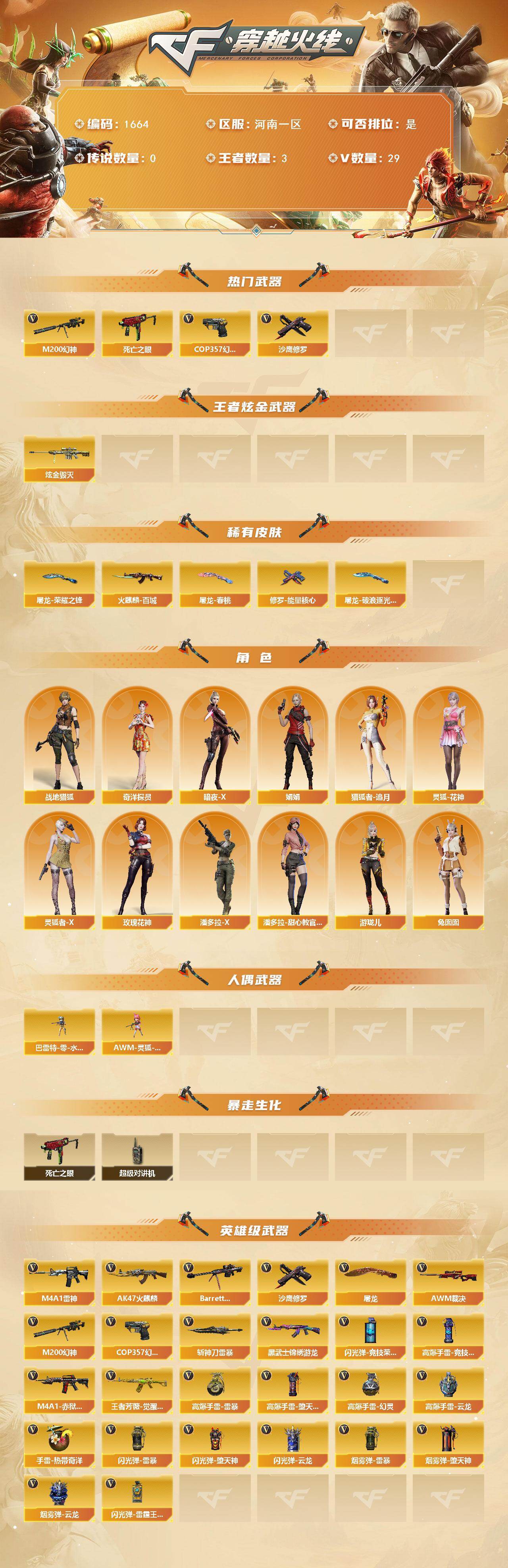 河南一区-29v-3王者-1炫金 【热门武器】:m200-幻神,死亡之眼,cop 357-幻灵,沙鹰-修罗3 【王者炫金武器】:炫金毁灭 【皮肤】:火麒麟-百城,修罗-能量核心,屠龙-荣耀之锋,屠龙-春桃 皮肤,屠龙-破浪逐光 皮肤 【角色】:战地猎狐,奇洋探员,暗夜-x,娟娟,猎狐者-追月,灵狐-花神,灵狐者-x,玫瑰花神,潘多拉-x,潘多拉-甜心教官,兔囡囡,游珑儿 【人偶武器】:芭蕾特