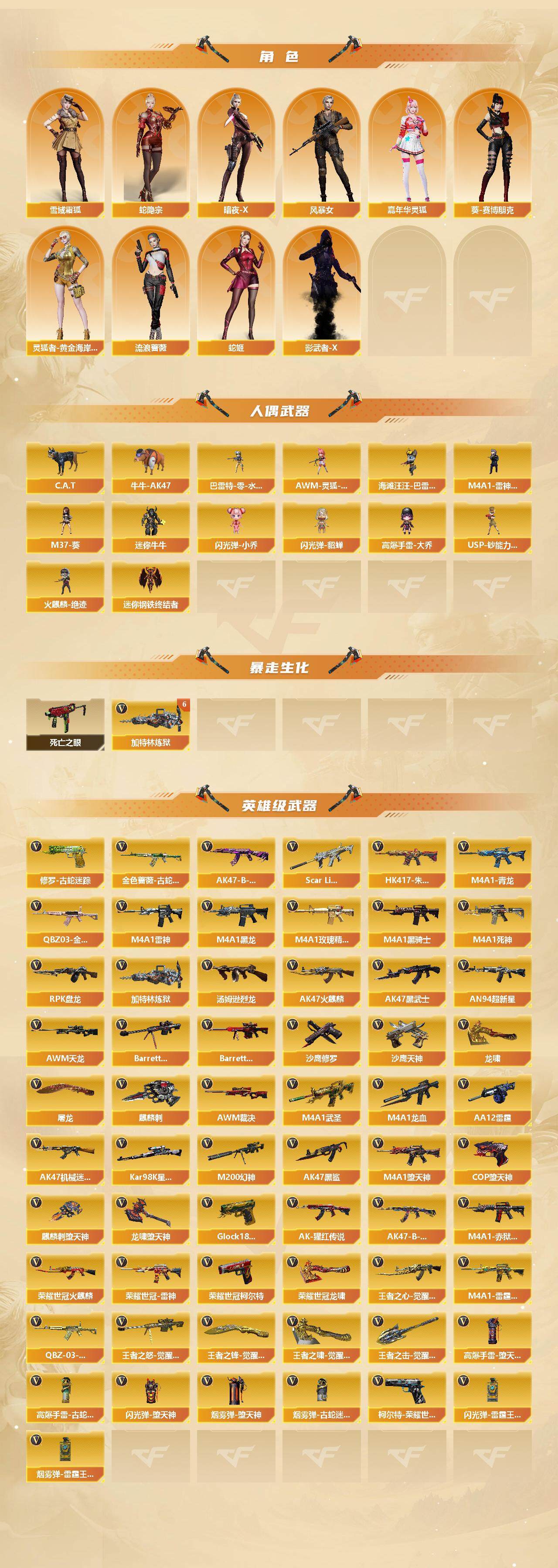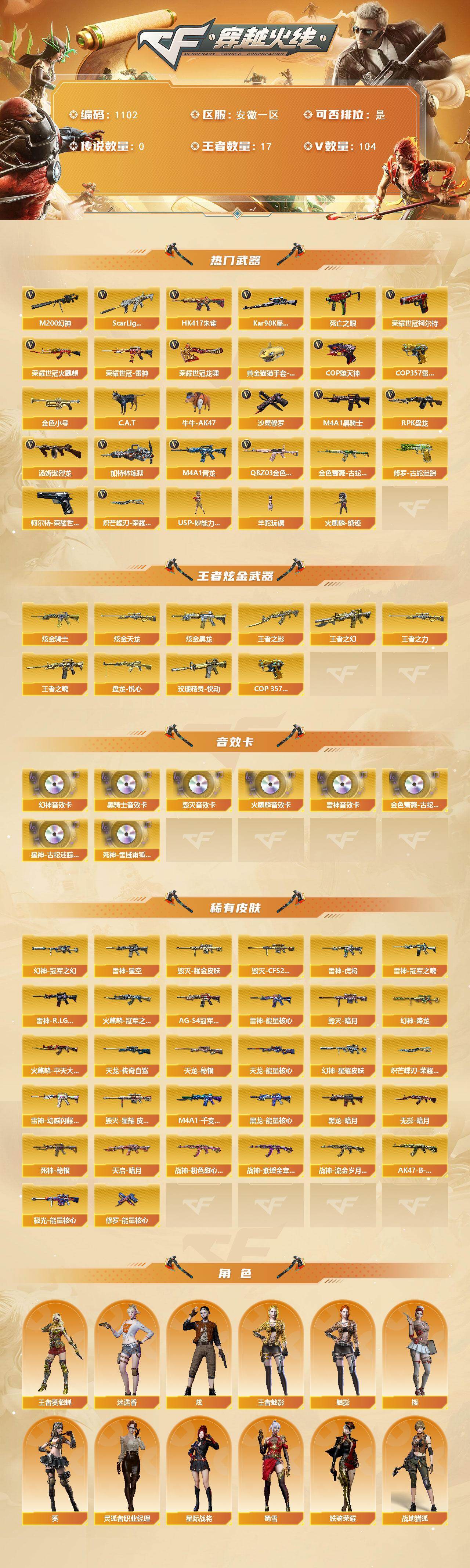 [15773444]安徽一区-104v-17王者-4炫金 【热门武器】:q03-金色蔷薇,scar light-白虎,hk417-朱雀,m4a1-青龙,m200-幻神,柯尔特-荣耀世冠白鲨2023,金色蔷薇-古蛇迷踪,修罗-古蛇迷踪,死亡之眼2,荣耀世冠-火麒麟,荣耀世冠-雷神,荣耀世冠-柯尔特,kar98k-星神,金色小号,c.a.t,牛牛-ak47,m4a1-黑骑士,汤姆逊-烈龙4,rpk-盘龙3,加特林-炼狱7,usp-钞能力灵狐,羊驼玩偶2,火麒麟-绝迹,cop-堕天神,cop 357-雷霆王者,沙鹰-修罗4,炽芒蝶刃-荣耀世冠白鲨2023 皮肤,荣耀世冠-龙啸,黄金猫猫手套-白鲨 【王者炫金武器】:王者之幻,玫瑰精灵-悦动,王者之影,王者之魄,王者之力,盘龙-悦心,cop 357-雷霆王者,炫金骑士,炫金黑龙2,炫金天龙 【音效卡】:星神-古蛇迷踪音效卡,m200-幻神音效卡,ak47-火麒麟音效卡,m4a1-雷神音效卡,m4a1-黑骑士音效卡3,barrett-毁灭音效卡,q03-金色蔷薇-古蛇迷踪音效卡,死神-雪域霜狐-怀旧音效卡 【皮肤】:幻神-冠军之幻,幻神-降龙,幻神-星耀 皮肤,雷神-能量核心2,雷神-星空,雷神-虎将,雷神-冠军之魄,雷神-r.lgd-cfpls18冠军,雷神-动感闪耀 皮肤,火麒麟-冠军之心,火麒麟-平天大圣,毁灭-暗月3,毁灭耀金皮肤,毁灭-cfs2020,毁灭-星耀 皮肤,m4a1-千变-孔明皮肤,黑龙-能量核心2,黑龙-暗月2,黑骑士-ag-s4冠军典藏,无影-暗月2,死神-秘银2,天启-暗月2,战神-粉色甜心皮肤,战神-紫绶金章皮肤6,战神-流金岁月皮肤7,ak47-b-常胜将军-孙权,天龙-秘银,天龙-能量核心,awm-天龙-传奇白鲨,极光-能量核心2,修罗-能量核心3,炽芒蝶刃-荣耀世冠白鲨2023 皮肤 【角色】:葵,樱,魅影,炫,迷迭香,星际战将,战地猎狐,王者-葵-貂蝉,王者-魅影,雪域霜狐,蛇隐宗,暗夜-x,风暴女,嘉年华灵狐,葵-赛博朋克,灵狐者-黄金海岸,灵狐者-职业经理,流浪蔷薇,蛇姬,蜀雪,铁骑荣耀,影武者-x 【人偶武器】:火麒麟-绝迹,m4a1-雷神-精英刀锋,迷你钢铁终结者,芭蕾特-零-水下丽影,usp-钞能力灵狐,awm-灵狐-15周年嘉年华,海滩汪汪-芭蕾特,