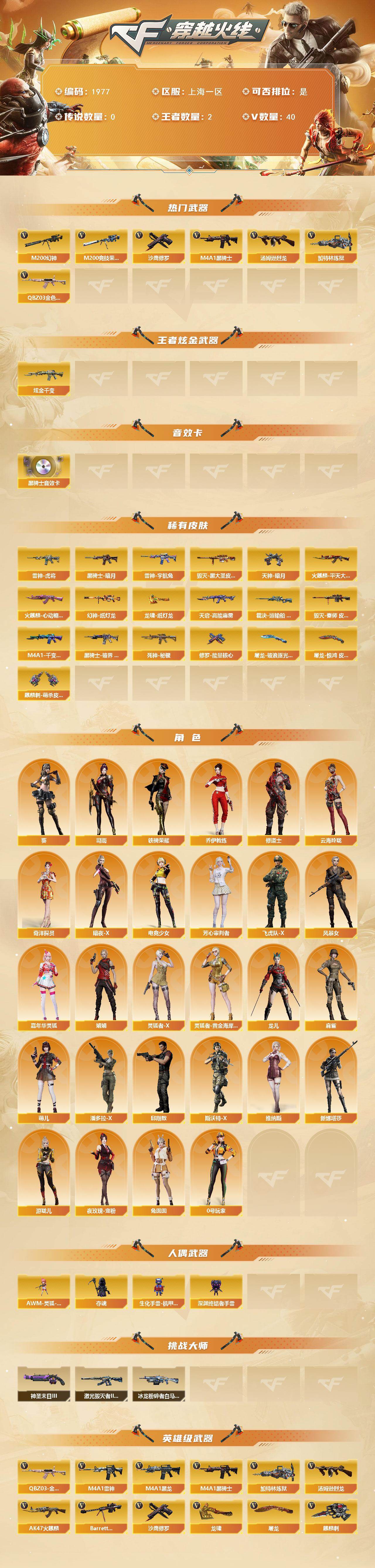 【1977】贝27302可排位-可二次【上海一区/40v/vip5】【纯白无封号/幻神带皮/竞技荣光套/裁决带皮】【m200-幻神/幻神-纸灯龙皮肤】【awm-裁决/裁决-运输船】【m200-竞技荣光】【柯尔特-竞技荣光】【scar light-玄豹】【q-03-王者蔷薇/q03-金色蔷薇】【m4a1-雷神2/雷神-宇航兔皮肤/雷神-虎将】【barrett-毁灭】【ak47-火麒麟/火麒麟-cfstar2/火麒麟-心动糖果/火麒麟-平天大圣】【m4a1-黑骑士/m4a1-黑骑士音效卡/黑骑士-海王】【m4a1-黑龙】【无影-神兵利器】【黑武士-锦绣游龙】【天龙-cfstar】【死神-秘银/m4a1-千变-孔明皮肤】【汤姆逊-烈龙/烈龙-云海游龙】【加特林-炼狱】【沙鹰-修罗/修罗-cfstar2/修罗-能量核心】【麒麟刺/麒麟刺-萌杀皮肤】【擎天-云海游龙/擎天-竞技荣光】【屠龙2/屠龙-破浪逐光 皮肤】【龙啸/龙啸-纸灯龙皮肤】【龙儿/暗夜-x/司雨/木兰/奇洋探员/云海玲珑/乔伊教练/修道士/兔囡囡/萌儿/麻雀/灵狐者-黄金海岸/妲己/娟娟/潘多拉-x/斯沃特-x/铁骑荣耀/新娜塔莎/幻影/堕天使/复仇者】【天启-高能霹雳 皮肤】【超新星-热带奇洋】【colt 1911-大黄蜂3/柯尔特-萌杀2/新usp-呛王排位奖励3】【龙啸-热带奇洋/斩魔刀/斩神刀】【神圣爆裂者-末日iii2/激光毁灭者iii-白马银呛/冰龙粉碎者-白马银呛/征服者2】【斯泰尔-巧克力2】【夺魂】【高爆手蕾-竞技荣光2/闪光丹-竞技荣光2/盐雾蛋-竞技荣光3】【手蕾-云海游龙】【闪光丹-幻灵】【手蕾-热带奇洋】【炫金千变】【语音特效-云海游龙2】【烟雾保护头盔/闪光护目镜/超级背包/炫彩背包/防弹头盔3/防弹衣3/c4工具钳3/手蕾包3/防化服】截图展示段位不代表实际段位,如赛季更新等不/拒因素发生变化、时限道具不保证所剩时间