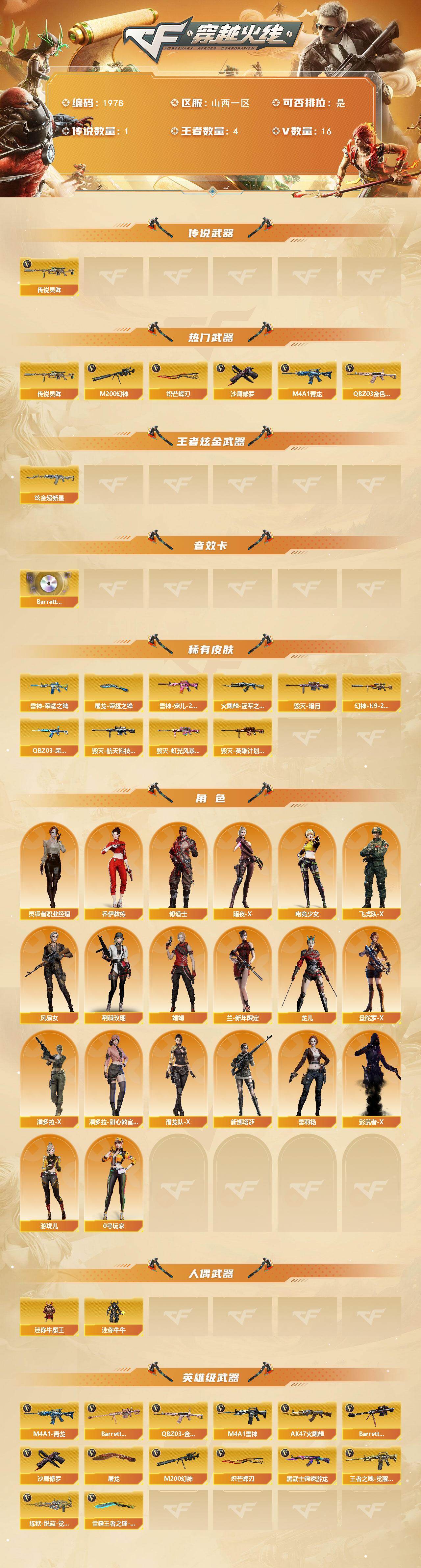 【1978】贝20903可排位-可二次【山西一区/16v/vip5/1传说】【哔哩哔哩名片/传说灵眸/幻神带皮/蝴蝶刀/q带ep皮肤/四防角色】【m200-幻神/m200-幻神-n9-2022mvp】【炽芒蝶刃】【q03-金色蔷薇】【m4a1-雷神/雷神-荣耀之魄/雷神-宠儿-2019mvp】【barrett-毁灭/毁灭-航天科技皮肤/毁灭-虹光风暴 皮肤/毁灭-暗月】【ak47-火麒麟/火麒麟-冠军之心/火麒麟-cfstar】【黑武士-锦绣游龙】【炼狱-悦蓝】【沙鹰-修罗/修罗-cfstar】【屠龙/屠龙-荣耀之锋】【龙啸-烈火龙威】【龙儿/暗夜-x/木兰/乔伊教练/修道士/兰-新年限定/荆棘玫瑰/紫霞/妲己/雪莉杨/娟娟/潘多拉-x/救世主-x/影武者-x/新娜塔莎/堕天使】【m4a1-青龙】【colt 1911-大黄蜂2/新usp-呛王排位奖励2】【雷霆王者之锋】【斯泰尔-巧克力】【王者之魄】【高爆手蕾-雷霆王者】【炫金超新星】【烟雾保护头盔/防弹头盔3/防弹衣3/c4工具钳3/手蕾包3/防化服3】截图展示段位不代表实际段位,如赛季更新等不/拒因素发生变化、时限道具不保证所剩时间