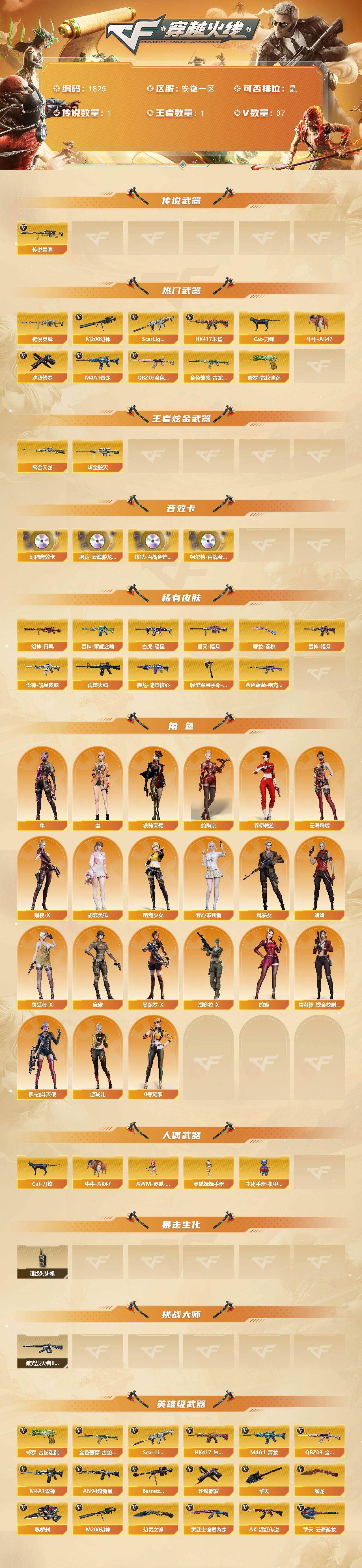 【1825】特16556可排位-可二次【安徽一区/37v/vip5/1传说】【纯白无封号/传说灵眸/幻神三件套】【m200-幻神/m200-幻神音效卡/幻神-丹凤】【scar light-白虎/scar light-白虎-暗星】【q03-金色蔷薇/金色蔷薇-电竞之星 皮肤】【隼】【m4a1-雷神2/雷神-荣耀之魄/雷神-航星皮肤/雷神-暗月】【barrett-毁灭/芭蕾特-毁灭-cfpl冠军/毁灭-暗月】【火麒麟-cfstar】【黑龙-能量核心】【hk417-朱雀】【黑武士-锦绣游龙】【烈龙-云海游龙】【沙鹰-修罗】【麒麟刺】【擎天/擎天-云海游龙】【屠龙/屠龙-云海游龙/屠龙-春桃 皮肤】【暗夜-x/幽/云海玲珑/乔伊教练/麻雀/紫霞/妲己/娟娟/潘多拉-x/铁骑荣耀/幻影/堕天使】【m4a1-青龙】【ak-47-猩红传说】【an94-超新星】【colt 1911-大黄蜂/新usp-呛王排位奖励3】【激光毁灭者iii-白马银呛】【斯泰尔-巧克力2】【牛牛-ak47/猫猫手套/cat-刀锋】【闪光丹-云龙/手蕾-云海游龙】【高爆手蕾-雷霆】【高爆手蕾-幻灵2/闪光丹-幻灵/盐雾蛋-幻灵】【炫金毁灭/炫金天龙】【语音特效-云海游龙】【烟雾保护头盔/闪光护目镜/超级对讲机/超级背包/炫彩背包/防弹头盔3/防弹衣3/c4工具钳3/手蕾包3/防化服3】截图展示段位不代表实际段位,如赛季更新等不/拒因素发生变化、时限道具不保证所剩时间1655696581