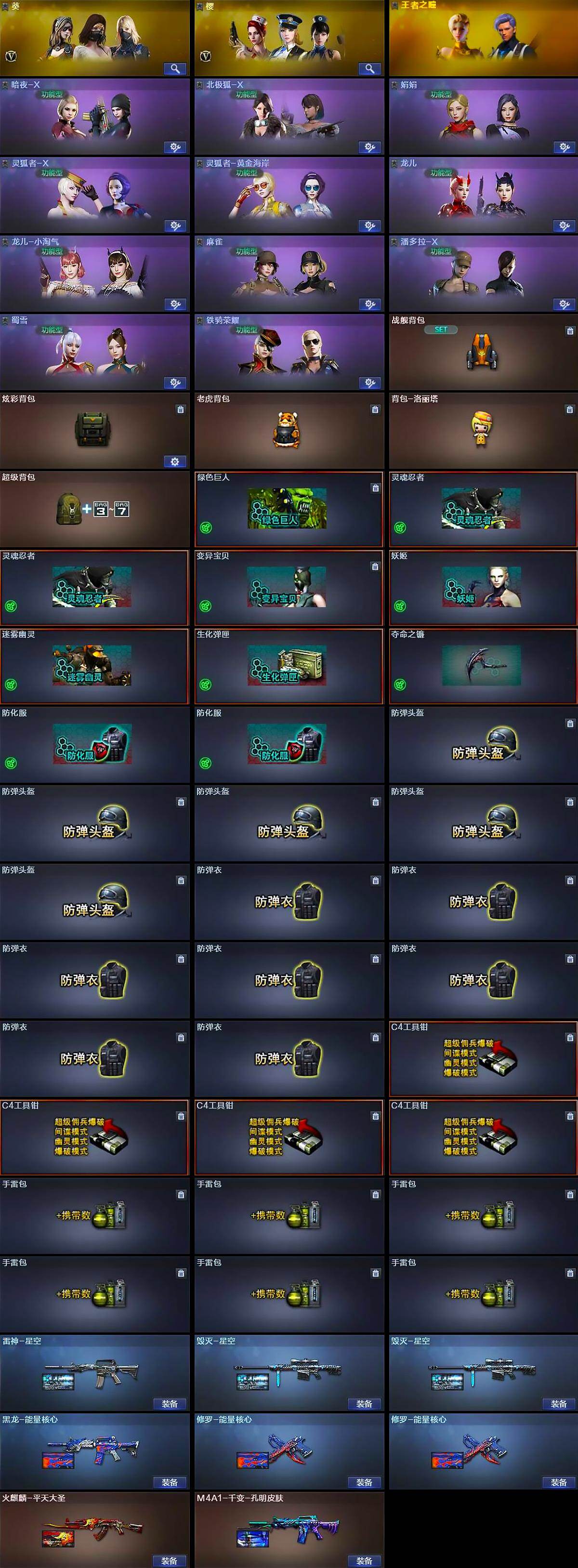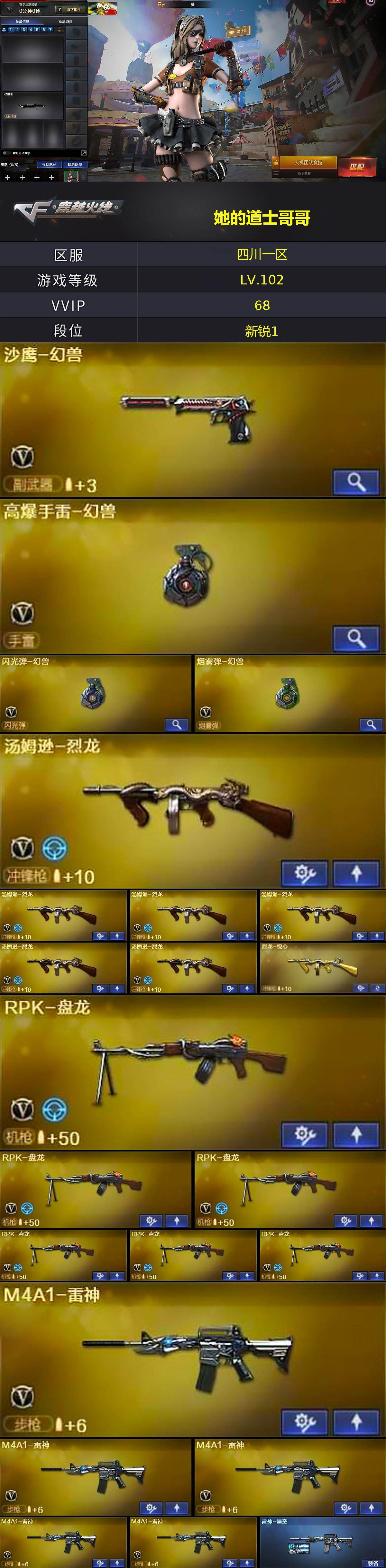 四川一区-68v-5王者-0炫金 【热门武器】:死亡之眼,m4a1-黑骑士2,汤姆逊-烈龙6,rpk-盘龙6,加特林-炼狱3,沙鹰-修罗2,金刚伞,高爆手蕾-幻兽 【王者炫金武器】:王者之翼,王者之力,烈龙-悦心,王者之灵 【皮肤】:雷神-星空,火麒麟-平天大圣,毁灭-星空2,m4a1-千变-孔明皮肤,黑龙-能量核心,修罗-能量核心2 【角色】:葵,樱,王者之瞳,狐影,暗夜-x,