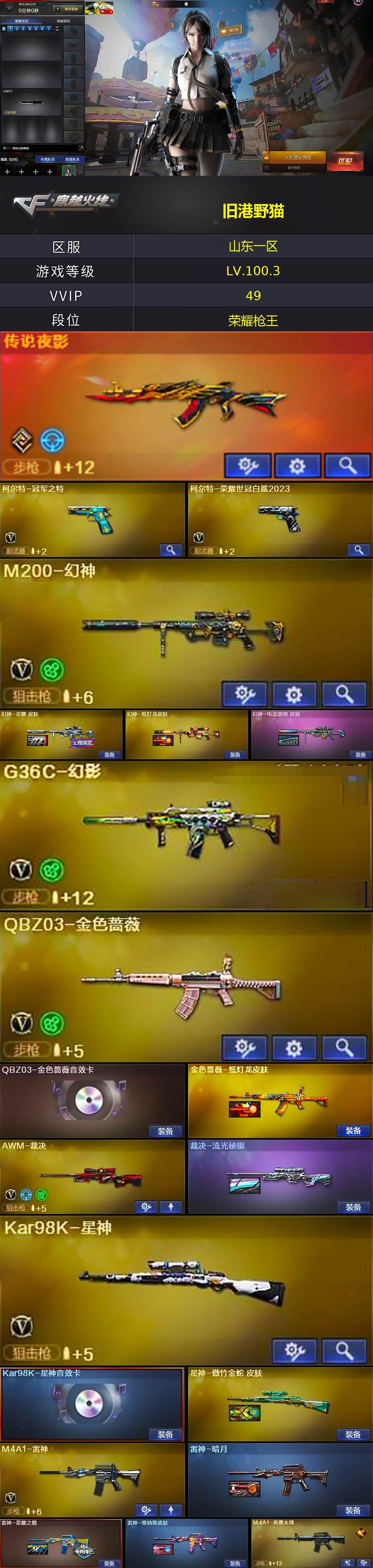 山东一区-45v-8王者-1炫金 【传说武器】:传说夜影 【热门武器】:传说夜影,g36c-幻影,q03-金色蔷薇,m4a1-青龙,m200-幻神,柯尔特-荣耀世冠白鲨2023,柯尔特-冠军之特,kar98k-星神,羊驼玩偶3,cop-白鲨2,沙鹰-修罗,柯尔特-赛博朋克 【王者炫金武器】:炫金毁灭 【音效卡】:barrett-极光音效卡,kar98k-星神音效卡,barrett-碧霄极光音效卡,炼狱-百战金芒-庆典舞曲音效卡 【皮肤】:幻神-星耀 皮肤,幻神-纸灯龙皮肤,幻神-电流骇客 皮肤,金色蔷薇-纸灯龙皮肤,裁决-流光秘银,星神-傲竹金蛇 皮肤,雷神-暗月,雷神-荣耀之魄,雷神-维纳斯皮肤,m4a1-再燃火线,火麒麟-雷神,火麒麟-冠军之心,毁灭-暗月,毁灭-星耀 皮肤,毁灭-英雄计划 皮肤,awm-天龙-传奇白鲨,炼狱-星空,屠龙-荣耀之锋2,屠龙-星耀 皮肤,龙啸-纸灯龙皮肤,轻型军用手斧-再燃火线,擎天-傲竹金蛇 皮肤 【角色】:零,隼,星际战将,王者春,乔伊教练,云海玲珑,暗夜-x,风暴女,灵狐-花神,灵狐者-职业经理,玫瑰花神,潘多拉-甜心教官,维纳斯 【人偶武器】:cop-白鲨2,迷你牛魔王,迷你牛牛 【暴走生化】:超级对讲机 【挑战大师】:激光毁灭者iii-白马银呛 【英雄级武器】:ak47-火麒麟,m4a1-雷神,ak12-天启,an94-超新星,ak47-黑鲨,m4a1-青龙,g36c-幻影,q03-金色蔷薇,烈火-动感闪耀,awm-天龙,barrett-毁灭,awm-裁决,m200-幻神,kar98k-星神,炼狱-百战金芒,沙鹰-修罗,柯尔特-冠军之特,柯尔特-荣耀世冠白鲨2023,天神-动感闪耀,屠龙2,龙啸,幻灵之锋3,屠龙-动感闪耀,麒麟刺-百战金芒,高爆手蕾-幻灵,手蕾-动感闪耀,手蕾-云海游龙,闪光丹-雷暴,盐雾蛋-雷暴,盐雾蛋-幻灵,m4a1-苍鸣雷神,barrett-碧霄极光 【道具】:bs战队炫彩背包,cfs限定背包,全能呛王背包,女皇终结者-背包,百战金芒炫彩背包,女皇终结者-魔龙之吻,救世主-黑桃战神,绿色巨人,灵魂忍者,妖姬,迷雾幽灵,夺命之镰,防化服3,金色流光-呛王排位2,星辰流光-呛王排位,呛王排位29赛季金色流光,语音特效-盛典烟火,萌萌小葵表情,动感闪耀表情,防弹头盔3,防弹衣3,c4工具钳3,手蕾包3 【特殊呛械】:
