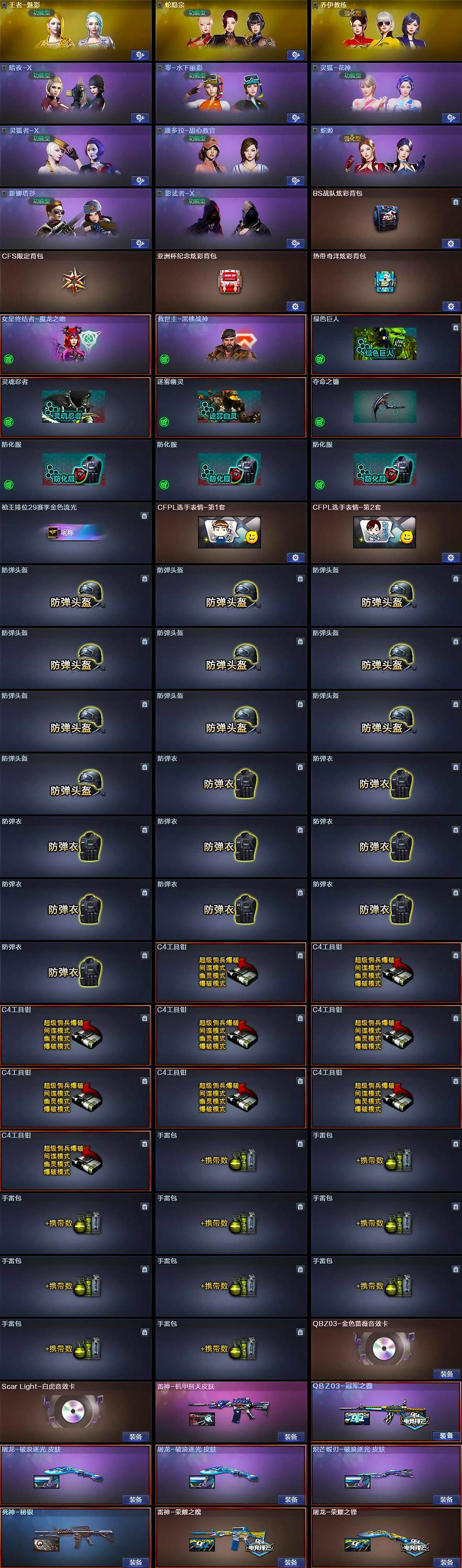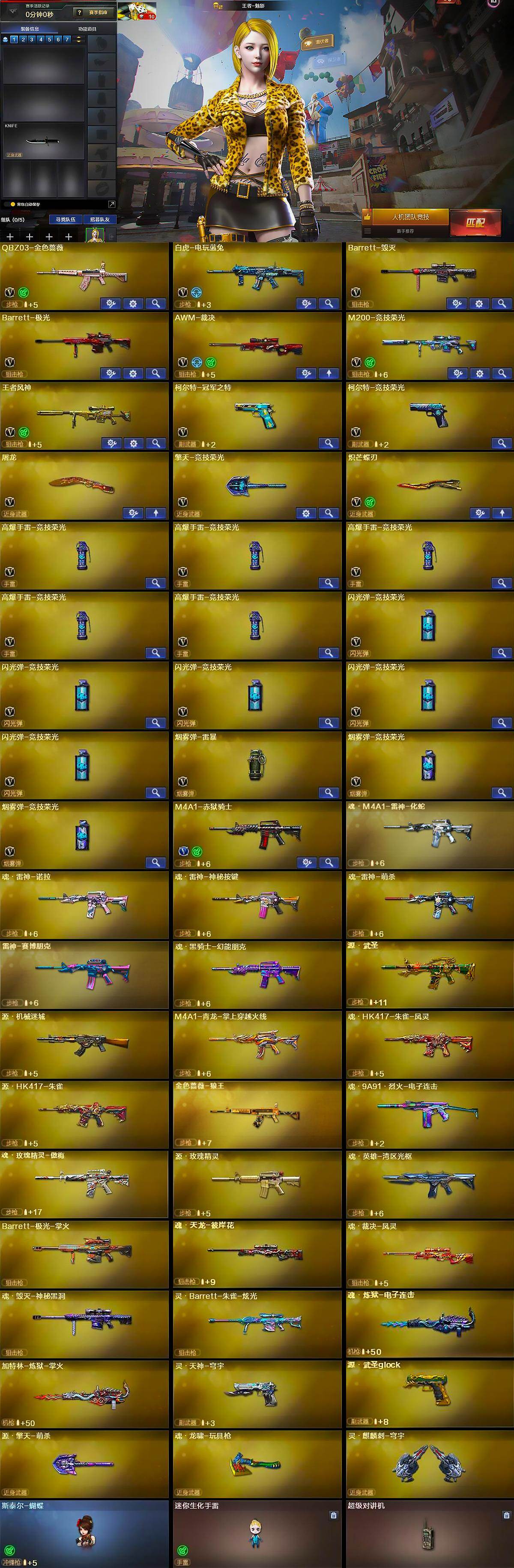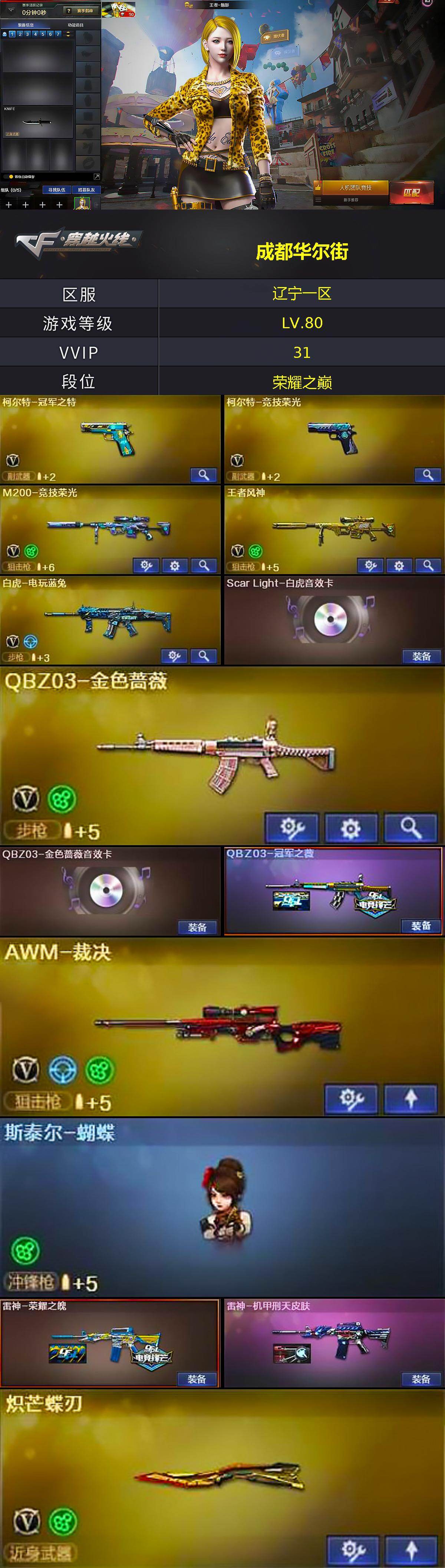 [15805882]辽宁一区-30v-3王者-0炫金 【热门武器】:q03-金色蔷薇,m200-竞技荣光,白虎-电玩蓝兔,柯尔特-冠军之特,斯泰尔-蝴蝶,炽芒蝶刃,炽芒蝶刃-破浪逐光 皮肤 【皮肤】:q03-冠军之薇,雷神-荣耀之魄,雷神-机甲刑天皮肤,毁灭-英雄计划 皮肤,死神-秘银,屠龙-荣耀之锋,屠龙-破浪逐光 皮肤2,炽芒蝶刃-破浪逐光 皮肤 【角色】:王者-魅影,蛇隐宗,乔伊教练,暗夜-x,零-水下丽影,灵狐-花神,灵狐者-x,潘多拉-甜心教官,蛇姬,兔囡囡,新娜塔莎,影武者-x 【人偶武器】:斯泰尔-蝴蝶,迷你生化手蕾 【暴走生化】:超级对讲机 【英雄级武器】:q03-金色蔷薇,白虎-电玩蓝兔,barrett-毁灭,barrett-极光,awm-裁决,m200-竞技荣光,王者风神-觉醒版,柯尔特-冠军之特,柯尔特-竞技荣光,屠龙,擎天-竞技荣光,炽芒蝶刃,高爆手蕾-竞技荣光5,闪光丹-竞技荣光5,盐雾蛋-雷暴,盐雾蛋-竞技荣光2,m4a1-赤狱骑士 【道具】:bs战队炫彩背包,cfs限定背包,亚洲杯纪念炫彩背包,热带奇洋炫彩背包,女皇终结者-魔龙之吻,救世主-黑桃战神,绿色巨人,灵魂忍者,迷雾幽灵,夺命之镰,防化服3,呛王排位29赛季金色流光,cfpl选手表情-第1套,cfpl选手表情-第2套,防弹头盔10,防弹衣9,c4工具钳9,手蕾包10 【特殊呛械】:蝴蝶斯泰尔0烈龙,1蝴蝶斯泰尔