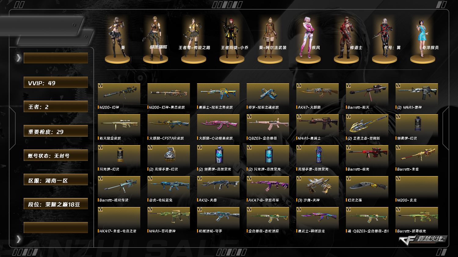 7997/南部/湖南一区/可排位/42v/幻神/幻神黄忠/q金色蔷薇/白虎电玩蓝兔/火麒麟/雷神/黑骑士/黑武士锦绣游龙/金色蔷薇古蛇迷踪/机械迷城穹宇/朱雀电竞之星/屠龙电竞之星/【四防角色/王者玲珑小乔/】/【角色】/葵/不败狙神/零纪元/战地猎狐/幻面灵狐/葵阿尔法武装/奇洋探员/乔伊