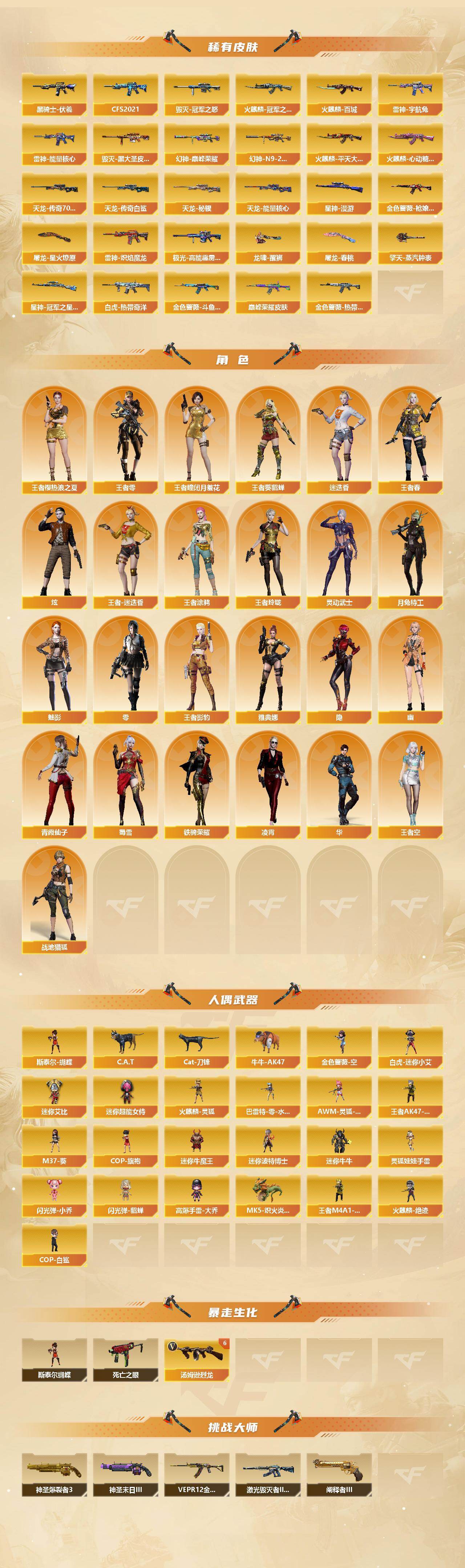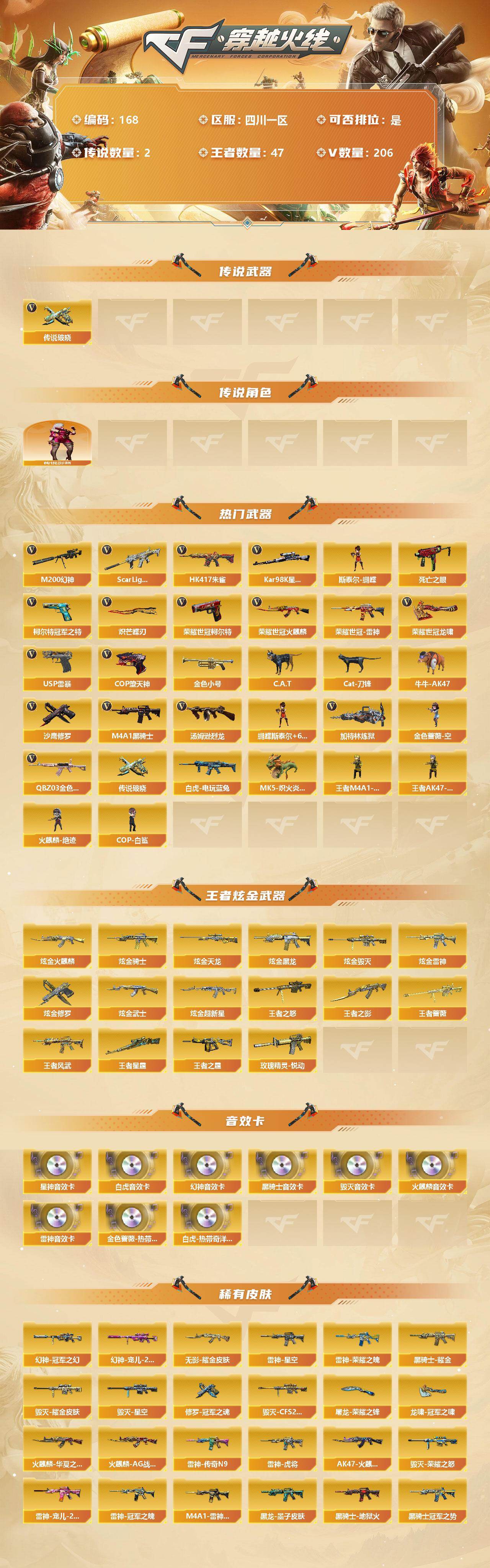 【168】四川一区-206v-47王者-11炫金 【传说武器】:传说破晓 【传说角色】:传说影煞 【热门武器】:传说破晓,q03-金色蔷薇2,scar light-白虎,hk417-朱雀,m200-幻神,死亡之眼2,荣耀世冠-火麒麟,荣耀世冠-雷神,白虎-电玩蓝兔,柯尔特-冠军之特,荣耀世冠-柯尔特,kar98k-星神,金色小号,c.a.t,cat-刀锋,牛牛-ak47,m4a1-黑骑士2,汤姆逊-烈龙7,加特林-炼狱3,金色蔷薇-空,斯泰尔-蝴蝶,mk5-炽火炎龙,王者m4a1-萌萌金发刀锋,王者ak47-萌萌银发刀锋,火麒麟-绝迹,cop-白鲨,usp-雷暴,cop-堕天神,沙鹰-修罗4,炽芒蝶刃2,荣耀世冠-龙啸 【王者炫金武器】:玫瑰精灵-悦动,王者之影2,王者风武,王者之怒4,王者蔷薇,王者星霆,王者之霆,炫金火麒麟,炫金骑士,炫金天龙,炫金黑龙,炫金毁灭2,炫金雷神,炫金修罗,炫金武士,炫金超新星2 【音效卡】:q03-金色蔷薇-热带奇洋音效卡,scar light-白虎-热带奇洋音效卡,m200-幻神音效卡,ak47-火麒麟音效卡,m4a1-雷神音效卡,m4a1-黑骑士音效卡,barrett-毁灭音效卡,scar light-白虎音效卡,kar98k-星神音效卡,barrett-碧霄极光音效卡 【皮肤】:幻神-冠军之幻,幻神-宠儿-2021mvp,幻神-巅峰荣耀,m200-幻神-n9-2022mvp,白虎-热带奇洋 皮肤,金色蔷薇-呛娘阿敏 皮肤,q03-金色蔷薇-斗鱼皮肤,q03-巅峰荣耀皮肤,金色蔷薇-热带奇洋 皮肤,awm-裁决-凤灵皮肤,星神-漫游,kar98k-星神-冠军之星皮肤,雷神-暗月,雷神-能量核心,雷神-荣耀之魄,雷神-星空,m4a1-雷神-cfs 2019,雷神-虎将,雷神-冠军之魄,雷神-传奇n9,雷神-宠儿-2019mvp,雷神-烈虎皮肤,雷神-机甲刑天皮肤2,雷神-宇航兔皮肤,雷神-炽焰魔龙,雷神-维纳斯皮肤,火麒麟-ag战队皮肤,火麒麟-冠军之心,火麒麟-华夏之心,ak47-火麒麟-传奇even,火麒麟-平天大圣2,火麒麟-百城,火麒麟-心动糖果,毁灭-荣耀之怒2,毁灭耀金皮肤,毁灭-星空,毁灭-冠军之怒,毁灭-cfs2020,毁灭-黑大圣皮肤,毁灭-魔灵皮肤,毁灭-神秘黑洞皮肤,毁灭-斗鱼 皮肤,毁灭-虹光风暴 皮肤,毁灭-秦师 皮肤,m4a1-千变-孔明皮肤,黑龙-能量核心,黑龙-墨子皮肤,黑骑士耀金皮肤2,黑骑士-冠军之势,黑骑士-地狱火,黑骑士-cfs2021,黑骑士-伏羲,黑骑士-少林,黑骑士-破浪10年皮肤,无影-暗月3,无影-能量核心,无影耀金皮肤,死神-机甲核心皮肤,战神-粉色甜心皮肤2,战神-紫绶金章皮肤,战神-流金岁月皮肤,ak47-b-常胜将军-曹操,ak47-b-常胜将军-刘备,ak47-b-常胜将军-孙权,天龙-秘银,天龙-能量核心,awm-天龙-传奇70kg2,awm-天龙-传奇白鲨2,极光-能量核心2,极光-高能霹雳 皮肤,炼狱-玩具呛皮肤,修罗-能量核心2,修罗-冠军之魂,屠龙-荣耀之锋3,屠龙-星火燎原2,屠龙-春桃 皮肤,龙啸-冠军之啸,龙啸-醒狮 皮肤,擎天-蒸汽钟表 皮肤,麒麟刺-萌杀皮肤 【角色】:零,魅影,炫,迷迭香,凌霄,月兔特工,隐,华,战地猎狐,王者-瞳-闭月羞花,王者樱-热浪之夏,王者-葵-貂蝉,王者-零,王者春,王者涂鸦,王者玲珑,王者影豹,王者-迷迭香,王者空,雅典娜,幽,蜀雪,铁骑荣耀,灵动武士,青霞仙子 【人偶武器】:火麒麟-绝迹,cop-白鲨,王者m4a1-萌萌金发刀锋,白虎-迷你小艾,火麒麟-灵狐,王者ak47-萌萌银发刀锋,mk5-炽火炎龙,斯泰尔-蝴蝶,芭蕾特-零-水下丽影,金色蔷薇-空,awm-灵狐-15周年嘉年华2,m37-葵,cop-旗袍,c.a.t,cat-刀锋,迷你艾比,牛牛-ak47,迷你超能女侍,迷你牛魔王,迷你波特博士,迷你牛牛2,灵狐娃娃手蕾,闪光丹-小乔,闪光丹-貂蝉,高爆手蕾-大乔 【暴走生化】:斯泰尔-蝴蝶,死亡之眼2 【挑战大师】:神圣爆裂者iii,激光毁灭者iii-白马银呛,vepr-12-金魔,神圣爆裂者-末日iii,阐释者iii 【英雄级武器】:m4a1-千变,ak47-火麒麟4,m4a1-黑龙2,m4a1-雷神4,m4a1-黑骑士2,ak47-无影,m4a1-死神2,ak47-黑武士,ak47-黑鲨3,m4a1-龙血,m4a1-雷霆,m4a1-堕天神,hk417-朱雀,scar light-白虎,m4a1-夜魔,无影-神兵利器,q03-云龙,黑武士-锦绣游龙,超新星-热带奇洋,m4a1-玫瑰精灵,q03-金色蔷薇2,m4a1-猎神,王者之心-觉醒版,王者之翼-觉醒版,王者之武-觉醒版,王者之魄-觉醒版2,王者之势-觉醒版,王者之戮-觉醒版,王者之幻-觉醒版,王者之圣-觉醒版,ak-47-猩红传说2,ak47-b-战神,王者冰魄-觉醒版,王者之城-觉醒版,王者火魄-觉醒版,黑骑士-海王3,ak47-b-常胜将军,白虎-电玩蓝兔,白虎之魄-觉醒版,荣耀世冠-火麒麟,荣耀世冠-雷神,黑武士-cf网剧冠军,awm-天龙,barrett-毁灭4,barrett-极光2,awm-裁决2,m200-幻神,barrett-朱雀,kar98k-星神,王者之怒-觉醒版,王者之光-觉醒版,王者幻神-觉醒版,王者凰鸣-觉醒版,加特林-炼狱3,汤姆逊-烈龙7,沙鹰-修罗4,沙鹰-天神,usp-雷暴,cop-堕天神,柯尔特-冠军之特,荣耀世冠-柯尔特,破空呛刃-夜魔,cop 357-云龙2,天神-cf网剧冠军,王者之魂-觉醒版,屠龙6,龙啸2,麒麟刺-堕天神,马来剑-夜魔,擎天2,麒麟刺,擎天-竞技荣光,炽芒蝶刃2,龙啸-热带奇洋,荣耀世冠-龙啸,龙啸-堕天神,斩神刀-雷暴2,擎天-cf网剧冠军,王者之锋-觉醒版,王者之击-觉醒版3,高爆手蕾-雷霆6,高爆手蕾-雷暴5,高爆手蕾-堕天神5,高爆手蕾-夜魔6,高爆手蕾-云龙7,手蕾-热带奇洋,闪光丹-雷霆6,闪光丹-雷暴5,闪光丹-堕天神5,闪光丹-夜魔6,闪光丹-云龙7,盐雾蛋-雷霆6,盐雾蛋-雷暴5,盐雾蛋-堕天神5,盐雾蛋-夜魔6,盐雾蛋-竞技荣光,盐雾蛋-云龙7,m4a1-赤狱骑士,barrett-碧霄极光 【特殊呛械】:蝴蝶斯泰尔6烈龙,1白虎,2黑骑士,6烈龙,3炼狱,1蝴蝶斯泰尔