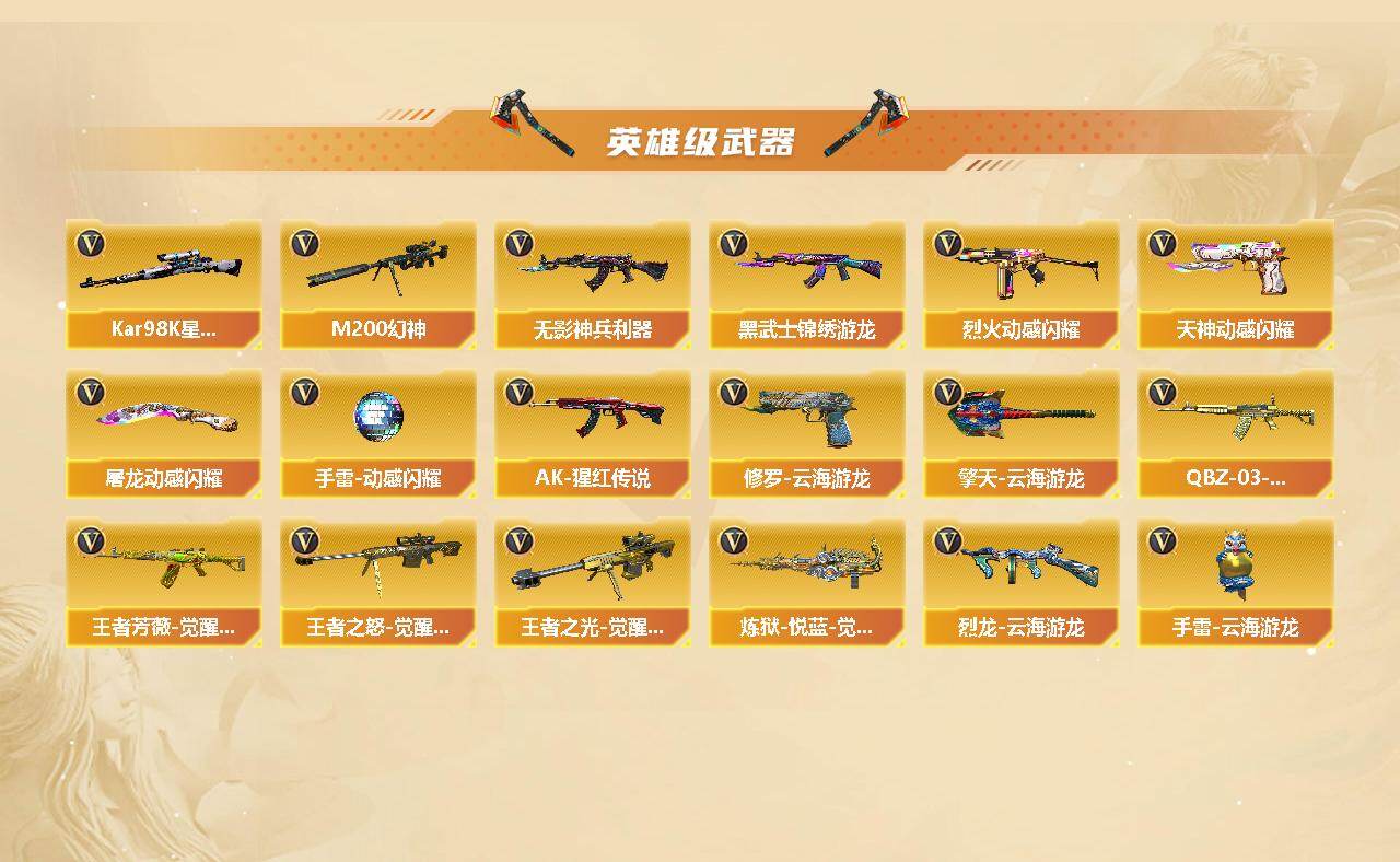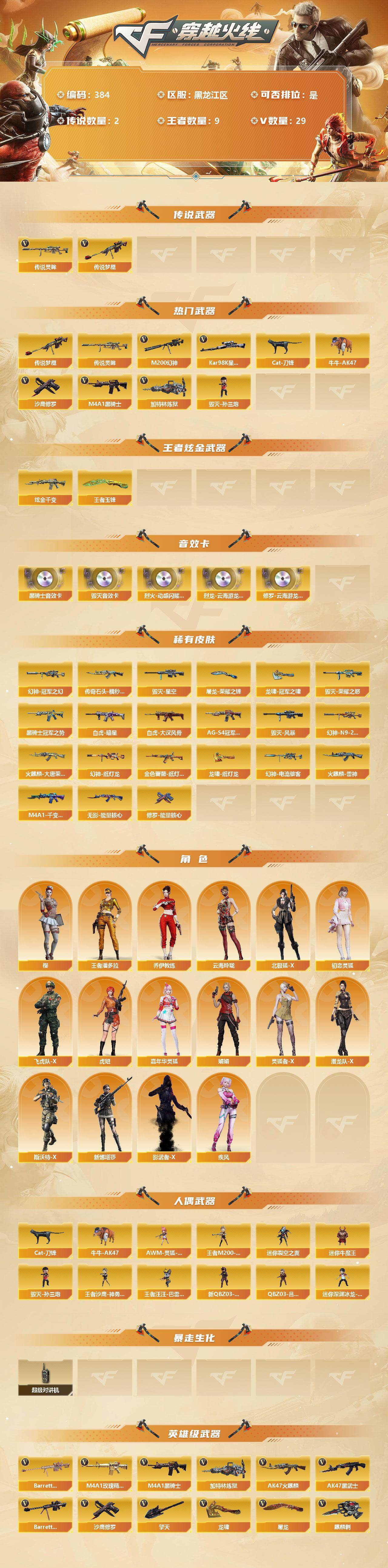 【384】黑龙江区-29v-9王者-1炫金 s(含四防属性角色)·10k点券道具 【传说武器】:传说梦魇,传说灵眸 【热门武器】:传说梦魇,传说灵眸,m200-幻神,kar98k-星神,cat-刀锋,牛牛-ak47,m4a1-黑骑士,加特林-炼狱2,毁灭-孙三炮,沙鹰-修罗2 【王者炫金武器】:王者玉锋,炫金千变 【音效卡】:烈火-动感闪耀 音效卡,烈龙-云海游龙音效卡,修罗-云海游龙音效卡,m4a1-黑骑士音效卡2,barrett-毁灭音效卡 【皮肤】:幻神-冠军之幻,m200-幻神-n9-2022mvp,幻神-纸灯龙皮肤,幻神-电流骇客 皮肤,scar light-白虎-暗星,白虎-大汉风骨,金色蔷薇-纸灯龙皮肤,火麒麟-雷神,传奇石头-横秒之巅,火麒麟-大唐荣光,毁灭-荣耀之怒,毁灭-星空,毁灭-风暴,m4a1-千变-孔明皮肤,黑骑士-冠军之势,黑骑士-ag-s4冠军典藏,无影-能量核心,修罗-能量核心,屠龙-荣耀之锋,龙啸-冠军之啸,龙啸-纸灯龙皮肤 【角色】:樱,王者潘多拉,乔伊教练,云海玲珑,北极狐-x,初恋灵狐,飞虎队-x,虎妞,嘉年华灵狐,疾风,娟娟,灵狐者-x,潜龙队-x,斯沃特-x,新娜塔莎,影武者-x 【人偶武器】:毁灭-孙三炮,王者m200-无畏金戈,王者沙鹰-神勇金戈,王者汪汪-芭蕾特,awm-灵狐-15周年嘉年华,cat-刀锋,牛牛-ak47,迷你裂空之翼,迷你牛魔王,新q03-精英斯沃特,迷你深渊冰龙-王绿豆,q03-吕布-刀锋 【暴走生化】:超级对讲机 【英雄级武器】:ak47-火麒麟,m4a1-黑骑士,ak47-黑武士,无影-神兵利器,黑武士-锦绣游龙,m4a1-玫瑰精灵,烈火-动感闪耀,ak-47-猩红传说,q-03-王者蔷薇-觉醒版,王者芳薇-觉醒版,barrett-毁灭,m200-幻神,kar98k-星神,barrett-金色蔷薇,王者之怒-觉醒版,王者之光-觉醒版,加特林-炼狱2,炼狱-悦蓝-觉醒版,烈龙-云海游龙,沙鹰-修罗2,天神-动感闪耀,修罗-云海游龙,屠龙,龙啸,擎天,麒麟刺,屠龙-动感闪耀,擎天-云海游龙,手蕾-动感闪耀,手蕾-云海游龙 【道具】:云海游龙炫彩背包,超级背包,绿色巨人,灵魂忍者,迷雾幽灵,夺命之镰,防化服2,星辰流光-呛王排位,呛王排位28赛季金色流光,动感闪耀表情,云海游龙表情,c4-沙漠,防弹头盔4,防弹衣6,c4工具钳3,手蕾包3 【特殊呛械】:1黑骑士,2炼狱
