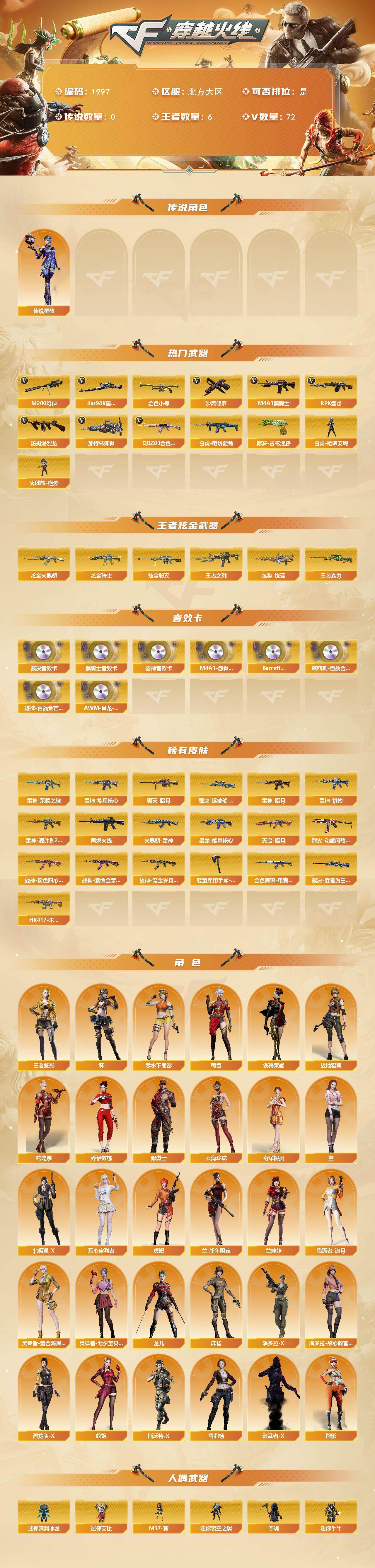 【1997】特代11877可排位-可二次【北方大区/69v/vip4/1传说】【传说星骇/裁决三件套】【m200-幻神】【kar98k-星神】【awm-裁决/awm-裁决音效卡/裁决-胜者为王/百城皮肤/运输船】【王者之幻】【vsk-94-金蚀】【q03-金色蔷薇】【m4a1-雷神2/m4a1-雷神音效卡/m4a1-雷神-拼搏/雷神-荣耀之魄/雷神-暗月/雷神-能量核心】【barrett-毁灭/毁灭-暗月】【ak47-火麒麟/火麒麟-cfstar/火麒麟-雷神】【m4a1-黑骑士/m4a1-黑骑士音效卡/黑骑士-海王】【m4a1-黑龙/黑龙-能量核心】【烈火-动感闪耀 皮肤】【无影-神兵利器】【ak47-黑武士】【天龙-cfstar】【汤姆逊-烈龙】【rpk-盘龙】【加特林-炼狱/炼狱-悦蓝】【沙鹰-修罗/修罗-cfstar】【沙鹰-天神3】【王者-魅影/龙儿/奇洋探员/云海玲珑/乔伊教练/修道士/零-水下丽影/兰-新年限定/麻雀/灵狐者-黄金海岸/雪莉杨/蜀雪/潘多拉-x/斯沃特-x/救世主-x/影武者-x/铁骑荣耀/幻影/复仇者】【m4a1-龙血/m4a1-猎神】【白虎-电玩蓝兔/ak47-b-战士/ak-47-猩红传说2】【aa-12-雷霆/ak12-天启/天启-暗月】【colt1911-小故障/毛瑟-玄龙/colt 1911-大黄蜂2/cop 357-青龙2/新usp-呛王排位奖励4】【迷你深渊冰龙2】【神圣爆裂者iii/神圣爆裂者-末日iii/激光毁灭者iii-白马银呛/激光毁灭者iii/ak47-冰龙粉碎者/冰龙粉碎者-白马银呛】【白虎-呛娘安妮/火麒麟-绝迹/m37-葵/迷你裂空之翼/夺魂/金色小号】【王者玄武/王者之戮】【闪光丹-神工天巧/盐雾蛋-神工天巧】【炫金火麒麟/炫金骑士/炫金毁灭】【超级护目镜/透明头盔/超级对讲机/超级背包/炫彩背包/防弹头盔/防弹衣/c4工具钳/手蕾包3/防化服3】截图展示段位不代表实际段位,如赛季更新等不/拒因素发生变化、时限道具不保证所剩时间