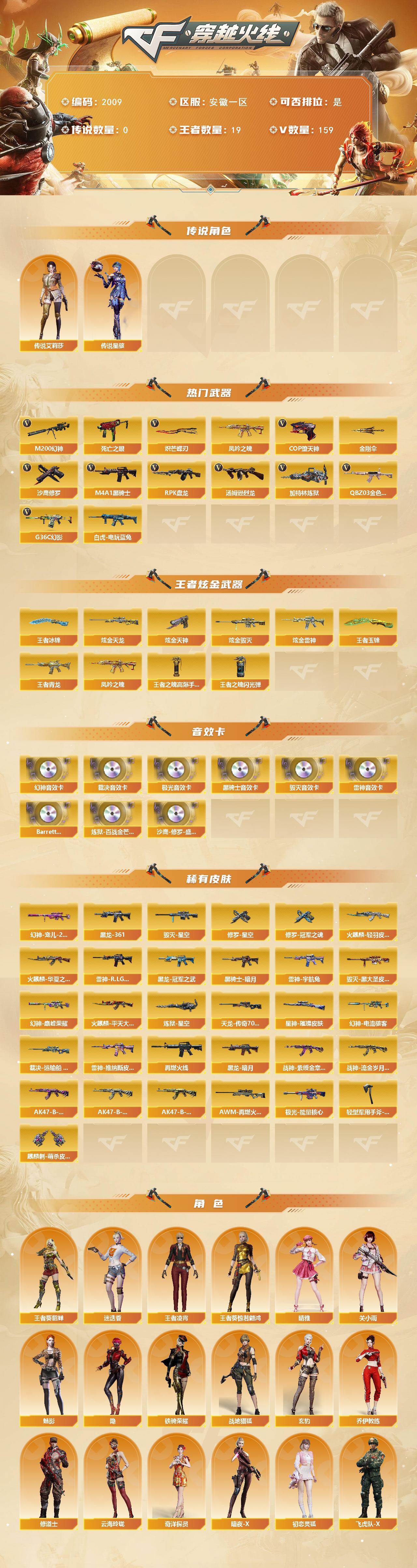 【2009】特10779可排位-可二次【安徽一区/170v/vip6/2传说】【纯白无封号/四防传说艾莉莎/传说星骇/幻神三件套/裁决三件套/玄豹套/堕天神套/6烈龙清道夫/6盘龙炼狱/蝴蝶刀/g36c幻影/6修罗/10套雷/3四防角色】【m200-幻神/m200-幻神音效卡/幻神-宠儿-2021mvp/幻神-巅峰荣耀/幻神-电流骇客 皮肤】【王者星神】【awm-裁决/awm-裁决音效卡/裁决-运输船】【炽芒蝶刃】【g36c-幻影】【usp-神工天巧】【q03-金色蔷薇2】【q03-天罚】【m4a1-雷神3/m4a1-雷神音效卡/雷神-r.lgd-cfpls18冠军/雷神-宇航兔皮肤/雷神-维纳斯皮肤】【cop-堕天神】【barrett-毁灭2/barrett-毁灭音效卡/芭蕾特-毁灭-cfpl冠军/毁灭-星空】【ak47-火麒麟/火麒麟-cfstar3/火麒麟-轻羽皮肤/火麒麟-华夏之心/火麒麟-平天大圣】【m4a1-黑骑士3/m4a1-黑骑士音效卡】【m4a1-黑龙/黑龙-冠军之武/m4a1-黑龙-361】【无影-神兵利器】【ak47-黑武士】【awm-天龙/天龙-cfstar/awm-天龙-传奇70kg】【barrett-极光2/barrett-极光音效卡/极光-能量核心】【m4a1-千变】【汤姆逊-烈龙6】【rpk-盘龙7】【加特林-炼狱/炼狱-星空】【死亡之眼】【沙鹰-修罗6/修罗-cfstar/修罗-冠军之魂/修罗-星空】【天神-动感闪耀】【麒麟刺4/麒麟刺-萌杀皮肤】【擎天2/擎天-惨叫迹】【屠龙4/屠龙-动感闪耀】【龙啸-堕天神2/龙啸-烈火龙威】【隐/晴雅/关小雨/王者凌霄/王者葵-惊若翩鸿/王者-葵-貂蝉/魅影/迷迭香/龙儿/龙儿-小淘气/暗夜-x/铁骑-乘风破浪/木兰/奇洋探员/云海玲珑/乔伊教练/修道士/兔囡囡/萌儿/麻雀/紫霞/雪莉杨/娟娟/潘多拉-x/斯沃特-x/救世主-x/铁骑荣耀/幻影】【m4a1-玫瑰精灵/m4a1-猎神/m4a1-堕天神2】【白虎-电玩蓝兔/scar light-像素/ak47-b-常胜将军/ak47-b-身先士卒/ak47-b-战士/ak-47-猩红传说2】【aa-12-雷霆/ak12-天启5】【barrett-暗月传说3】【colt1911-小故障2/colt 1911-大黄蜂2/柯尔特-萌杀/cop 357-青龙2/新usp-呛王排位奖励】【金刚伞/金刚伞-电玩红兔/唐刀-神工天巧】【神圣爆裂者-末日iii/激光毁灭者iii/冰龙粉碎者-白马银呛/巨龙咆哮-深渊金】【斯泰尔-巧克力/轻型军用手斧-镜】【猫猫手套/m4a1-雷神-精英刀锋2/雷神-葫芦兄弟/火麒麟-灵狐/m37-葵/芭蕾特-零-水下丽影/迷你宝贝/天龙-曼陀罗/夺魂/街机小灰机】【王者青龙/王者玄武/凤吟之魄/王者之心/王者之魄/王者之势/王者之决/王者之击/王者之啸/王者玉锋】【高爆手蕾-堕天神7/闪光丹-堕天神7/盐雾蛋-堕天神7】【高爆手蕾-神工天巧/闪光丹-神工天巧2/盐雾蛋-神工天巧】【炫金雷神/炫金毁灭/炫金天龙/炫金天神2】【超级护目镜/透明护目镜/烟雾保护头盔/闪光护目镜/超级背包/防弹头盔5/防弹衣5/c4工具钳5/手蕾包5/防化服3】截图展示段位不代表实际段位,如赛季更新等不/拒因素发生变化、时限道具不保证所剩时间