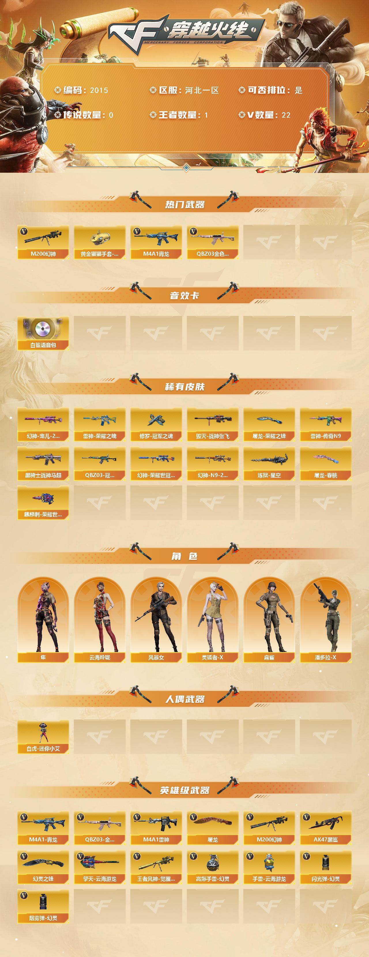 【2015】特50919可排位-可二次【河北一区/21v/vip1】【幻神三皮肤/王者风神/q带皮/白虎迷你小艾】【m200-幻神/幻神-宠儿-2021mvp/m200-幻神-n9-2022mvp/m200-幻神-荣耀世冠白鲨】【王者风神】【黄金猫猫手套-白鲨】【q03-金色蔷薇/q03-冠军之薇】【隼】【m4a1-雷神/雷神-荣耀之魄/雷神-传奇n9】【毁灭-战神张飞】【黑骑士-战神马超】【炼狱-星空】【修罗-cfstar/修罗-冠军之魂2】【麒麟刺-荣耀世冠白鲨】【擎天-云海游龙】【屠龙/屠龙-荣耀之锋/屠龙-春桃 皮肤】【龙啸-烈火龙威】【云海玲珑/麻雀/潘多拉-x】【m4a1-青龙】【ak47-黑鲨】【colt1911-小故障/colt 1911-大黄蜂/新usp-呛王排位奖励3】【斯泰尔-巧克力2】【白虎-迷你小艾】【手蕾-云海游龙】【高爆手蕾-幻灵2/闪光丹-幻灵2/盐雾蛋-幻灵3】【白鲨语音包/语音特效-云海游龙】【超级护目镜/防弹头盔/防弹衣/c4工具钳/手蕾包/防化服】截图展示段位不代表实际段位,如赛季更新等不/拒因素发生变化、时限道具不保证所剩时间