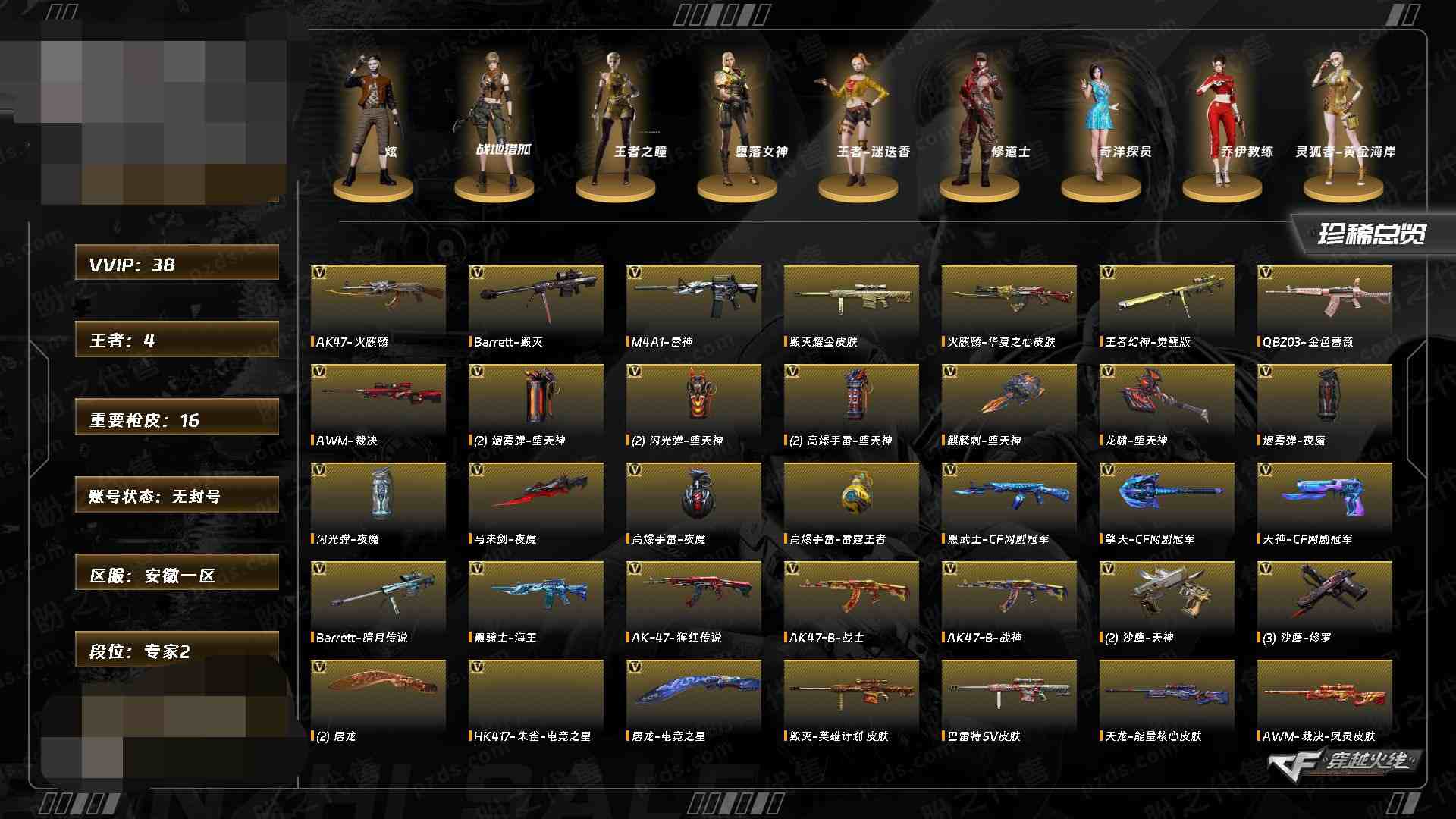 专家2】【Lv.100 元首】VIP6 38V,4王者,毁灭英雄计划 毁灭耀金巴雷特SV天龙能量核心裁决凤灵火麒麟AG火麒麟华夏之心AK47雷神雷神化蛇 雷神暗月_炫战地猎狐幻面灵狐王者幻神-觉醒版Barrett-毁灭Barrett-暗月传说AWM-裁决M4A1-雷神网剧冠军套装M4A1-黑骑士音效卡AK47-火麒麟音效卡Barrett-毁灭音效卡(截图展示段位不代表实
