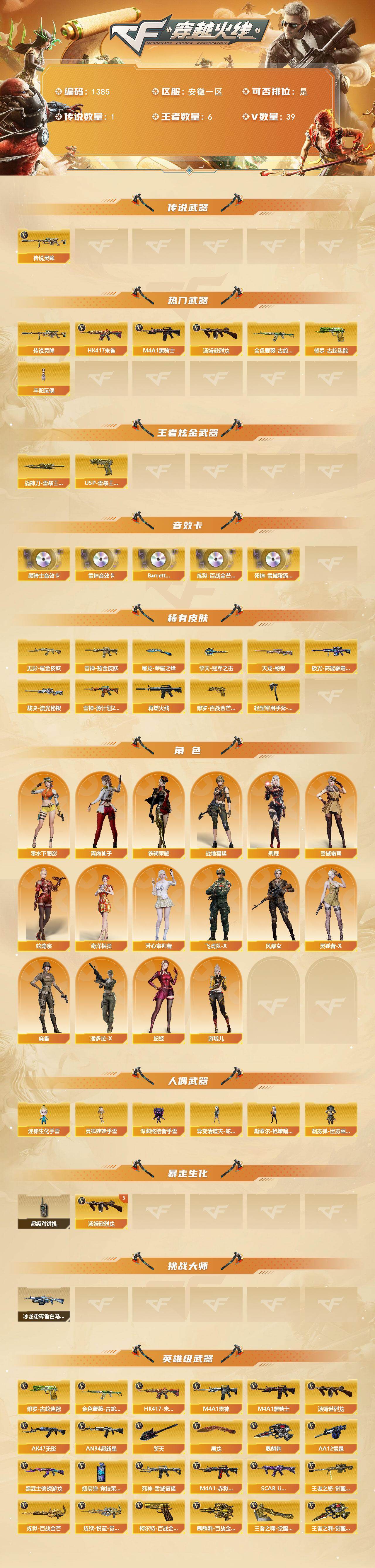[16127535]安徽一区-39v-6王者-0炫金 【传说武器】:传说灵眸 【热门武器】:传说灵眸,hk417-朱雀,金色蔷薇-古蛇迷踪,修罗-古蛇迷踪,m4a1-黑骑士,汤姆逊-烈龙5,羊驼玩偶 【王者炫金武器】:usp-雷暴王者,斩神刀-雷暴王者 【音效卡】:m4a1-雷神音效卡,m4a1-黑骑士音效卡,barrett-碧霄极光音效卡2,炼狱-百战金芒-庆典舞曲音效卡,死神-雪域霜狐-怀旧音效卡 【皮肤】:裁决-流光秘银,雷神-耀金皮肤,雷神-源计划2.0专属 皮肤,m4a1-再燃火线,无影耀金皮肤,天龙-秘银,极光-高能霹雳 皮肤,修罗-百战金芒 皮肤,屠龙-荣耀之锋2,轻型军用手斧-再燃火线,擎天-冠军之击 【角色】:荆棘,战地猎狐,雪域霜狐,蛇隐宗,奇洋探员,芳心审判者,飞虎队-x,风暴女,零-水下丽影,灵狐者-x,麻雀,潘多拉-x,青霞仙子,蛇姬,铁骑荣耀,游珑儿 【人偶武器】:异变清道夫-蛇影双骄2,斯泰尔-呛娘暗刃,迷你生化手蕾2,深渊终结者手蕾,灵狐娃娃手蕾2,盐雾蛋-迷雾幽灵 【暴走生化】:超级对讲机 【挑战大师】:冰龙粉碎者-白马银呛2 【英雄级武器】:m4a1-雷神,m4a1-黑骑士,ak47-无影,an94-超新星,hk417-朱雀,黑武士-锦绣游龙,金色蔷薇-古蛇迷踪,死神-雪域霜狐,scar light-玄豹,王者之怒-觉醒版,炼狱-百战金芒,炼狱-悦蓝-觉醒版,汤姆逊-烈龙5,aa-12-雷霆,柯尔特-百战金芒,修罗-古蛇迷踪,屠龙2,擎天,麒麟刺2,麒麟刺-百战金芒,王者之啸-觉醒版,王者之刺-觉醒版,丛林匕首-玄豹,高爆手蕾-雷暴,手蕾-热带奇洋,高爆手蕾-古蛇迷踪,闪光丹-雷暴,闪光丹-堕天神,盐雾蛋-竞技荣光,盐雾蛋-古蛇迷踪,盐雾蛋-荣耀世冠ep,m4a1-赤狱骑士,m4a1-苍鸣雷神,barrett-碧霄极光 【道具】:云山科技背包,云海游龙炫彩背包,古蛇迷踪炫彩背包,奇洋探员-海龟背包,百战金芒炫彩背包,臻选金狐背包,超级背包,雪域霜狐炫彩背包,女皇终结者-魔龙之吻,救世主-黑桃战神,绿色巨人,灵魂忍者,变异宝贝,生化弹匣,夺命之镰,防化服2,语音特效-盛典烟火,语音特效-怀旧,古蛇迷踪打击特效,雪域霜狐表情,萌萌小葵表情,炽雪表情,防弹头盔3,防弹衣3,c4工具钳3,手蕾包3 【特殊呛械】:1黑骑士,5烈