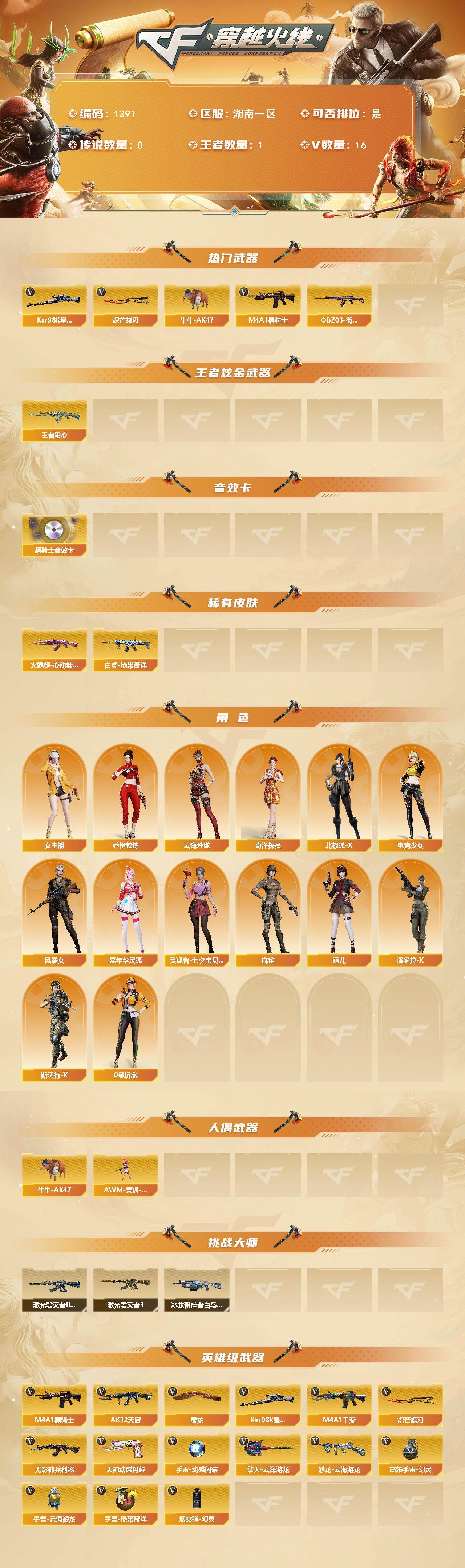 [16128058]湖南一区-16v-1王者-0炫金 【热门武器】:q03-街机,kar98k-星神,牛牛-ak47,m4a1-黑骑士,炽芒蝶刃 【王者炫金武器】:王者霜心 【音效卡】:m4a1-黑骑士音效卡 【皮肤】:白虎-热带奇洋 皮肤,火麒麟-心动糖果 【角色】:奇洋探员,乔伊教练,云海玲珑,北极狐-x,电竞少女,风暴女,嘉年华灵狐,0号玩家,灵狐者-七夕宝贝,麻雀,萌儿,女主播,潘多拉-x,斯沃特-x 【人偶武器】:awm-灵狐-15周年嘉年华,牛牛-ak47 【挑战大师】:冰龙粉碎者-白马银呛,激光毁灭者iii-白马银呛,激光毁灭者iii 【英雄级武器】:m4a1-千变,m4a1-黑骑士,ak12-天启,无影-神兵利器,kar98k-星神,烈龙-云海游龙,天神-动感闪耀,屠龙,炽芒蝶刃,擎天-云海游龙,高爆手蕾-幻灵2,手蕾-动感闪耀,手蕾-云海游龙,手蕾-热带奇洋,盐雾蛋-幻灵2 【道具】:cfs限定背包,云海游龙炫彩背包,全能呛王背包,炫彩背包,生化弹匣,夺命之镰,防化服,金色流光-呛王排位2,星辰流光-呛王排位,呛王排位28赛季金色流光,呛王排位29赛季金色流光,云海游龙表情,c4-沙漠,防弹头盔2,防弹衣2,c4工具钳2,手蕾包2 【特殊呛械】:1黑骑士