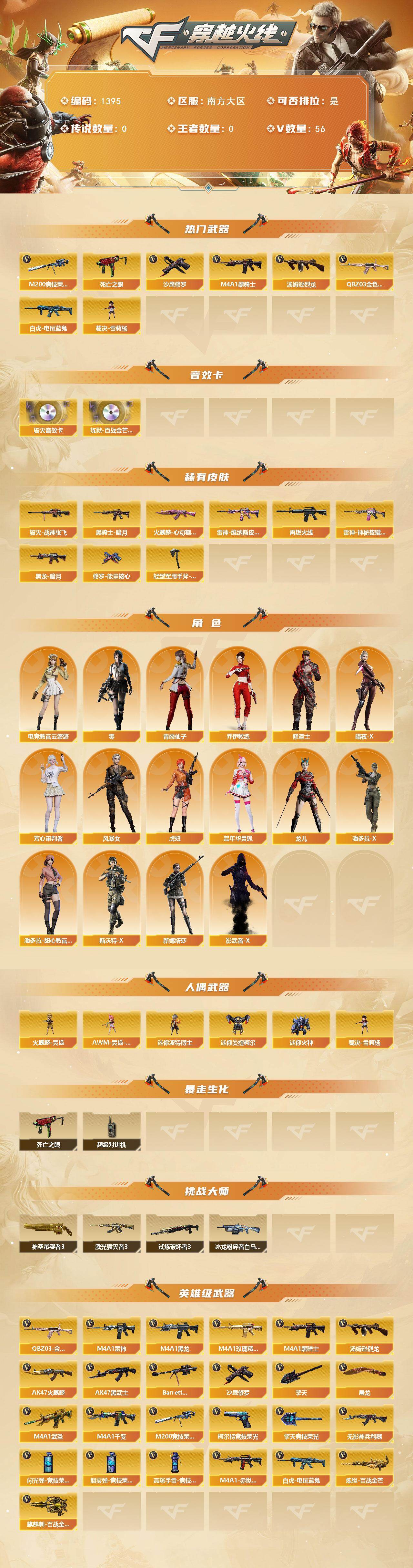 [16128283]南方大区-56v-0王者-0炫金 【热门武器】:q03-金色蔷薇,m200-竞技荣光,死亡之眼2,白虎-电玩蓝兔,m4a1-黑骑士,汤姆逊-烈龙,裁决-雪莉杨,沙鹰-修罗 【音效卡】:barrett-毁灭音效卡,炼狱-百战金芒-庆典舞曲音效卡 【皮肤】:雷神-维纳斯皮肤,m4a1-再燃火线,雷神-神秘按键 皮肤,火麒麟-心动糖果,毁灭-战神张飞,黑龙-暗月,黑骑士-暗月,修罗-能量核心,轻型军用手斧-再燃火线 【角色】:零,电竞教官-云悠悠,乔伊教练,修道士,暗夜-x,芳心审判者,风暴女,虎妞,嘉年华灵狐,龙儿,潘多拉-x,潘多拉-甜心教官,青霞仙子,斯沃特-x,新娜塔莎,影武者-x 【人偶武器】:裁决-雪莉杨,火麒麟-灵狐,awm-灵狐-15周年嘉年华2,迷你波特博士,迷你曼提柯尔,迷你火种 【暴走生化】:死亡之眼2,超级对讲机 【挑战大师】:神圣爆裂者iii,冰龙粉碎者-白马银呛,激光毁灭者iii,试炼破坏者iii 【英雄级武器】:m4a1-千变,ak47-火麒麟2,m4a1-黑龙,m4a1-雷神2,m4a1-黑骑士,ak47-黑武士,m4a1-武圣,无影-神兵利器,m4a1-玫瑰精灵,q03-金色蔷薇,白虎-电玩蓝兔,barrett-毁灭3,m200-竞技荣光,炼狱-百战金芒,汤姆逊-烈龙,沙鹰-修罗,柯尔特-竞技荣光,屠龙2,擎天,擎天-竞技荣光,麒麟刺-百战金芒,高爆手蕾-竞技荣光7,闪光丹-竞技荣光7,盐雾蛋-竞技荣光7,m4a1-赤狱骑士 【道具】:cfs限定背包,战舰背包,机械魔影背包-红色,炫彩背包,百战金芒炫彩背包,超级背包,女皇终结者-魔龙之吻,救世主-黑桃战神,妩媚妖姬,绿色巨人,灵魂忍者2,妖姬,迷雾幽灵,夺命之镰,防化服2,金色流光-呛王排位2,星辰流光-呛王排位,呛王排位29赛季金色流光,语音特效-盛典烟火,萌萌小葵表情,防弹头盔6,防弹衣6,c4工具钳7,手蕾包5 【特殊呛械】:1黑骑士,1烈龙