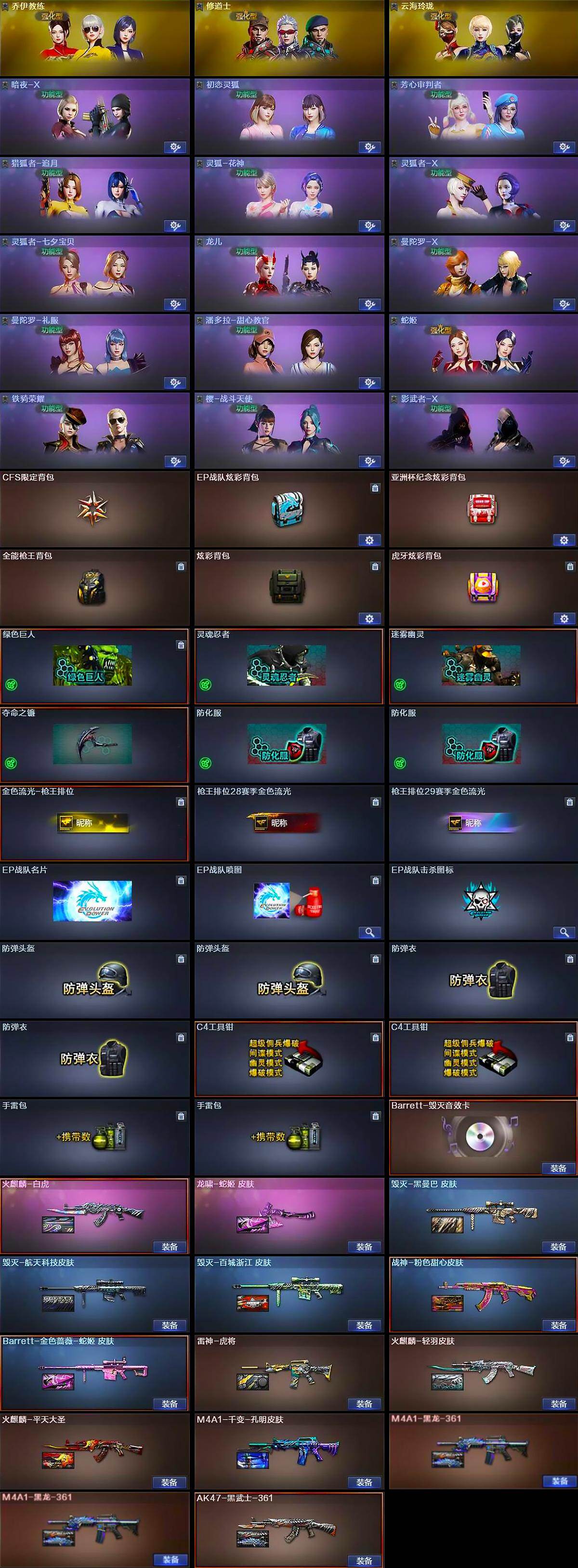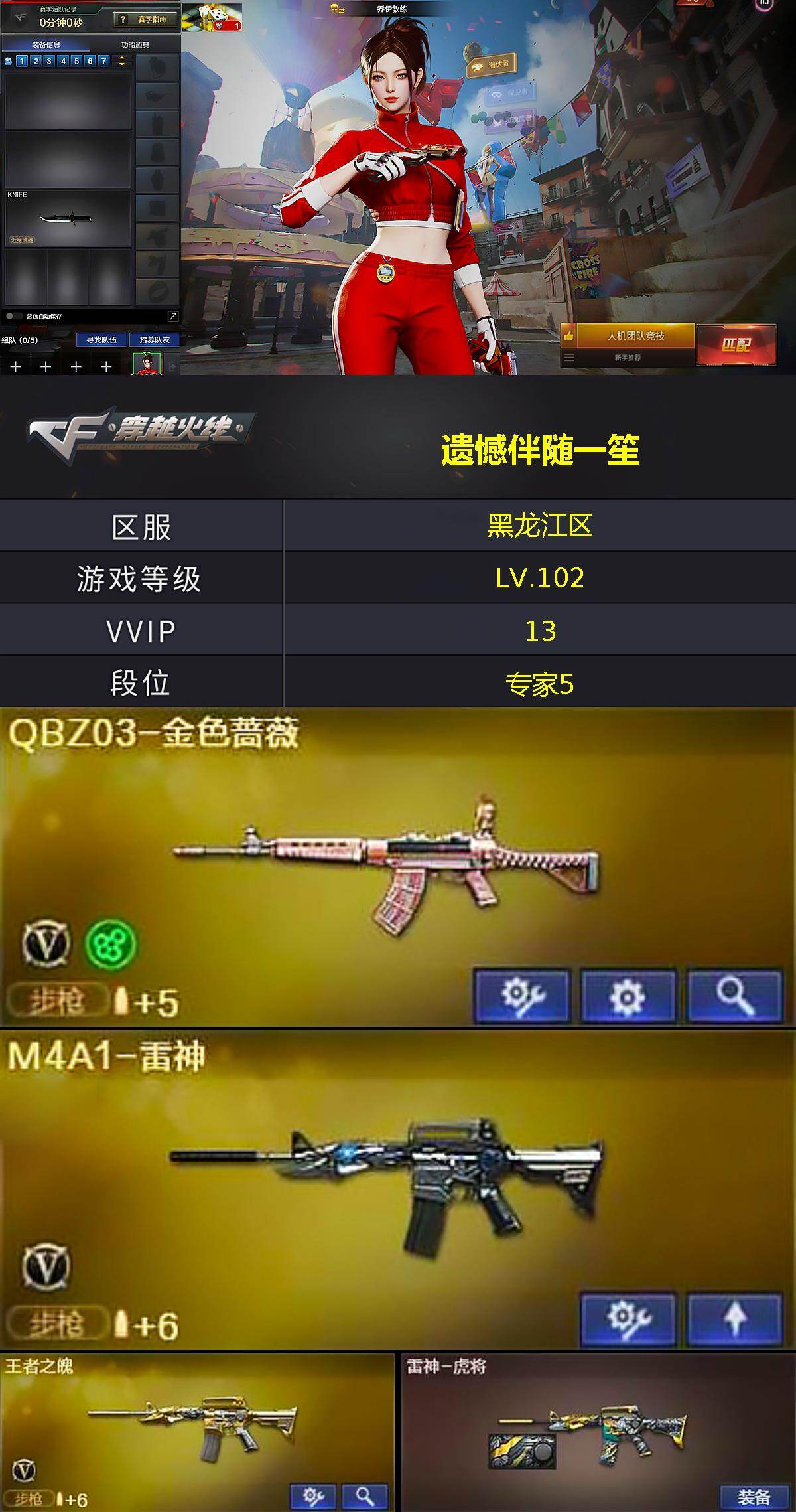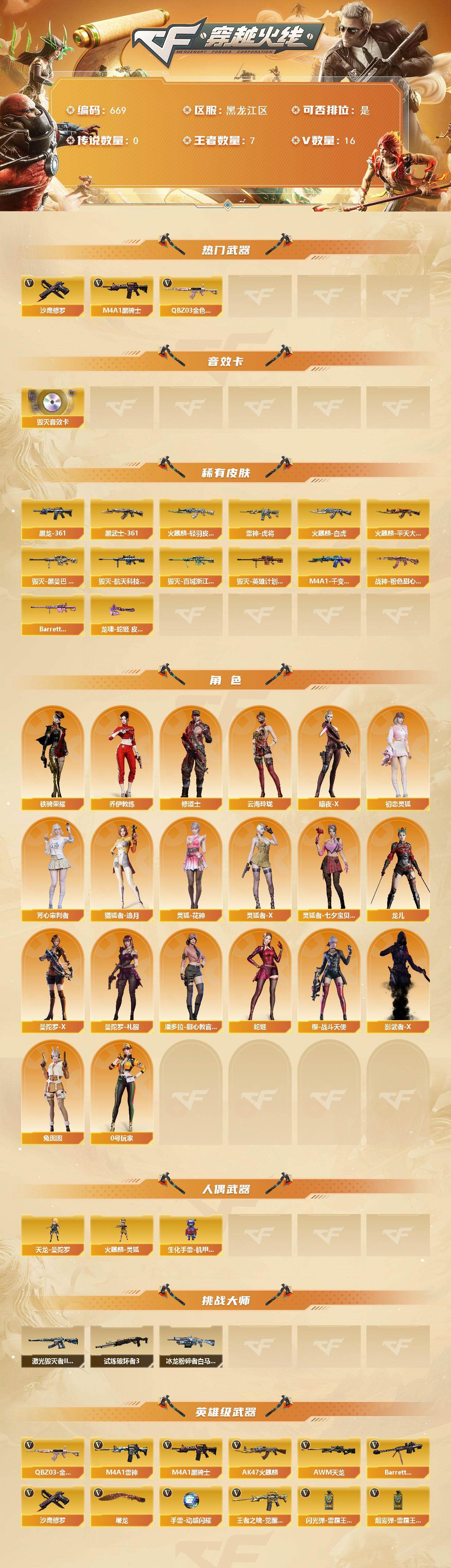 黑龙江区-16v-7王者-0炫金 【热门武器】:q03-金色蔷薇,m4a1-黑骑士,沙鹰-修罗4 【音效卡】:barrett-毁灭音效卡 【皮肤】:雷神-虎将,火麒麟-轻羽皮肤,火麒麟-平天大圣,火麒麟-白虎,毁灭-黑曼巴 皮肤,毁灭-航天科技皮肤,毁灭-百城浙江 皮肤,毁灭-英雄计划 皮肤,m4a1-千变-孔明皮肤,m4a1-黑龙-3612,ak47-黑武士-361,战神-粉色甜心皮肤,barrett-金色蔷薇-蛇姬 皮肤,龙啸-蛇姬 皮肤 【角色】:乔伊教练,修道士,云海玲珑,暗夜-x,初恋灵狐,芳心审判者,猎狐者-追月,0号玩家,灵狐-花神,灵狐者-x,灵狐者-七夕宝贝,龙儿,曼陀罗-x,曼陀罗-礼服,潘多拉-甜心教官,蛇姬,铁骑荣耀,兔囡囡,樱-战斗天使,影武者-x 【人偶武器】:天龙-曼陀罗,火麒麟-灵狐,生化手蕾-机甲核心 【挑战大师】:冰龙粉碎者-白马银呛2,激光毁灭者iii-白马银呛,试炼破坏者iii 【英雄级武器】:ak47-火麒麟,m4a1-雷神,m4a1-黑骑士,q03-金色蔷薇,王者之魄-觉醒版,awm-天龙,barrett-毁灭,沙鹰-修罗4,屠龙,手蕾-动感闪耀,闪光丹-雷霆王者-觉醒版,盐雾蛋-雷霆王者-觉醒版4 【道具】:cfs限定背包,ep战队炫彩背包,亚洲杯纪念炫彩背包,全能呛王背包,炫彩背包,虎牙炫彩背包,哔哩哔哩名片,绿色巨人,灵魂忍者,迷雾幽灵,夺命之镰,防化服2,金色流光-呛王排位,呛王排位28赛季金色流光,呛王排位29赛季金色流光,ep战队名片,ep战队喷图,ep战队击杀图标,防弹头盔2,防弹衣2,c4工具钳2,手蕾包2 【特殊呛械】:1黑骑士