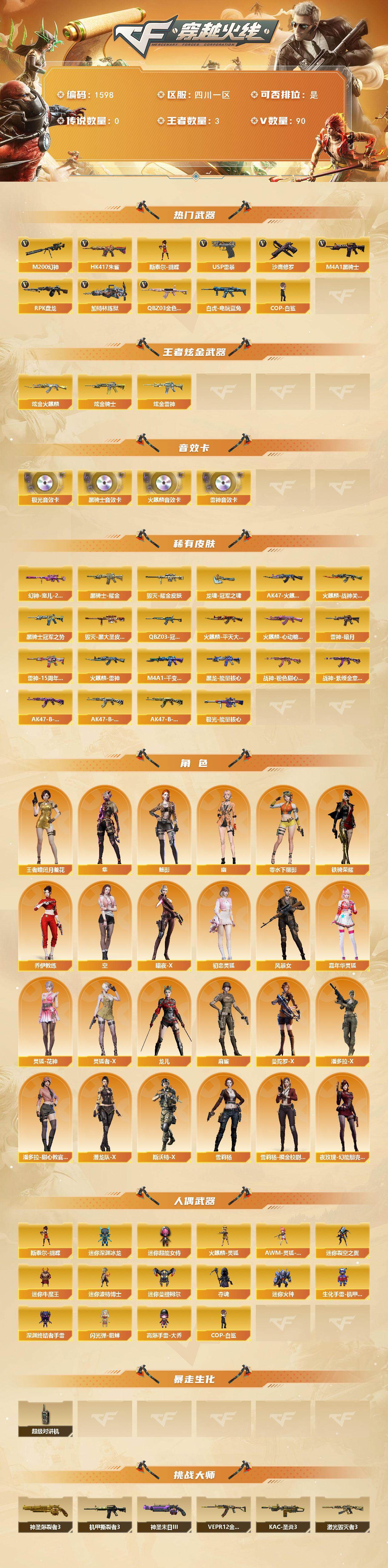 【1598】贝18633可排位-可二次【四川一区/90v/vip1】【无十年记录/8位qq不带4/幻神宠儿/网剧套装/5机呛/夜魔套/6修罗/10手呛/8套雷/四防隼/雷神三件套/黑骑士三件套/a背包拓展】【m200-幻神/幻神-宠儿-2021mvp】【王者幻神】【usp-雷暴】【q03-金色蔷薇/q03-冠军之薇】【白虎-电玩蓝兔】【m4a1-雷神2/m4a1-雷神音效卡/m4a1-雷神-白鲨皮肤/雷神-暗月】【破空呛刃-夜魔】【barrett-毁灭2/芭蕾特-毁灭-cfpl冠军/毁灭耀金皮肤】【ak47-火麒麟3/ak47-火麒麟音效卡/ak47-火麒麟-传奇even/火麒麟-cfstar3/火麒麟-心动糖果/火麒麟-战神关羽/火麒麟-雷神/火麒麟-平天大圣】【m4a1-黑骑士3/m4a1-黑骑士音效卡/黑骑士-冠军之势/黑骑士-海王3/黑骑士耀金皮肤】【m4a1-黑龙/黑龙-能量核心】【hk417-朱雀】【ak47-无影2】【黑武士-cf网剧冠军】【awm-天龙3】【barrett-极光音效卡/极光-能量核心】【awm-裁决】【m4a1-千变-孔明皮肤】【rpk-盘龙3】【加特林-炼狱2】【斯泰尔-蝴蝶】【沙鹰-修罗6】【天神-动感闪耀/天神-cf网剧冠军】【麒麟刺】【擎天/擎天-cf网剧冠军】【屠龙2/屠龙-动感闪耀】【龙啸/龙啸-冠军之啸】【王者-瞳-闭月羞花/魅影/龙儿/暗夜-x/幽/乔伊教练/超能特工/零-水下丽影/灵狐-花神/麻雀/雪莉杨/潘多拉-x/斯沃特-x/铁骑荣耀/幻影/堕天使/复仇者】【m4a1-夜魔】【ak47-b-常胜将军2/ak47-b-身先士卒/ak47-b-战士2/ak47-b-战神/ak-47-猩红传说2】【ak47-黑鲨】【barrett-暗月传说】【colt,1911-大黄蜂7/cop,357-青龙2/新usp-呛王排位奖励5】【斩神刀/金刚伞-电玩红兔/迷你深渊冰龙/马来剑-夜魔】【神圣爆裂者iii/神圣爆裂者-末日iii/机甲撕裂者iii/vepr-12-金魔/kac-圣炎切割者iii/激光毁灭者iii/ak47-冰龙粉碎者/冰龙粉碎者-白马银呛】【斯泰尔-巧克力】【猫猫手套/cop-白鲨/火麒麟-灵狐/迷你裂空之翼3/夺魂】【王者之魄】【高爆手蕾-雷暴4/闪光丹-雷暴4/盐雾蛋-雷暴4】【高爆手蕾-夜魔4/闪光丹-夜魔4/盐雾蛋-夜魔4】【炫金火麒麟/炫金雷神/炫金骑士】【超级护目镜/透明头盔/透明护目镜/超级对讲机/超级背包/炫彩背包/防弹头盔8/防弹衣9/c4工具钳3/手蕾包6/防化服3】截图展示段位不代表实际段位,如赛季更新等不/拒因素发生变化、时限道具不保证所剩时间 【稀有套装】:雷神三件套,黑骑士三件套