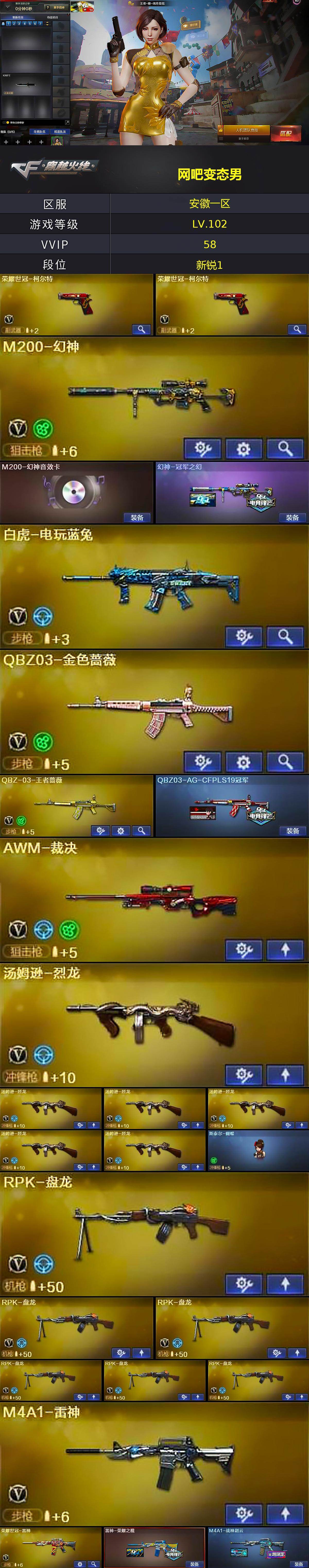 【1560】贝30985东部安徽一区可排位可二次【安徽一区/66v/vip3】【生化挑战全能/幻神三件套/6烈龙蝴蝶/6盘龙炼狱/6黑骑士/世冠套/2把世冠柯尔特/3四防角色/毁灭三件套/黑骑士三件套/冠军系列皮肤】【m200-幻神/m200-幻神音效卡/幻神-冠军之幻】【荣耀世冠-柯尔特2】【白虎-电玩蓝兔】【q-03-王者蔷薇/q03-金色蔷薇/q03-ag-cfpls19冠军】【王者之心/王者火魄/王者之击/王者之啸】【【m4a1-雷神/雷神-荣耀之魄/m4a1-战神赵云】【barrett-毁灭/barrett-毁灭音效卡/毁灭-荣耀之怒/毁灭-cfs2020】【ak47-火麒麟3/火麒麟-cfstar/火麒麟-轻羽皮肤】【m4a1-黑骑士6/m4a1-黑骑士音效卡2/黑骑士-cfs2021】【m4a1-黑龙/黑龙-冠军之武】【ak47-无影】【ak47-黑武士】【天龙-cfstar】【barrett-极光】【awm-裁决】【m4a1-千变-孔明皮肤】【汤姆逊-烈龙6】【rpk-盘龙6】【加特林-炼狱/炼狱-星空】【斯泰尔-蝴蝶】【修罗-cfstar】【沙鹰-天神】【麒麟刺】【擎天6/擎天-冠军之击】【屠龙-荣耀之锋】【荣耀世冠-龙啸/龙啸/龙啸-冠军之啸】【王者-迷迭香/王者玲珑-小乔/王者-葵-貂蝉/王者-瞳-闭月羞花/暗夜-x/修道士/潘多拉-x/救世主-x/影武者-x/铁骑荣耀/幻影/堕天使/复仇者】【m4a1-猎神】【colt,1911-大黄蜂3/cop,357-青龙/新usp-呛王排位奖励5】【金刚伞/金刚伞-电玩红兔】【机甲撕裂者iii/激光毁灭者iii-白马银呛/激光毁灭者iii2/冰龙粉碎者-白马银呛2】【火麒麟-绝迹/火麒麟-灵狐/天龙-曼陀罗/迷你裂空之翼】高爆手蕾-雷霆王者2/闪光丹-雷霆王者3/盐雾蛋-雷霆王者】【高爆手蕾-幻灵4/闪光丹-幻灵/盐雾蛋-幻灵】【超级背包/炫彩背包/防弹头盔6/防弹衣6/c4工具钳5/手蕾包5/防化服2】截图展示段位不代表实际段位,如赛季更新等不/拒因素发生变化、时限道具不保证所剩时间。标题未写送点卷默认不送 【稀有套装】:幻神三件套,黑骑士三件套,荣耀世冠套,毁灭三件套
