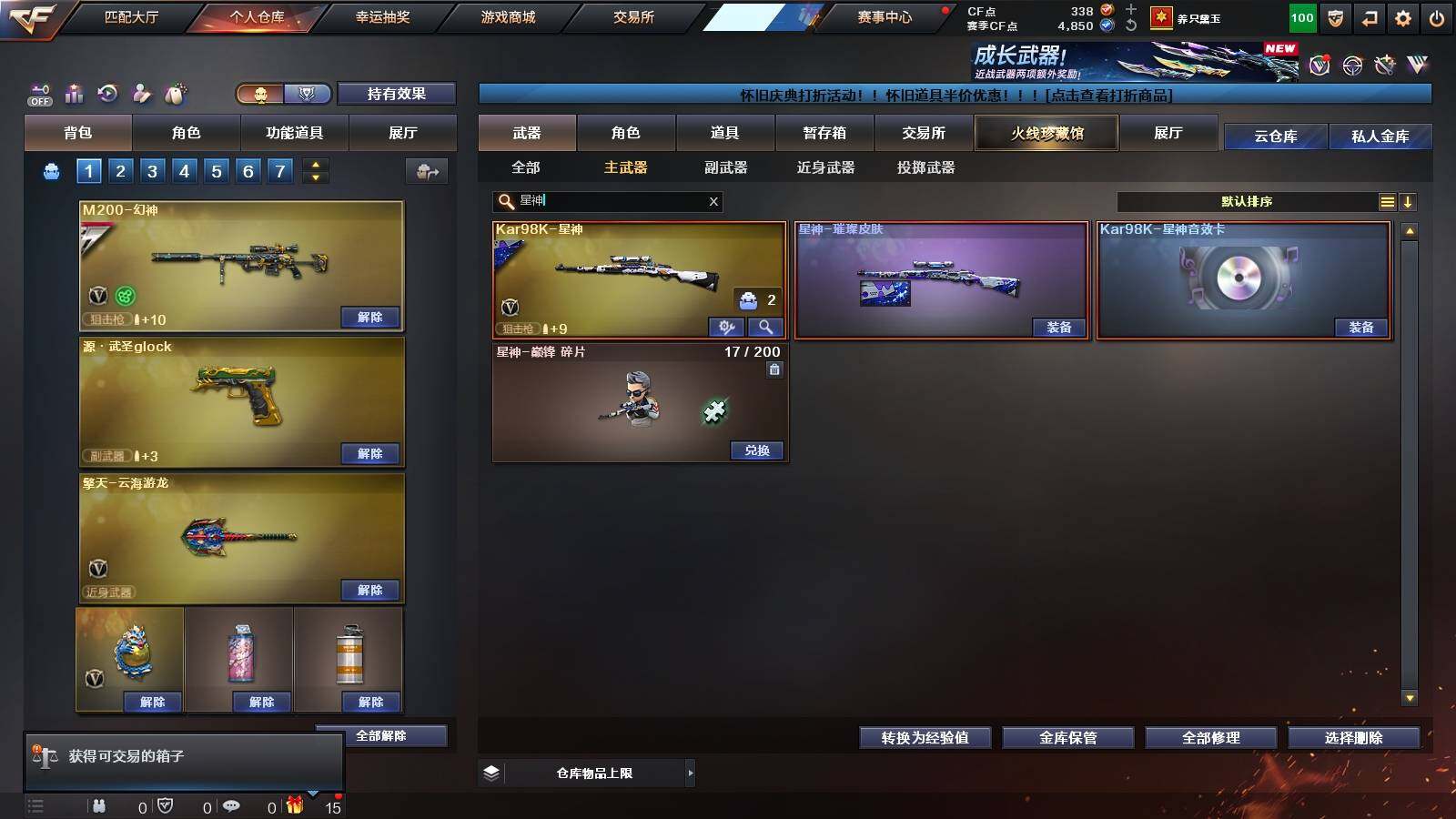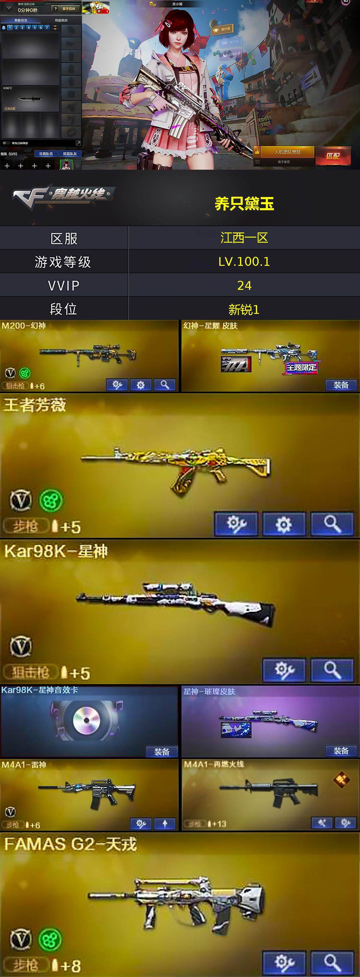 【1559】贝36636南部江西一区可排位可二次【江西一区/21v/vip4】【纯白无封号/幻神带皮肤/星神三件套】【m200-幻神/幻神-星耀,皮肤】【kar98k-星神/kar98k-星神音效卡/星神-璀璨皮肤】【famas,g2-天戎】【王者芳薇】【m4a1-雷神】【火麒麟-cfstar】【黑武士-锦绣游龙】【修罗-cfstar】【沙鹰-天神3】【擎天-云海游龙音效卡/擎天-云海游龙】【屠龙】【关小雨/王者凌霄/奇洋探员/云海玲珑/乔伊教练/麻雀】【m4a1-青龙2】【ak47-黑鲨】【超新星-热带奇洋】【colt1911-小故障/colt,1911-大黄蜂2/新usp-呛王排位奖励2】【龙啸-热带奇洋】【王者芳薇】【手蕾-云海游龙】【手蕾-热带奇洋】【炫金毁灭2】【语音特效-云海游龙】【烟雾保护头盔/闪光护目镜/超级背包/防弹头盔2/防弹衣2/c4工具钳2/手蕾包2/防化服2】截图展示段位不代表实际段位,如赛季更新等不/拒因素发生变化、时限道具不保证所剩时间。标题未写送点卷默认不送 【稀有套装】:星神三件套