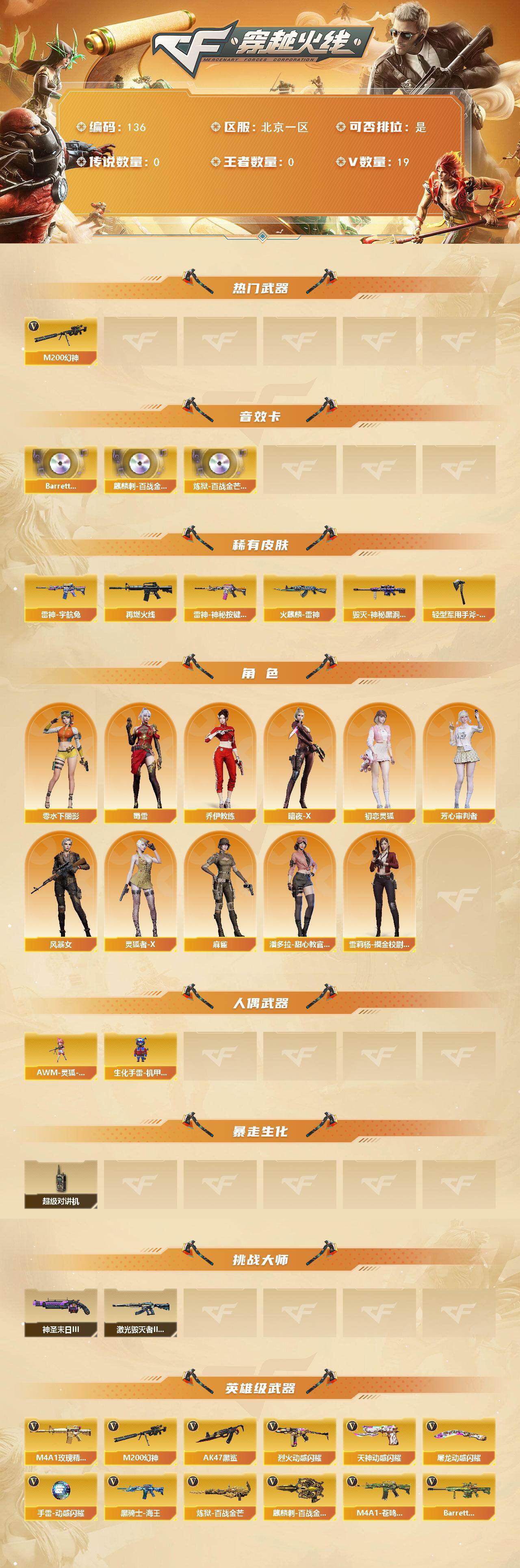 北京一区-19v-0王者-0炫金 【热门武器】:m200-幻神 【音效卡】:barrett-碧霄极光音效卡,麒麟刺-百战金芒-盛典舞曲音效卡,炼狱-百战金芒-庆典舞曲音效卡 【皮肤】:雷神-宇航兔皮肤,m4a1-再燃火线,雷神-神秘按键 皮肤,火麒麟-雷神,毁灭-神秘黑洞皮肤,轻型军用手斧-再燃火线 【角色】:乔伊教练,暗夜-x,初恋灵狐,芳心审判者,风暴女,零-水下丽影,灵狐者-x,麻雀,潘