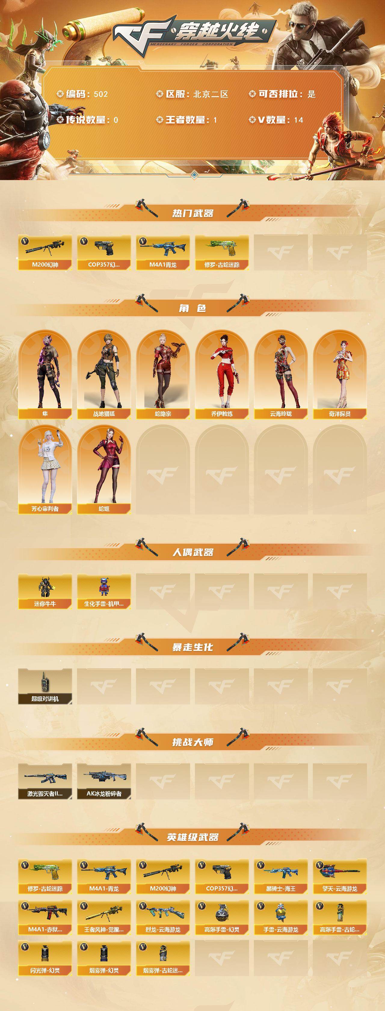 北京二区-14v-1王者-0炫金 【热门武器】:m4a1-青龙,m200-幻神,修罗-古蛇迷踪,cop 357-幻灵 【角色】:隼,战地猎狐,蛇隐宗,奇洋探员,乔伊教练,云海玲珑,芳心审判者,蛇姬 【人偶武器】:迷你牛牛,生化手蕾-机甲核心 【暴走生化】:超级对讲机 【挑战大师】:ak47-冰龙粉碎者,激光毁灭者iii-白马银呛 【英雄级武器】:m4a1-青龙,黑骑士-海王,m200-幻神,王