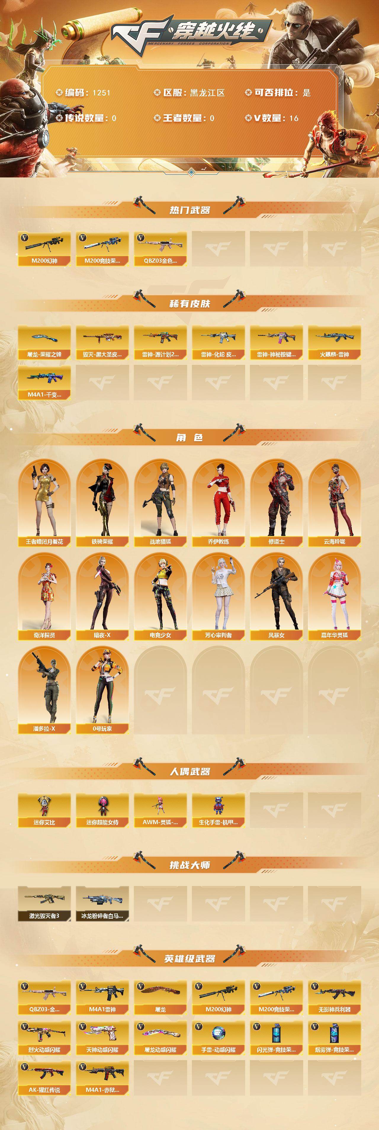 黑龙江区-15v- 【热门武器】:q03-金色蔷薇,m200-幻神,m200-竞技荣光 【皮肤】:雷神-源计划2.0专属 皮肤,雷神-化蛇 皮肤,雷神-神秘按键 皮肤,火麒麟-雷神,毁灭-黑大圣皮肤,m4a1-千变-孔明皮肤,屠龙-荣耀之锋 【角色】:战地猎狐,王者-瞳-闭月羞花,奇洋探员,乔伊教练,修道士,云海玲珑,暗夜-x,电竞少女,芳心审判者,风暴女,嘉年华灵狐,0号玩家,潘多拉-x