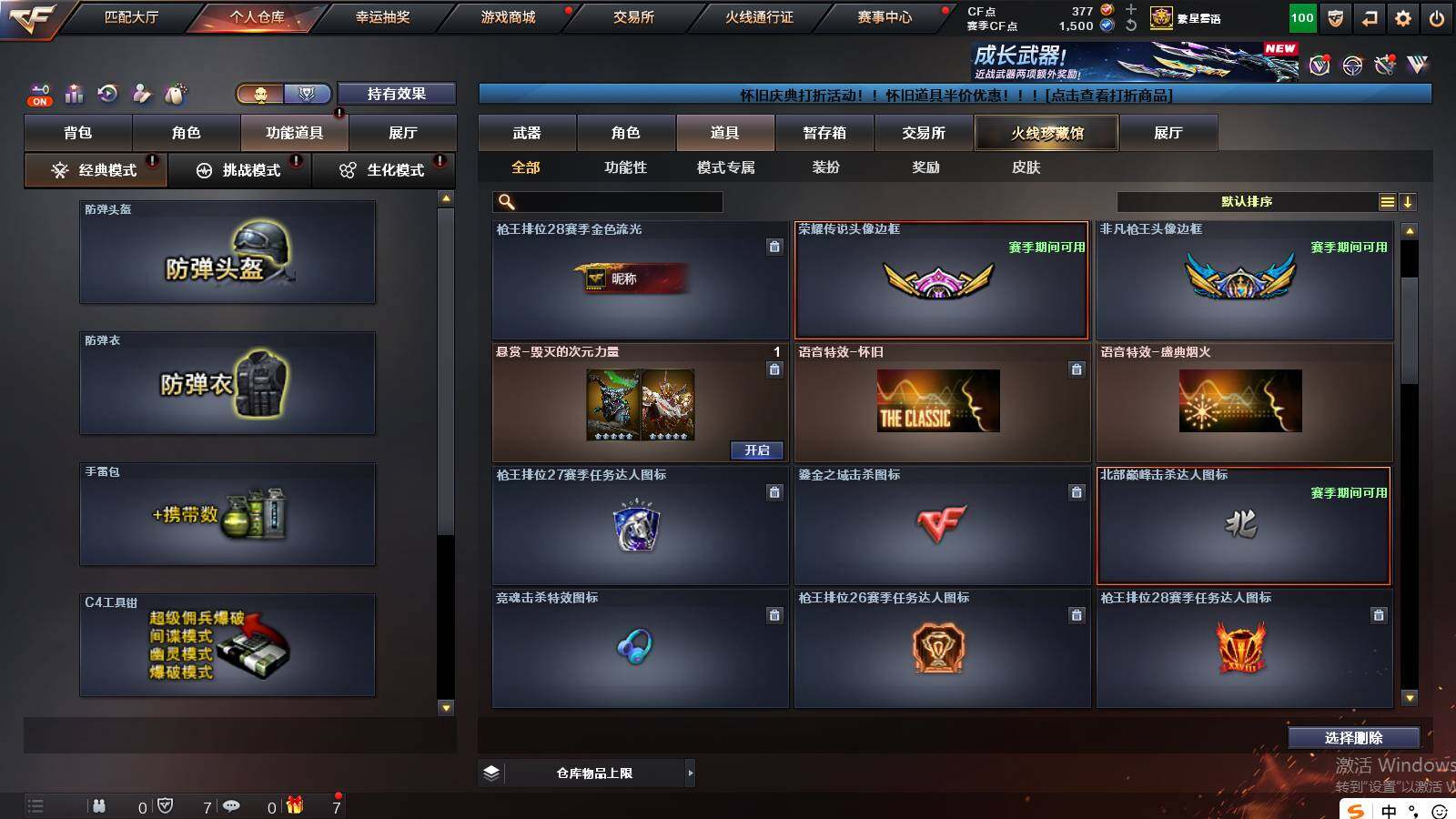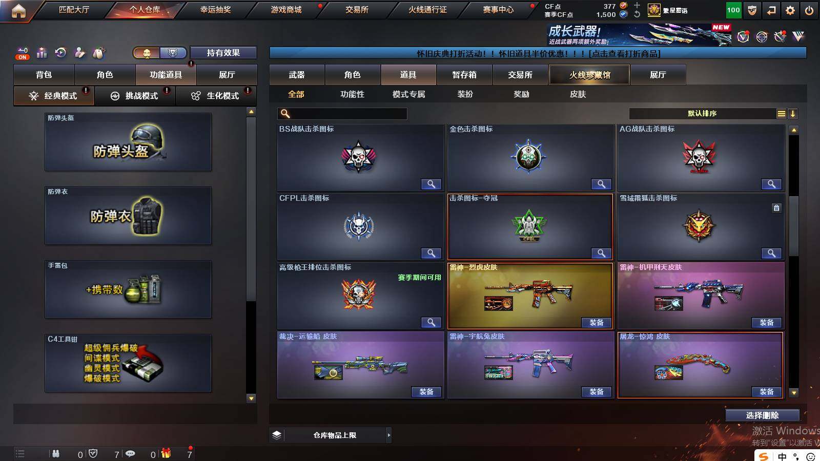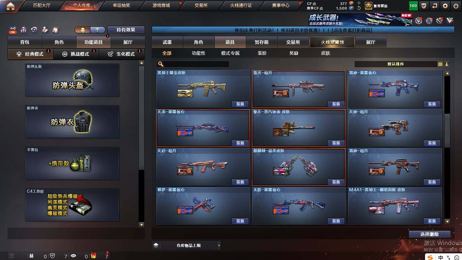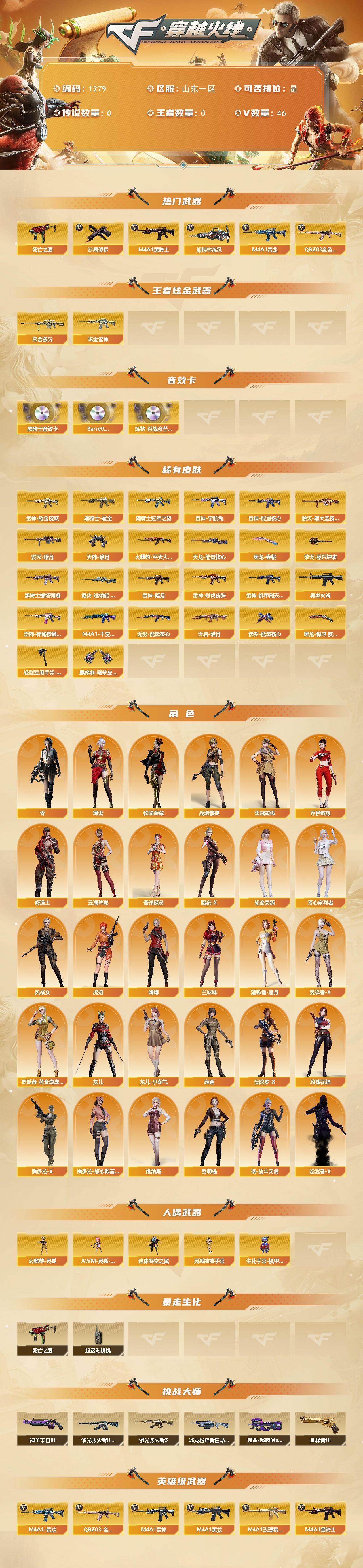 山东一区-36v 【热门武器】:q03-金色蔷薇,m4a1-青龙,死亡之眼2,m4a1-黑骑士,加特林-炼狱,沙鹰-修罗 【王者炫金武器】:炫金雷神,炫金毁灭 【音效卡】:m4a1-黑骑士音效卡,barrett-碧霄极光音效卡,炼狱-百战金芒-庆典舞曲音效卡 【皮肤】:裁决-运输船 皮肤,雷神-暗月,雷神-能量核心,雷神-耀金皮肤,雷神-烈虎皮肤,雷神-机甲刑天皮肤,雷神-宇航兔皮肤,m