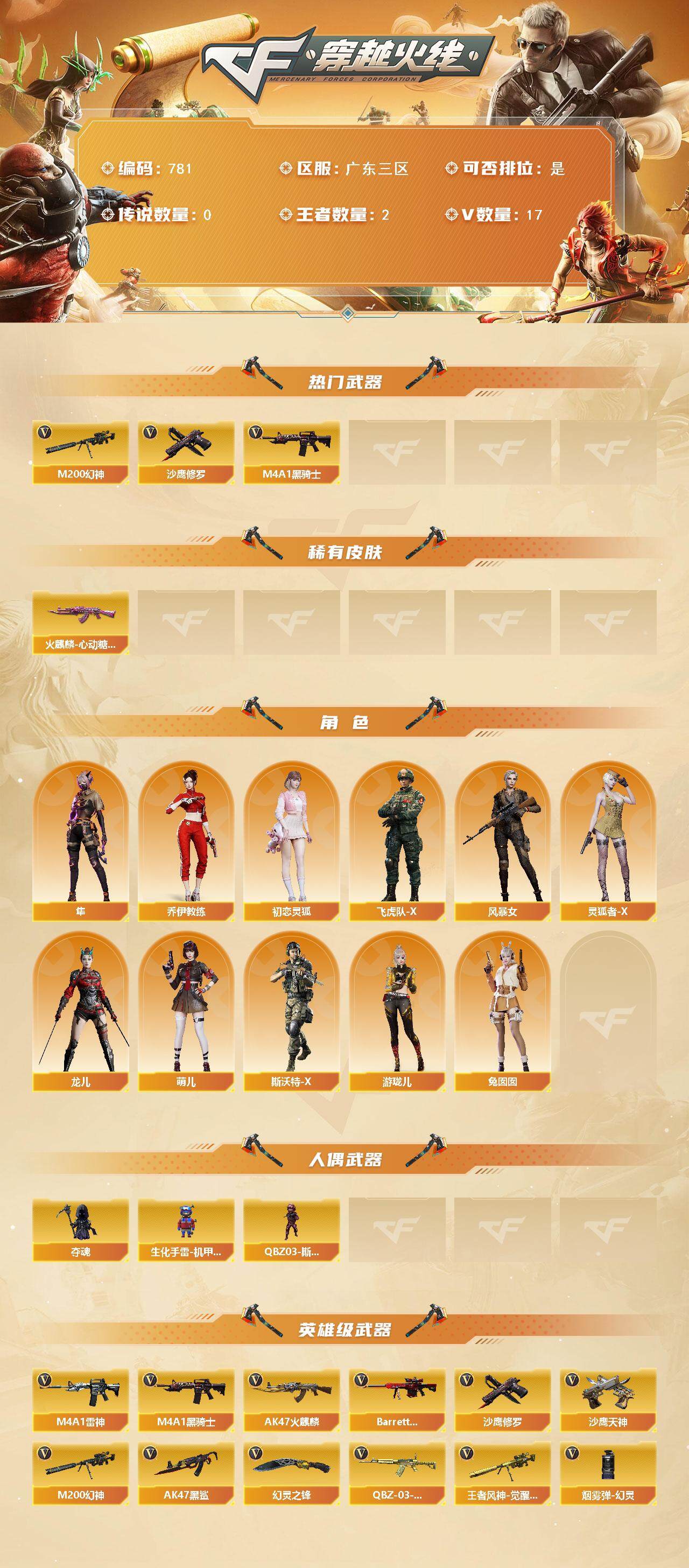 广东三区-17v-2王者-0炫金 【热门武器】:m200-幻神,m4a1-黑骑士,沙鹰-修罗4 【皮肤】:火麒麟-心动糖果 【角色】:隼,乔伊教练,初恋灵狐,飞虎队-x,风暴女,灵狐者-x,龙儿,萌儿,斯沃特-x,兔囡囡,游珑儿 【人偶武器】:夺魂,生化手蕾-机甲核心,q03-斯沃特 【英雄级武器】:ak47-火麒麟,m4a1-雷神,m4a1-黑骑士,ak47-黑鲨,q-03-王者蔷