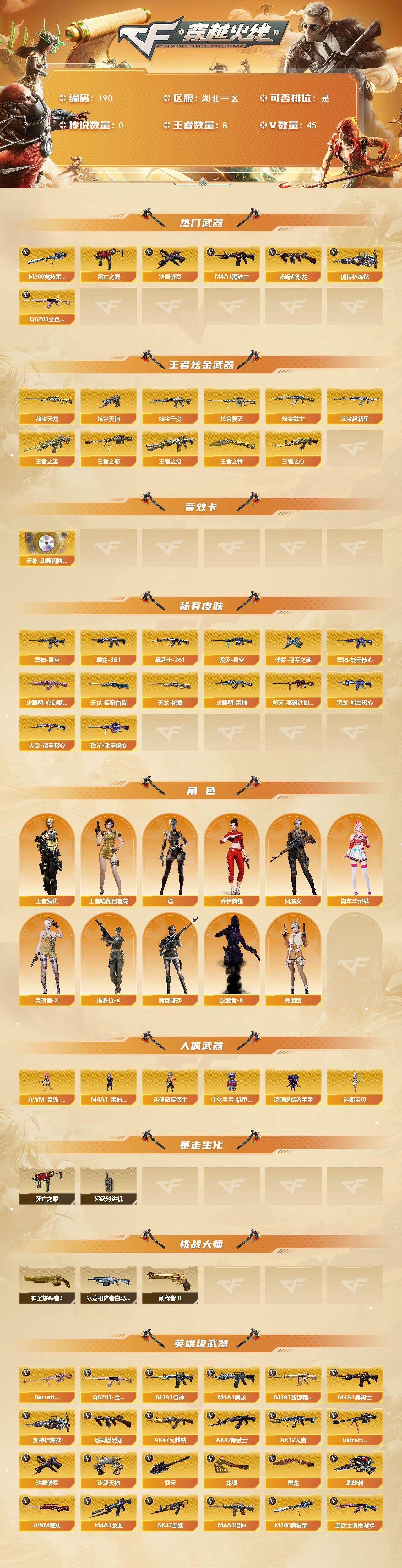 湖北一区-45v-8王者-7炫金 【热门武器】:q03-金色蔷薇2,m200-竞技荣光,死亡之眼,m4a1-黑骑士,汤姆逊-烈龙,加特林-炼狱3,沙鹰-修罗 【王者炫金武器】:王者之圣,王者之幻,王者之心,王者之怒,王者之锋,炫金千变,炫金武士,炫金超新星,炫金毁灭,炫金天龙,炫金天神2 【音效卡】:天神-动感闪耀 音效卡 【皮肤】:雷神-能量核心,雷神-星空,火麒麟-雷神2,火麒