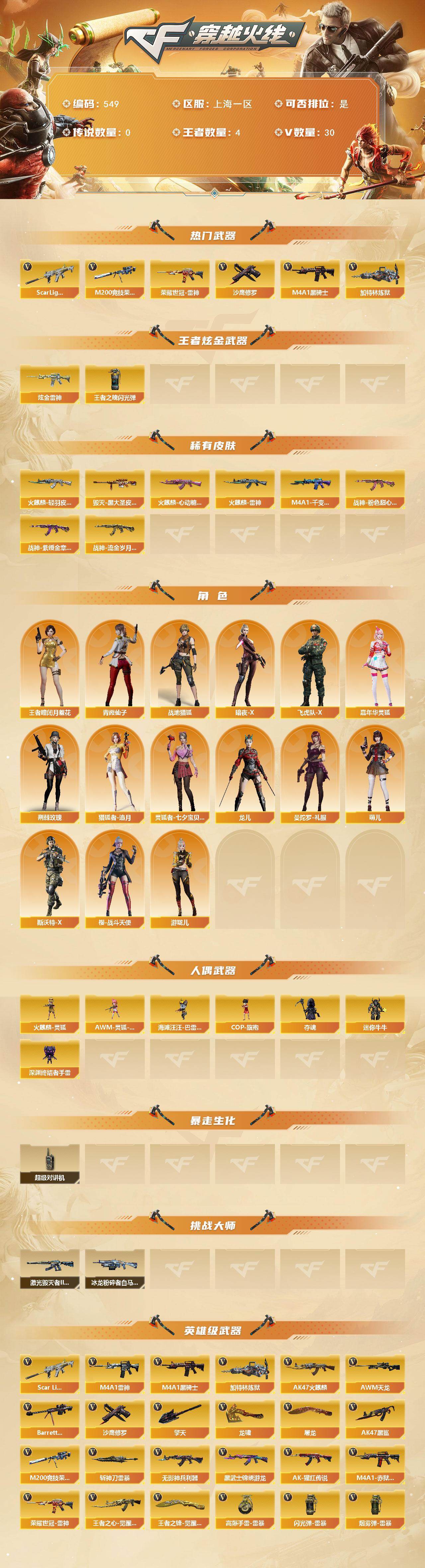 上海一区-30v-4王者-1炫金 【热门武器】:scar light-白虎,m200-竞技荣光,荣耀世冠-雷神,m4a1-黑骑士,加特林-炼狱,沙鹰-修罗2 【王者炫金武器】:炫金雷神,王者之魄闪光丹 【皮肤】:火麒麟-雷神,火麒麟-轻羽皮肤,火麒麟-心动糖果,毁灭-黑大圣皮肤,m4a1-千变-孔明皮肤2,战神-粉色甜心皮肤,战神-紫绶金章皮肤2,战神-流金岁月皮肤 【角色】:战地猎狐,