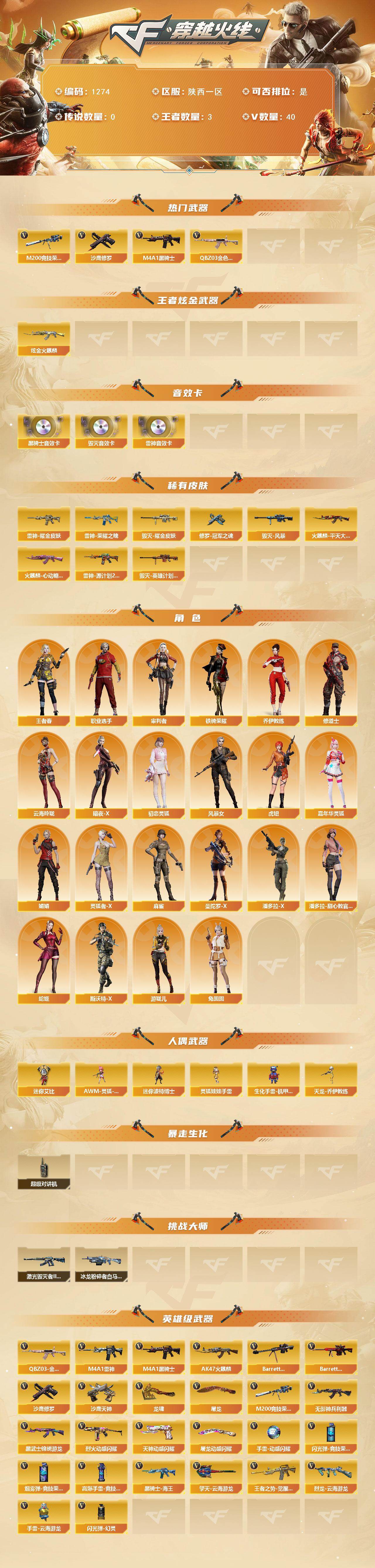 陕西一区-40v-3王者-1炫金 【热门武器】:q03-金色蔷薇2,m200-竞技荣光,m4a1-黑骑士,沙鹰-修罗4 【王者炫金武器】:炫金火麒麟 【音效卡】:m4a1-雷神音效卡,m4a1-黑骑士音效卡,barrett-毁灭音效卡 【皮肤】:雷神-荣耀之魄,雷神-耀金皮肤,雷神-源计划2.0专属 皮肤,火麒麟-平天大圣,火麒麟-心动糖果,毁灭耀金皮肤,毁灭-风暴,毁灭-英雄计划 皮