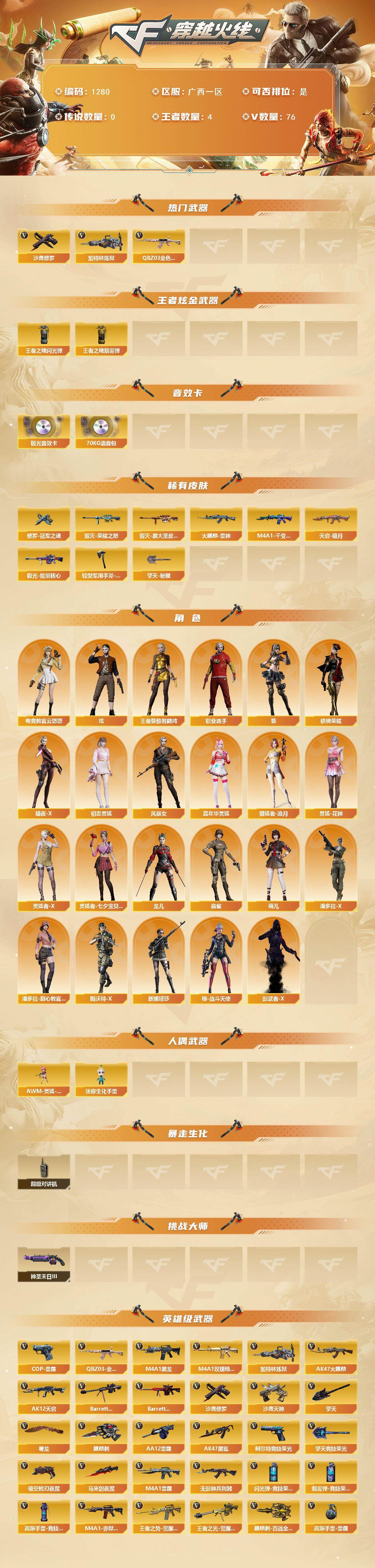 广西一区-76v-4王者-0炫金 【热门武器】:q03-金色蔷薇,加特林-炼狱,沙鹰-修罗3 【王者炫金武器】:王者之魄闪光丹,王者之魄盐雾蛋 【音效卡】:barrett-极光音效卡,70kg语音包 【皮肤】:火麒麟-雷神,毁灭-荣耀之怒,毁灭-黑大圣皮肤,m4a1-千变-孔明皮肤,天启-暗月,极光-能量核心,修罗-冠军之魂,轻型军用手斧-再燃火线,擎天-秘银 【角色】:葵,炫,电竞教官