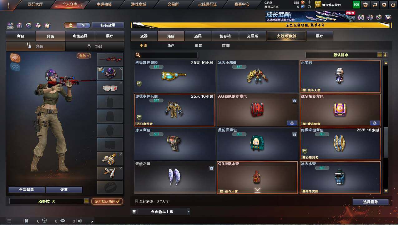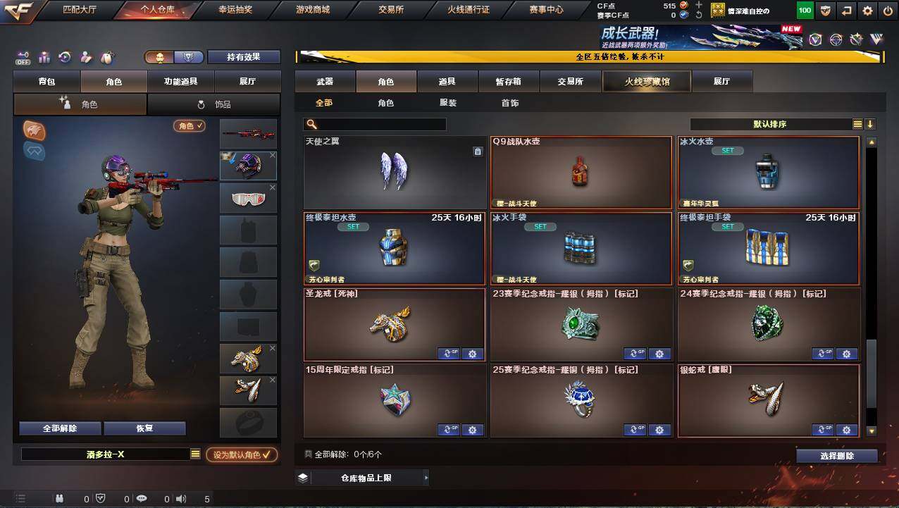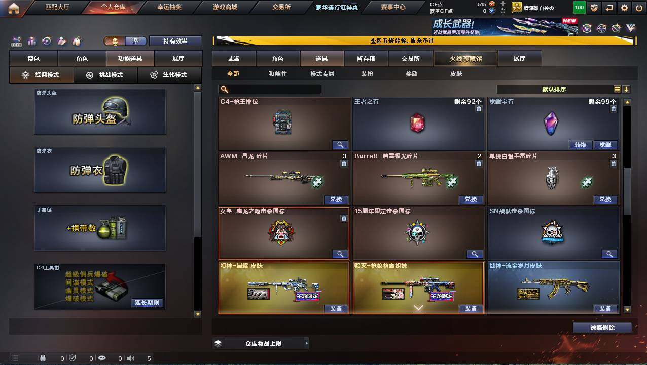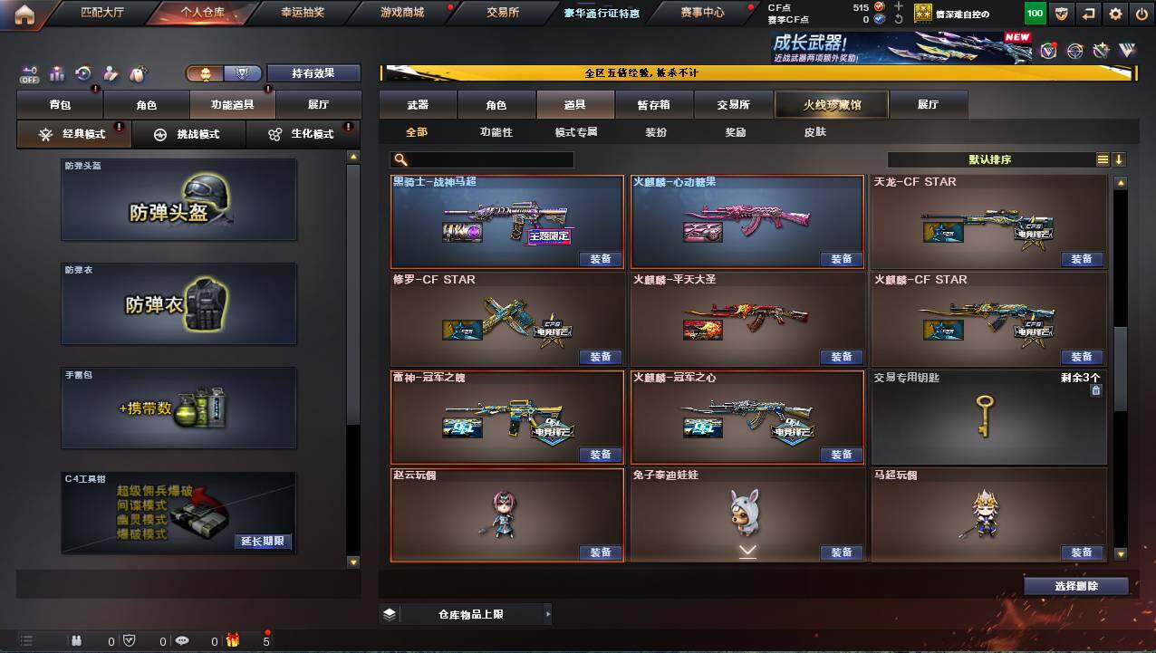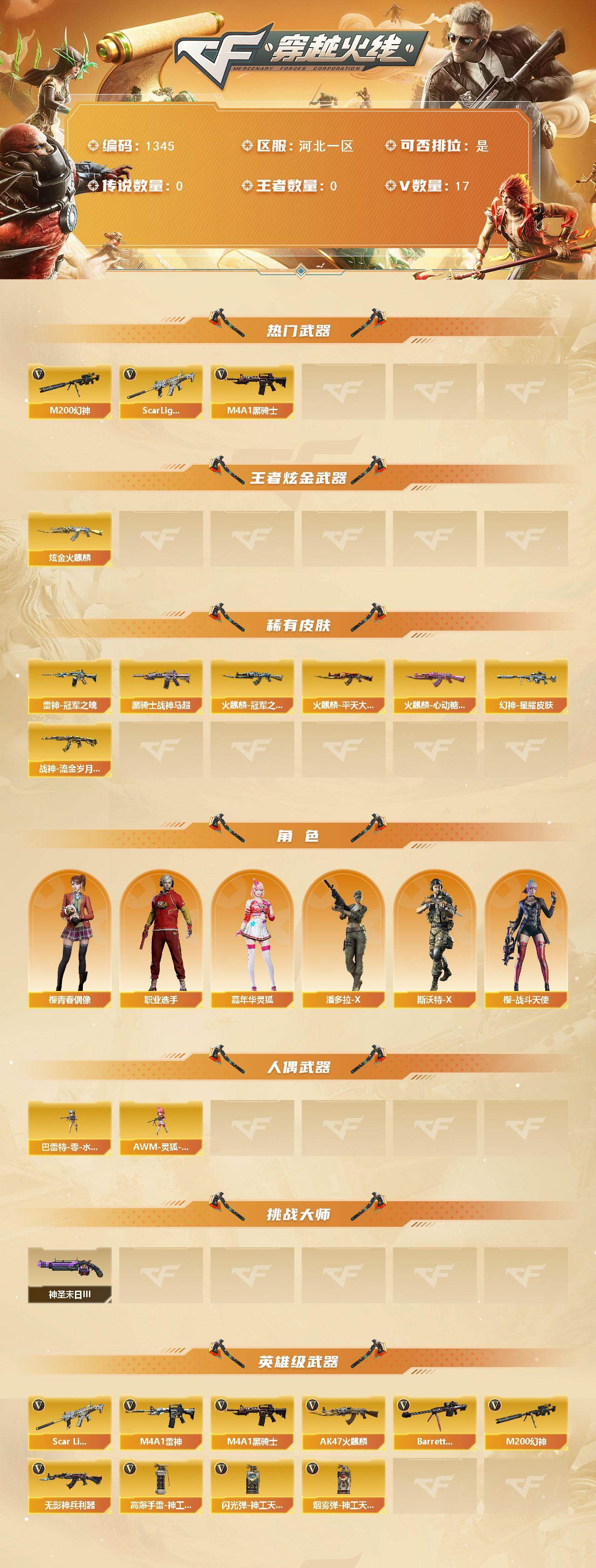 河北一区-17v-1炫金 【热门武器】:scar light-白虎,m200-幻神,m4a1-黑骑士 【王者炫金武器】:炫金火麒麟 【皮肤】:幻神-星耀 皮肤,雷神-冠军之魄,火麒麟-冠军之心,火麒麟-平天大圣,火麒麟-心动糖果,黑骑士-战神马超,战神-流金岁月皮肤 【角色】:嘉年华灵狐,潘多拉-x,斯沃特-x,樱-青春偶像,樱-战斗天使,职业选手 【人偶武器】:芭蕾特-零-水下丽影,awm-