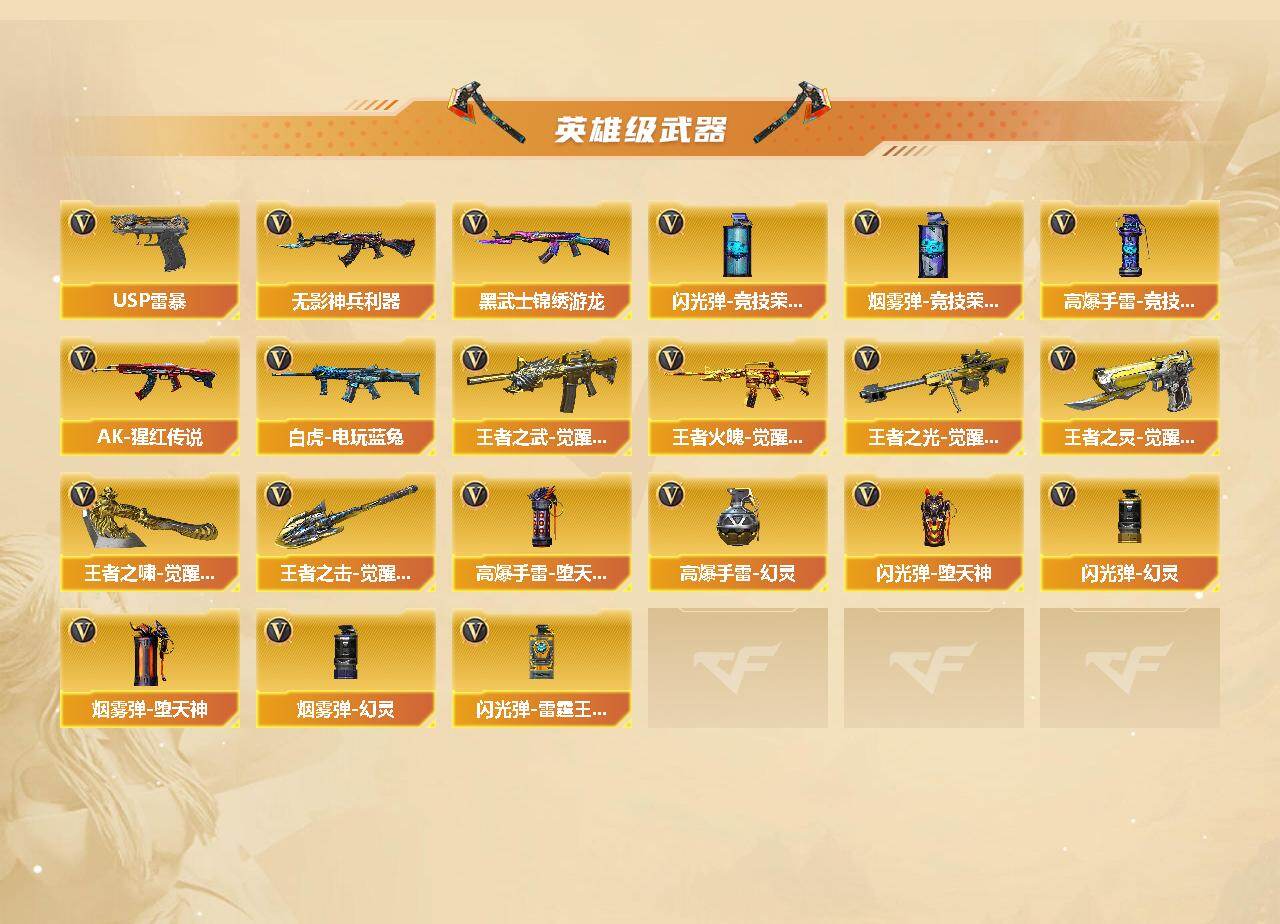 河北一区-71v-11王者-1炫金 【热门武器】:m200-幻神,m200-竞技荣光,死亡之眼,白虎-电玩蓝兔,炼狱-迷你小钢,usp-雷暴,金刚伞 【王者炫金武器】:王者霜心,炫金超新星 【音效卡】:barrett-极光音效卡 【皮肤】:m200-幻神-黄忠皮肤,雷神-荣耀之魄,雷神-荣耀世冠ag,火麒麟-雷神,火麒麟-华夏之心,火麒麟-心动糖果,ak47-火麒麟-百城23冠军皮肤,毁灭-荣